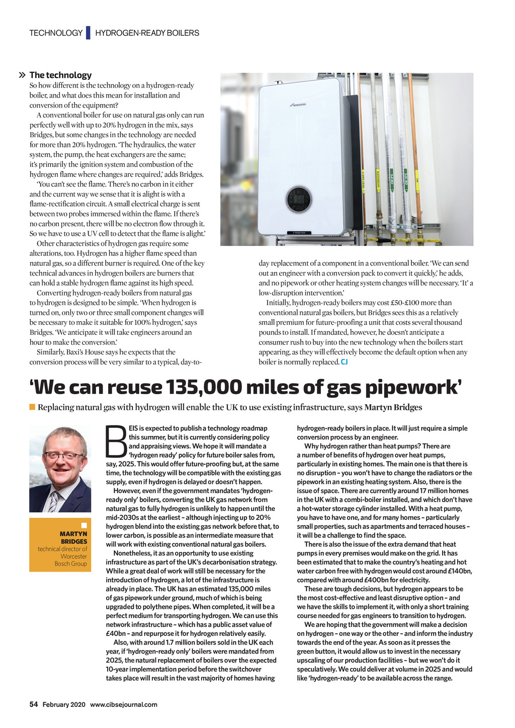 TECHNOLOGY | HYDROGEN-READY BOILERS The technology So how different is the technology on a hydrogen-ready boiler, and what does this mean for installation and conversion of the equipment? A conventional boiler for use on natural gas only can run perfectly well with up to 20% hydrogen in the mix, says Bridges, but some changes in the technology are needed for more than 20% hydrogen. The hydraulics, the water system, the pump, the heat exchangers are the same; its primarily the ignition system and combustion of the hydrogen flame where changes are required, adds Bridges. You cant see the flame. Theres no carbon in it either and the current way we sense that it is alight is with a flame-rectification circuit. A small electrical charge is sent between two probes immersed within the flame. If theres no carbon present, there will be no electron flow through it. So we have to use a UV cell to detect that the flame is alight. Other characteristics of hydrogen gas require some alterations, too. Hydrogen has a higher flame speed than natural gas, so a different burner is required. One of the key technical advances in hydrogen boilers are burners that can hold a stable hydrogen flame against its high speed. Converting hydrogen-ready boilers from natural gas to hydrogen is designed to be simple. When hydrogen is turned on, only two or three small component changes will be necessary to make it suitable for 100% hydrogen, says Bridges. We anticipate it will take engineers around an hour to make the conversion. Similarly, Baxis House says he expects that the conversion process will be very similar to a typical, day-to- day replacement of a component in a conventional boiler. We can send out an engineer with a conversion pack to convert it quickly, he adds, and no pipework or other heating system changes will be necessary. It a low-disruption intervention. Initially, hydrogen-ready boilers may cost 50-100 more than conventional natural gas boilers, but Bridges sees this as a relatively small premium for future-proofing a unit that costs several thousand pounds to install. If mandated, however, he doesnt anticipate a consumer rush to buy into the new technology when the boilers start appearing, as they will effectively become the default option when any boiler is normally replaced. CJ We can reuse 135,000 miles of gas pipework Replacing natural gas with hydrogen will enable the UK to use existing infrastructure, says Martyn Bridges B MARTYN BRIDGES technical director of Worcester Bosch Group EIS is expected to publish a technology roadmap this summer, but it is currently considering policy and appraising views. We hope it will mandate a hydrogen ready policy for future boiler sales from, say, 2025. This would offer future-proofing but, at the same time, the technology will be compatible with the existing gas supply, even if hydrogen is delayed or doesnt happen. However, even if the government mandates hydrogenready only boilers, converting the UK gas network from natural gas to fully hydrogen is unlikely to happen until the mid-2030s at the earliest although injecting up to 20% hydrogen blend into the existing gas network before that, to lower carbon, is possible as an intermediate measure that will work with existing conventional natural gas boilers. Nonetheless, it as an opportunity to use existing infrastructure as part of the UKs decarbonisation strategy. While a great deal of work will still be necessary for the introduction of hydrogen, a lot of the infrastructure is already in place. The UK has an estimated 135,000 miles of gas pipework under ground, much of which is being upgraded to polythene pipes. When completed, it will be a perfect medium for transporting hydrogen. We can use this network infrastructure which has a public asset value of 40bn and repurpose it for hydrogen relatively easily. Also, with around 1.7 million boilers sold in the UK each year, if hydrogen-ready only boilers were mandated from 2025, the natural replacement of boilers over the expected 10-year implementation period before the switchover takes place will result in the vast majority of homes having hydrogen-ready boilers in place. It will just require a simple conversion process by an engineer. Why hydrogen rather than heat pumps? There are a number of benefits of hydrogen over heat pumps, particularly in existing homes. The main one is that there is no disruption you wont have to change the radiators or the pipework in an existing heating system. Also, there is the issue of space. There are currently around 17 million homes in the UK with a combi-boiler installed, and which dont have a hot-water storage cylinder installed. With a heat pump, you have to have one, and for many homes particularly small properties, such as apartments and terraced houses it will be a challenge to find the space. There is also the issue of the extra demand that heat pumps in every premises would make on the grid. It has been estimated that to make the countrys heating and hot water carbon free with hydrogen would cost around 140bn, compared with around 400bn for electricity. These are tough decisions, but hydrogen appears to be the most cost-effective and least disruptive option and we have the skills to implement it, with only a short training course needed for gas engineers to transition to hydrogen. We are hoping that the government will make a decision on hydrogen one way or the other and inform the industry towards the end of the year. As soon as it presses the green button, it would allow us to invest in the necessary upscaling of our production facilities but we wont do it speculatively. We could deliver at volume in 2025 and would like hydrogen-ready to be available across the range. 54 February 2020 www.cibsejournal.com CIBSE Feb20 pp53-54 Hydrogen boilers.indd 54 24/01/2020 15:09