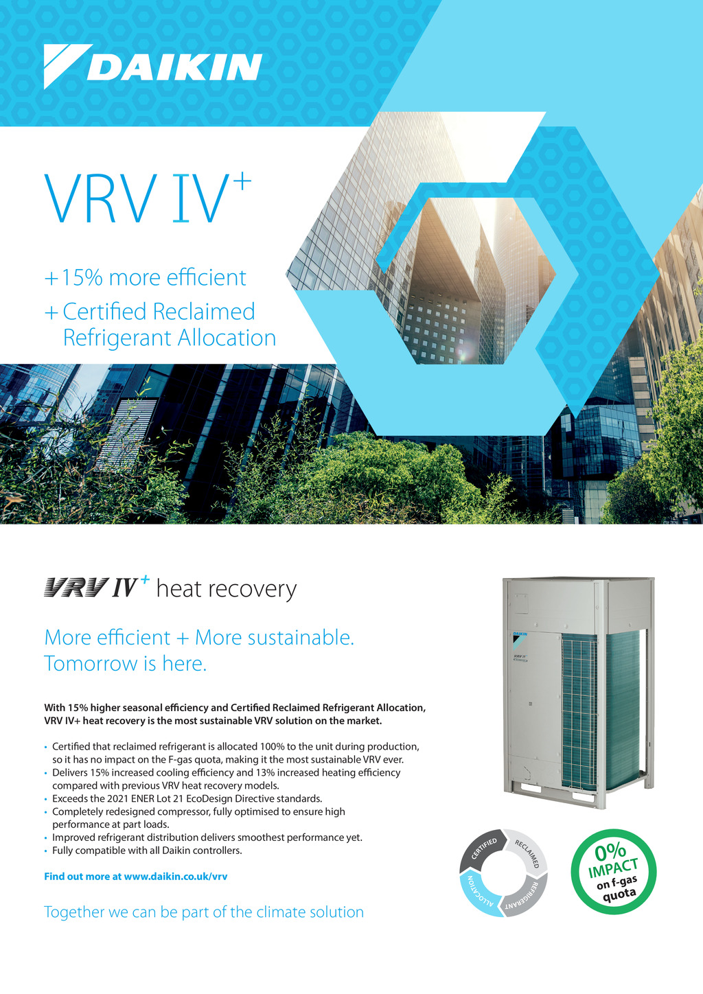 VRV IV + +15% more ecient + Certied Reclaimed Refrigerant Allocation heat recovery More ecient + More sustainable. Tomorrow is here. With 15% higher seasonal efficiency and Certified Reclaimed Refrigerant Allocation, VRV IV+ heat recovery is the most sustainable VRV solution on the market. Certified that reclaimed refrigerant is allocated 100% to the unit during production, so it has no impact on the F-gas quota, making it the most sustainable VRV ever. Delivers 15% increased cooling efficiency and 13% increased heating efficiency compared with previous VRV heat recovery models. Exceeds the 2021 ENER Lot 21 EcoDesign Directive standards. Completely redesigned compressor, fully optimised to ensure high performance at part loads. Improved refrigerant distribution delivers smoothest performance yet. Fully compatible with all Daikin controllers. Find out more at www.daikin.co.uk/vrv 0% ACT IMP -gas on f quota Together we can be part of the climate solution 56 February 2020 www.cibsejournal.com p56.CIBSEMagFEB20.indd 56 23/01/2020 11:28