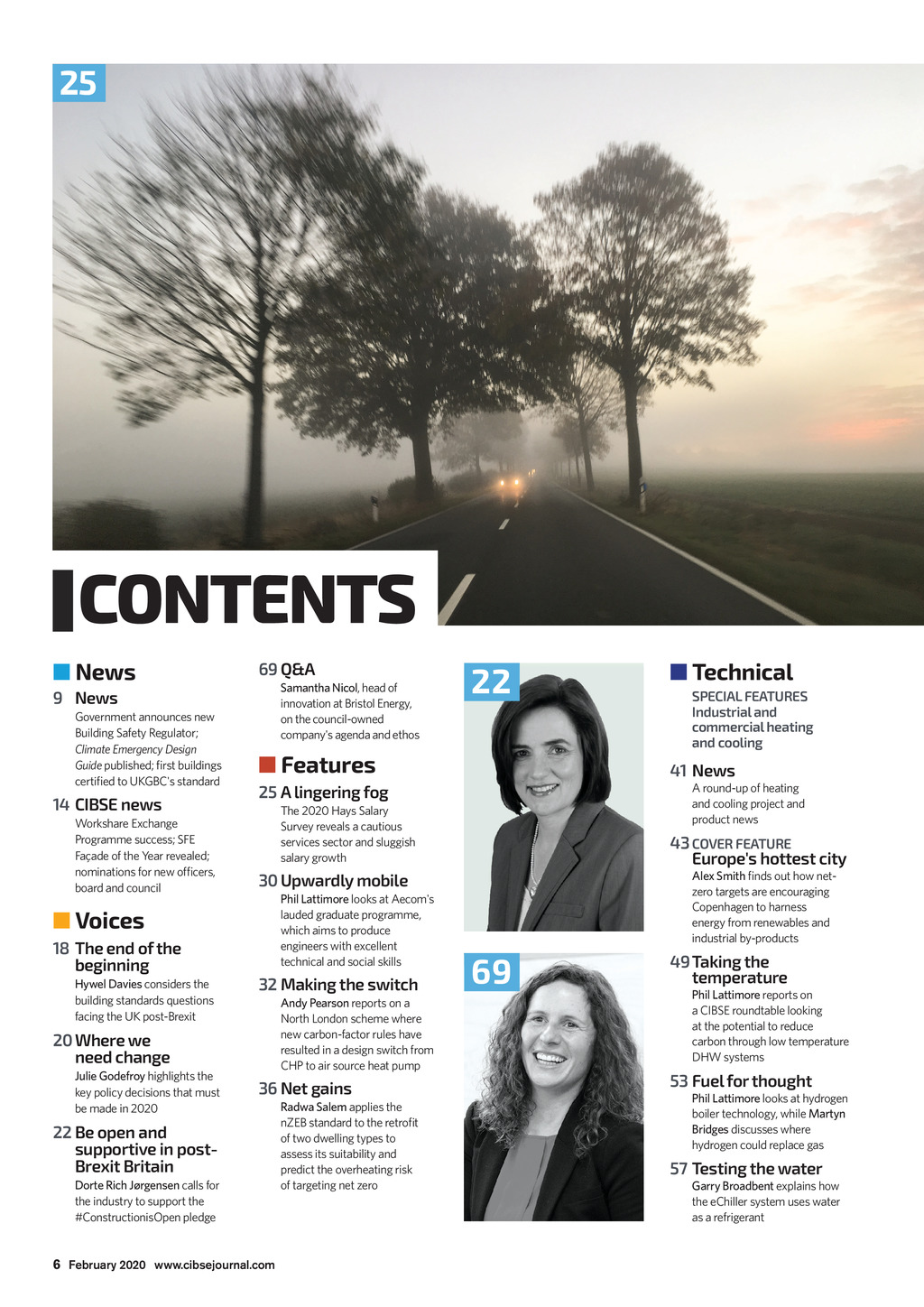 5 CONTENTS News 69 Q&A Samantha Nicol, head of innovation at Bristol Energy, on the council-owned company s agenda and ethos 9 News Government announces new Building Safety Regulator; Climate Emergency Design Guide published; rst buildings certied to UKGBC s standard 14 CIBSE news Workshare Exchange Programme success; SFE Faade of the Year revealed; nominations for new ofcers, board and council Features Hywel Davies considers the building standards questions facing the UK post-Brexit Andy Pearson reports on a North London scheme where new carbon-factor rules have resulted in a design switch from CHP to air source heat pump 20 Where we need change Julie Godefroy highlights the key policy decisions that must be made in 2020 43 COVER FEATURE Europe s hottest city Alex Smith nds out how netzero targets are encouraging Copenhagen to harness energy from renewables and industrial by-products 30 Upwardly mobile 32 Making the switch 36 Net gains 22 Be open and supportive in postBrexit Britain Dorte Rich Jrgensen calls for the industry to support the #ConstructionisOpen pledge Radwa Salem applies the nZEB standard to the retrot of two dwelling types to assess its suitability and predict the overheating risk of targeting net zero SPECIAL FEATURES Industrial and commercial heating and cooling A round-up of heating and cooling project and product news The 2020 Hays Salary Survey reveals a cautious services sector and sluggish salary growth Phil Lattimore looks at Aecom s lauded graduate programme, which aims to produce engineers with excellent technical and social skills Technical 41 News 25 A lingering fog Voices 18 The end of the beginning 22 69 49 Taking the temperature Phil Lattimore reports on a CIBSE roundtable looking at the potential to reduce carbon through low temperature DHW systems 53 Fuel for thought Phil Lattimore looks at hydrogen boiler technology, while Martyn Bridges discusses where hydrogen could replace gas 57 Testing the water Garry Broadbent explains how the eChiller system uses water as a refrigerant 6 February 2020 www.cibsejournal.com CIBSE Feb20 pp06-07 Contents.indd 6 24/01/2020 15:28
