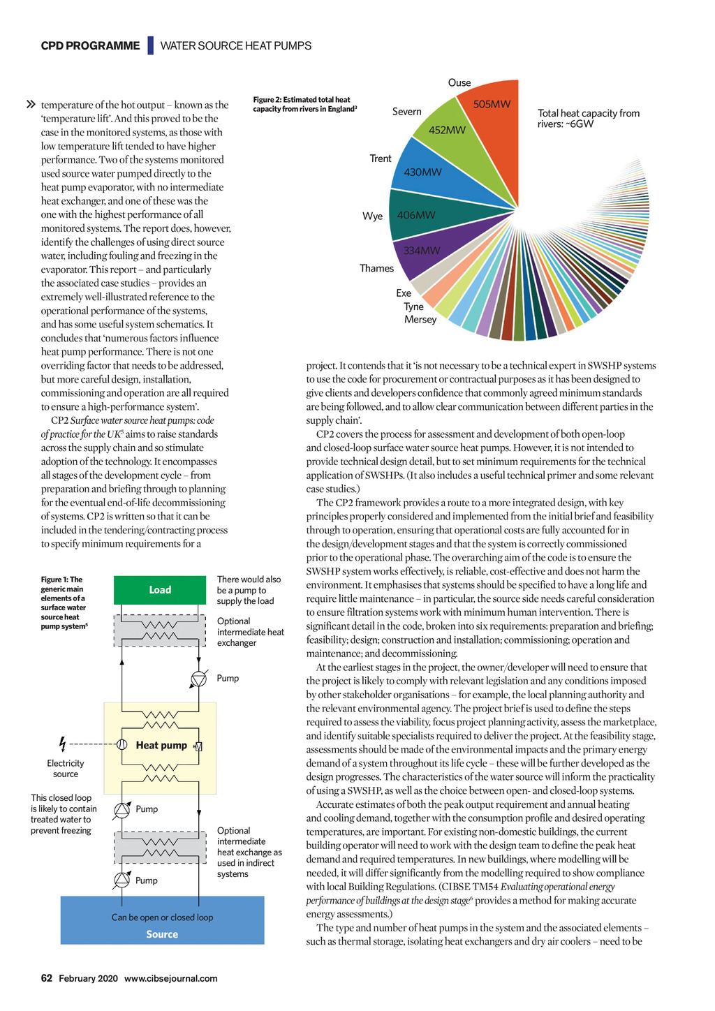 CPD PROGRAMME | WATER SOURCE HEAT PUMPS Ouse temperature of the hot output known as the temperature lift. And this proved to be the case in the monitored systems, as those with low temperature lift tended to have higher performance. Two of the systems monitored used source water pumped directly to the heat pump evaporator, with no intermediate heat exchanger, and one of these was the one with the highest performance of all monitored systems. The report does, however, identify the challenges of using direct source water, including fouling and freezing in the evaporator. This report and particularly the associated case studies provides an extremely well-illustrated reference to the operational performance of the systems, and has some useful system schematics. It concludes that numerous factors influence heat pump performance. There is not one overriding factor that needs to be addressed, but more careful design, installation, commissioning and operation are all required to ensure a high-performance system. CP2 Surface water source heat pumps: code of practice for the UK5 aims to raise standards across the supply chain and so stimulate adoption of the technology. It encompasses all stages of the development cycle from preparation and briefing through to planning for the eventual end-of-life decommissioning of systems. CP2 is written so that it can be included in the tendering/contracting process to specify minimum requirements for a Figure 1: The generic main elements of a surface water source heat pump system5 Load Figure 2: Estimated total heat capacity from rivers in England3 There would also be a pump to supply the load Optional intermediate heat exchanger Pump Heat pump Electricity source This closed loop is likely to contain treated water to prevent freezing Pump Pump Optional intermediate heat exchange as used in indirect systems Can be open or closed loop Source 505MW Severn 452MW Total heat capacity from rivers: 6GW Trent 430MW Wye 406MW 334MW Thames Exe Tyne Mersey project. It contends that it is not necessary to be a technical expert in SWSHP systems to use the code for procurement or contractual purposes as it has been designed to give clients and developers confidence that commonly agreed minimum standards are being followed, and to allow clear communication between different parties in the supply chain. CP2 covers the process for assessment and development of both open-loop and closed-loop surface water source heat pumps. However, it is not intended to provide technical design detail, but to set minimum requirements for the technical application of SWSHPs. (It also includes a useful technical primer and some relevant case studies.) The CP2 framework provides a route to a more integrated design, with key principles properly considered and implemented from the initial brief and feasibility through to operation, ensuring that operational costs are fully accounted for in the design/development stages and that the system is correctly commissioned prior to the operational phase. The overarching aim of the code is to ensure the SWSHP system works effectively, is reliable, cost-effective and does not harm the environment. It emphasises that systems should be specified to have a long life and require little maintenance in particular, the source side needs careful consideration to ensure filtration systems work with minimum human intervention. There is significant detail in the code, broken into six requirements: preparation and briefing; feasibility; design; construction and installation; commissioning; operation and maintenance; and decommissioning. At the earliest stages in the project, the owner/developer will need to ensure that the project is likely to comply with relevant legislation and any conditions imposed by other stakeholder organisations for example, the local planning authority and the relevant environmental agency. The project brief is used to define the steps required to assess the viability, focus project planning activity, assess the marketplace, and identify suitable specialists required to deliver the project. At the feasibility stage, assessments should be made of the environmental impacts and the primary energy demand of a system throughout its life cycle these will be further developed as the design progresses. The characteristics of the water source will inform the practicality of using a SWSHP, as well as the choice between open- and closed-loop systems. Accurate estimates of both the peak output requirement and annual heating and cooling demand, together with the consumption profile and desired operating temperatures, are important. For existing non-domestic buildings, the current building operator will need to work with the design team to define the peak heat demand and required temperatures. In new buildings, where modelling will be needed, it will differ significantly from the modelling required to show compliance with local Building Regulations. (CIBSE TM54 Evaluating operational energy performance of buildings at the design stage6 provides a method for making accurate energy assessments.) The type and number of heat pumps in the system and the associated elements such as thermal storage, isolating heat exchangers and dry air coolers need to be 62 February 2020 www.cibsejournal.com CIBSE Feb20 pp61-64 CPD v3.indd 62 24/01/2020 15:13