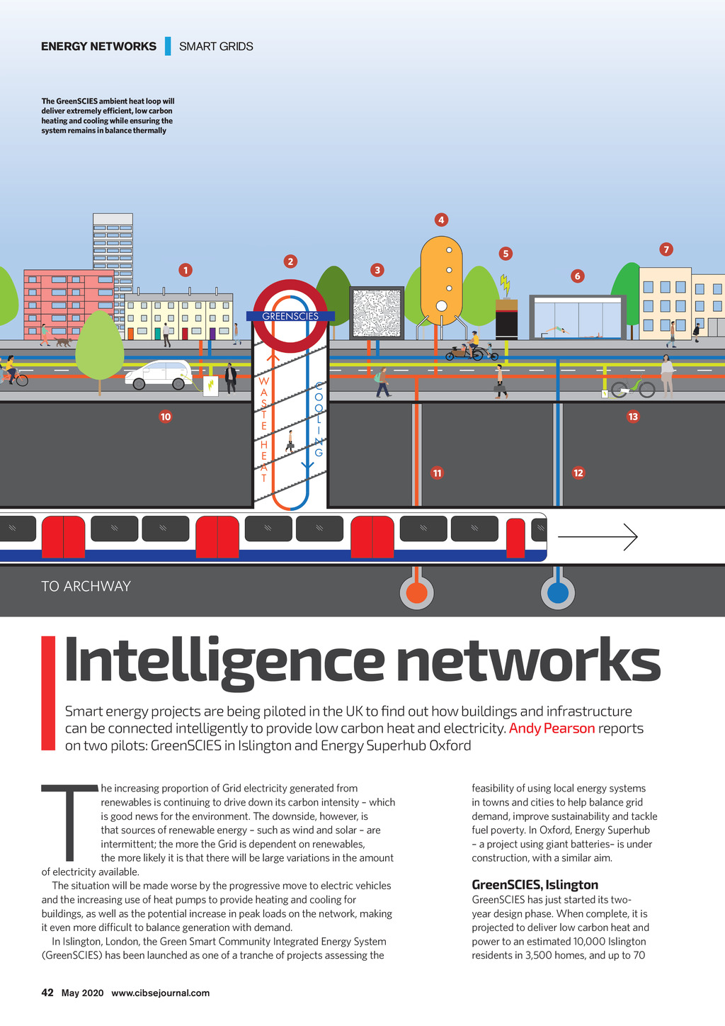 ENERGY NETWORKS | SMART GRIDS The GreenSCIES ambient heat loop will deliver extremely efficient, low carbon heating and cooling while ensuring the system remains in balance thermally TO ARCHWAY Intelligence networks Smart energy projects are being piloted in the UK to find out how buildings and infrastructure can be connected intelligently to provide low carbon heat and electricity. Andy Pearson reports on two pilots: GreenSCIES in Islington and Energy Superhub Oxford T he increasing proportion of Grid electricity generated from renewables is continuing to drive down its carbon intensity which is good news for the environment. The downside, however, is that sources of renewable energy such as wind and solar are intermittent; the more the Grid is dependent on renewables, the more likely it is that there will be large variations in the amount of electricity available. The situation will be made worse by the progressive move to electric vehicles and the increasing use of heat pumps to provide heating and cooling for buildings, as well as the potential increase in peak loads on the network, making it even more difficult to balance generation with demand. In Islington, London, the Green Smart Community Integrated Energy System (GreenSCIES) has been launched as one of a tranche of projects assessing the feasibility of using local energy systems in towns and cities to help balance grid demand, improve sustainability and tackle fuel poverty. In Oxford, Energy Superhub a project using giant batteries is under construction, with a similar aim. GreenSCIES, Islington GreenSCIES has just started its twoyear design phase. When complete, it is projected to deliver low carbon heat and power to an estimated 10,000 Islington residents in 3,500 homes, and up to 70 42 May 2020 www.cibsejournal.com CIBSE May20 pp42-44 Supp Energy network pilots.indd 42 24/04/2020 16:34