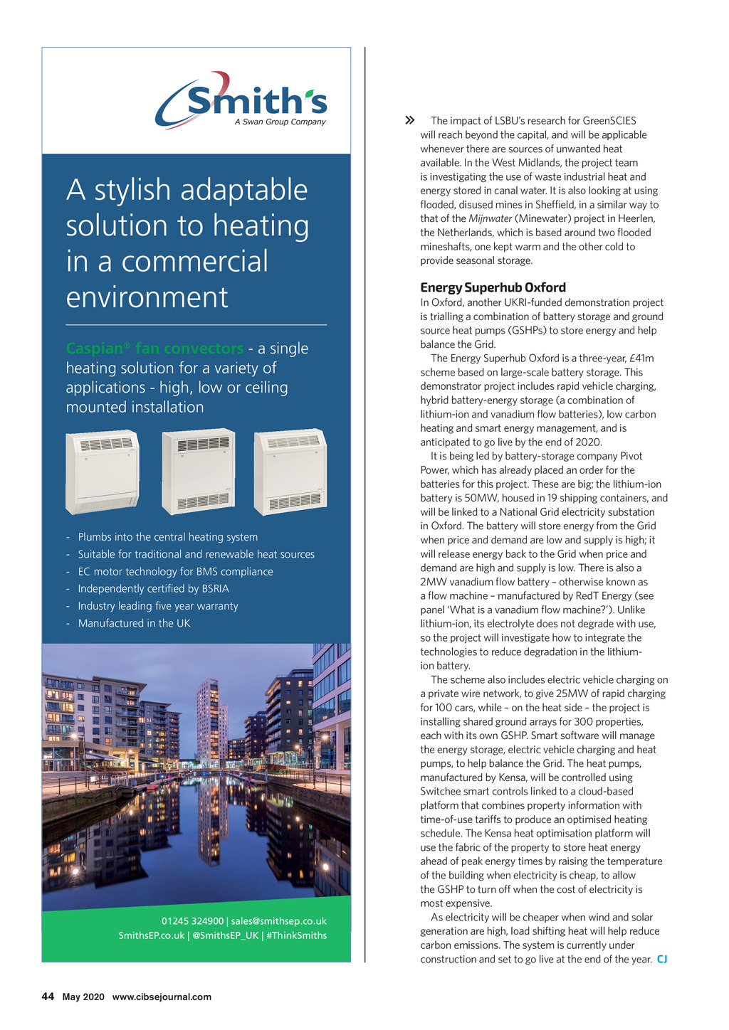 A stylish adaptable solution to heating in a commercial environment Caspian fan convectors - a single heating solution for a variety of applications - high, low or ceiling mounted installation - Plumbs into the central heating system - Suitable for traditional and renewable heat sources - EC motor technology for BMS compliance - Independently certified by BSRIA - Industry leading five year warranty - Manufactured in the UK 01245 324900 | sales@smithsep.co.uk SmithsEP.co.uk | @SmithsEP_UK | #ThinkSmiths The impact of LSBUs research for GreenSCIES will reach beyond the capital, and will be applicable whenever there are sources of unwanted heat available. In the West Midlands, the project team is investigating the use of waste industrial heat and energy stored in canal water. It is also looking at using flooded, disused mines in Sheffield, in a similar way to that of the Mijnwater (Minewater) project in Heerlen, the Netherlands, which is based around two flooded mineshafts, one kept warm and the other cold to provide seasonal storage. Energy Superhub Oxford In Oxford, another UKRI-funded demonstration project is trialling a combination of battery storage and ground source heat pumps (GSHPs) to store energy and help balance the Grid. The Energy Superhub Oxford is a three-year, 41m scheme based on large-scale battery storage. This demonstrator project includes rapid vehicle charging, hybrid battery-energy storage (a combination of lithium-ion and vanadium flow batteries), low carbon heating and smart energy management, and is anticipated to go live by the end of 2020. It is being led by battery-storage company Pivot Power, which has already placed an order for the batteries for this project. These are big; the lithium-ion battery is 50MW, housed in 19 shipping containers, and will be linked to a National Grid electricity substation in Oxford. The battery will store energy from the Grid when price and demand are low and supply is high; it will release energy back to the Grid when price and demand are high and supply is low. There is also a 2MW vanadium flow battery otherwise known as a flow machine manufactured by RedT Energy (see panel What is a vanadium flow machine?). Unlike lithium-ion, its electrolyte does not degrade with use, so the project will investigate how to integrate the technologies to reduce degradation in the lithiumion battery. The scheme also includes electric vehicle charging on a private wire network, to give 25MW of rapid charging for 100 cars, while on the heat side the project is installing shared ground arrays for 300 properties, each with its own GSHP. Smart software will manage the energy storage, electric vehicle charging and heat pumps, to help balance the Grid. The heat pumps, manufactured by Kensa, will be controlled using Switchee smart controls linked to a cloud-based platform that combines property information with time-of-use tariffs to produce an optimised heating schedule. The Kensa heat optimisation platform will use the fabric of the property to store heat energy ahead of peak energy times by raising the temperature of the building when electricity is cheap, to allow the GSHP to turn off when the cost of electricity is most expensive. As electricity will be cheaper when wind and solar generation are high, load shifting heat will help reduce carbon emissions. The system is currently under construction and set to go live at the end of the year. CJ 44 May 2020 www.cibsejournal.com CIBSE May20 pp42-44 Supp Energy network pilots.indd 44 24/04/2020 16:34