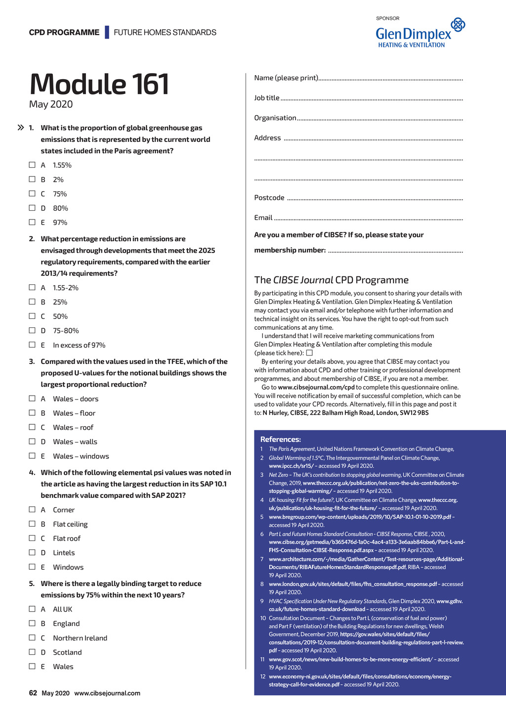 SPONSOR CPD PROGRAMME | FUTURE HOMES STANDARDS Module 161 May 2020 Name (please print)......................................................................................... Job title................................................................................................................ Organisation...................................................................................................... 1.What is the proportion of global greenhouse gas emissions that is represented by the current world states included in the Paris agreement? A 1.55% B 2% C 75% D Address .............................................................................................................. ............................................................................................................................... ............................................................................................................................... Postcode ............................................................................................................ 80% E 97% 2.What percentage reduction in emissions are envisaged through developments that meet the 2025 Email .................................................................................................................... Are you a member of CIBSE? If so, please state your membership number: ................................................................................... regulatory requirements, compared with the earlier 2013/14 requirements? A 1.55-2% B 25% C 50% D 75-80% E In excess of 97% 3.Compared with the values used in the TFEE, which of the proposed U-values for the notional buildings shows the largest proportional reduction? A Wales doors B Wales floor The CIBSE Journal CPD Programme By participating in this CPD module, you consent to sharing your details with Glen Dimplex Heating & Ventilation. Glen Dimplex Heating & Ventilation may contact you via email and/or telephone with further information and technical insight on its services. You have the right to opt-out from such communications at any time. I understand that I will receive marketing communications from Glen Dimplex Heating & Ventilation after completing this module (please tick here): By entering your details above, you agree that CIBSE may contact you with information about CPD and other training or professional development programmes, and about membership of CIBSE, if you are not a member. Go to www.cibsejournal.com/cpd to complete this questionnaire online. You will receive notification by email of successful completion, which can be used to validate your CPD records. Alternatively, fill in this page and post it to: N Hurley, CIBSE, 222 Balham High Road, London, SW12 9BS C Wales roof D Wales walls E Wales windows 4.Which of the following elemental psi values was noted in the article as having the largest reduction in its SAP 10.1 benchmark value compared with SAP 2021? A Corner B Flat ceiling C Flat roof D Lintels E Windows 5.Where is there a legally binding target to reduce emissions by 75% within the next 10 years? A All UK B England C Northern Ireland D Scotland E Wales References: 1 The Paris Agreement, United Nations Framework Convention on Climate Change, 2 Global Warming of 1.5C, The Intergovernmental Panel on Climate Change, www.ipcc.ch/sr15/ accessed 19 April 2020. 3 Net Zero The UKs contribution to stopping global warming, UK Committee on Climate Change, 2019, www.theccc.org.uk/publication/net-zero-the-uks-contribution-tostopping-global-warming/ accessed 19 April 2020. 4 UK housing: Fit for the future?, UK Committee on Climate Change, www.theccc.org. uk/publication/uk-housing-fit-for-the-future/ accessed 19 April 2020. 5 www.bregroup.com/wp-content/uploads/2019/10/SAP-10.1-01-10-2019.pdf accessed 19 April 2020. 6 Part L and Future Homes Standard Consultation - CIBSE Response, CIBSE , 2020, www.cibse.org/getmedia/b365476d-1a0c-4ac4-a133-3e6aab84bbe6/Part-L-andFHS-Consultation-CIBSE-Response.pdf.aspx accessed 19 April 2020. 7 www.architecture.com/-/media/GatherContent/Test-resources-page/AdditionalDocuments/RIBAFutureHomesStandardResponsepdf.pdf, RIBA accessed 19 April 2020. 8 www.london.gov.uk/sites/default/files/fhs_consultation_response.pdf accessed 19 April 2020. 9 HVAC Specification Under New Regulatory Standards, Glen Dimplex 2020, www.gdhv. co.uk/future-homes-standard-download accessed 19 April 2020. 10 Consultation Document Changes to Part L (conservation of fuel and power) and Part F (ventilation) of the Building Regulations for new dwellings, Welsh Government, December 2019, https://gov.wales/sites/default/files/ consultations/2019-12/consultation-document-building-regulations-part-l-review. pdf accessed 19 April 2020. 11 www.gov.scot/news/new-build-homes-to-be-more-energy-efficient/ accessed 19 April 2020. 12 www.economy-ni.gov.uk/sites/default/files/consultations/economy/energystrategy-call-for-evidence.pdf accessed 19 April 2020. 62 May 2020 www.cibsejournal.com CIBSE May 20 pp59-62 CPD Glen Dimplex 161 v2.indd 62 24/04/2020 16:42