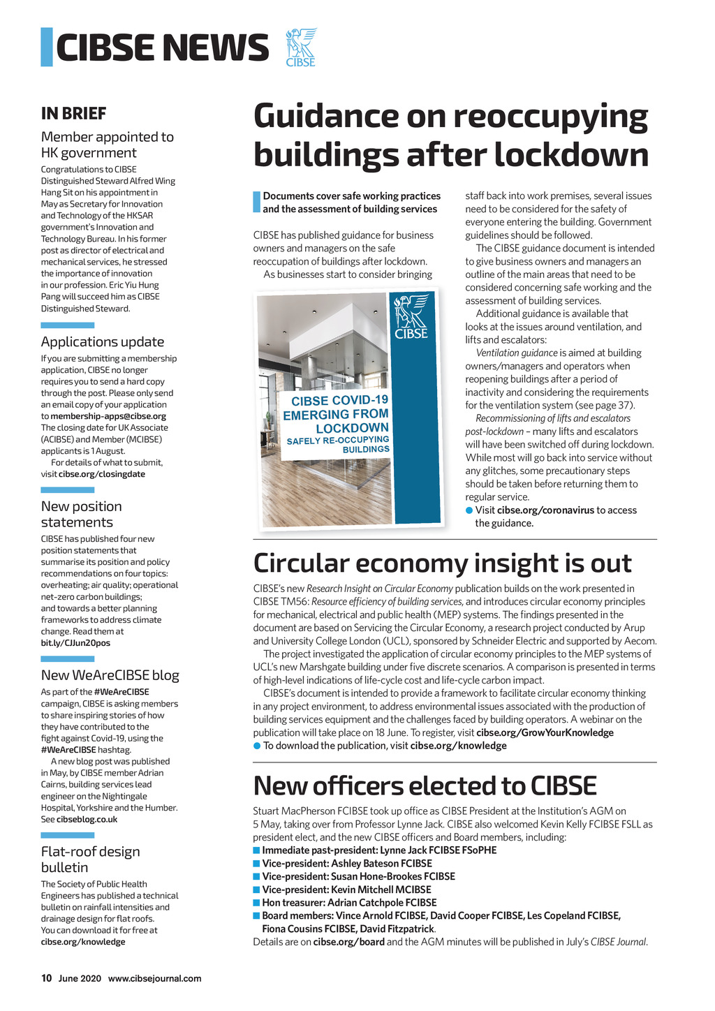 CIBSE NEWS IN BRIEF Member appointed to HK government Congratulations to CIBSE Distinguished Steward Alfred Wing Hang Sit on his appointment in May as Secretary for Innovation and Technology of the HKSAR governments Innovation and Technology Bureau. In his former post as director of electrical and mechanical services, he stressed the importance of innovation in our profession. Eric Yiu Hung Pang will succeed him as CIBSE Distinguished Steward. Applications update If you are submitting a membership application, CIBSE no longer requires you to send a hard copy through the post. Please only send an email copy of your application to membership-apps@cibse.org The closing date for UK Associate (ACIBSE) and Member (MCIBSE) applicants is 1 August. For details of what to submit, visit cibse.org/closingdate New position statements CIBSE has published four new position statements that summarise its position and policy recommendations on four topics: overheating; air quality; operational net-zero carbon buildings; and towards a better planning frameworks to address climate change. Read them at bit.ly/CJJun20pos New WeAreCIBSE blog As part of the #WeAreCIBSE campaign, CIBSE is asking members to share inspiring stories of how they have contributed to the fight against Covid-19, using the #WeAreCIBSE hashtag. A new blog post was published in May, by CIBSE member Adrian Cairns, building services lead engineer on the Nightingale Hospital, Yorkshire and the Humber. See cibseblog.co.uk Flat-roof design bulletin The Society of Public Health Engineers has published a technical bulletin on rainfall intensities and drainage design for flat roofs. You can download it for free at cibse.org/knowledge Guidance on reoccupying buildings after lockdown Documents cover safe working practices and the assessment of building services CIBSE has published guidance for business owners and managers on the safe reoccupation of buildings after lockdown. As businesses start to consider bringing staff back into work premises, several issues need to be considered for the safety of everyone entering the building. Government guidelines should be followed. The CIBSE guidance document is intended to give business owners and managers an outline of the main areas that need to be considered concerning safe working and the assessment of building services. Additional guidance is available that looks at the issues around ventilation, and lifts and escalators: Ventilation guidance is aimed at building owners/managers and operators when reopening buildings after a period of inactivity and considering the requirements for the ventilation system (see page 37). Recommissioning of lifts and escalators post-lockdown many lifts and escalators will have been switched off during lockdown. While most will go back into service without any glitches, some precautionary steps should be taken before returning them to regular service. Visit cibse.org/coronavirus to access the guidance. Circular economy insight is out CIBSEs new Research Insight on Circular Economy publication builds on the work presented in CIBSE TM56: Resource efciency of building services, and introduces circular economy principles for mechanical, electrical and public health (MEP) systems. The ndings presented in the document are based on Servicing the Circular Economy, a research project conducted by Arup and University College London (UCL), sponsored by Schneider Electric and supported by Aecom. The project investigated the application of circular economy principles to the MEP systems of UCLs new Marshgate building under ve discrete scenarios. A comparison is presented in terms of high-level indications of life-cycle cost and life-cycle carbon impact. CIBSEs document is intended to provide a framework to facilitate circular economy thinking in any project environment, to address environmental issues associated with the production of building services equipment and the challenges faced by building operators. A webinar on the publication will take place on 18 June. To register, visit cibse.org/GrowYourKnowledge To download the publication, visit cibse.org/knowledge New officers elected to CIBSE Stuart MacPherson FCIBSE took up ofce as CIBSE President at the Institutions AGM on 5 May, taking over from Professor Lynne Jack. CIBSE also welcomed Kevin Kelly FCIBSE FSLL as president elect, and the new CIBSE ofcers and Board members, including: Immediate past-president: Lynne Jack FCIBSE FSoPHE Vice-president: Ashley Bateson FCIBSE Vice-president: Susan Hone-Brookes FCIBSE Vice-president: Kevin Mitchell MCIBSE Hon treasurer: Adrian Catchpole FCIBSE Board members: Vince Arnold FCIBSE, David Cooper FCIBSE, Les Copeland FCIBSE, Fiona Cousins FCIBSE, David Fitzpatrick. Details are on cibse.org/board and the AGM minutes will be published in Julys CIBSE Journal. 10 June 2020 www.cibsejournal.com CIBSE June 2020 pp10-11 CIBSE News.indd 10 22/05/2020 17:27