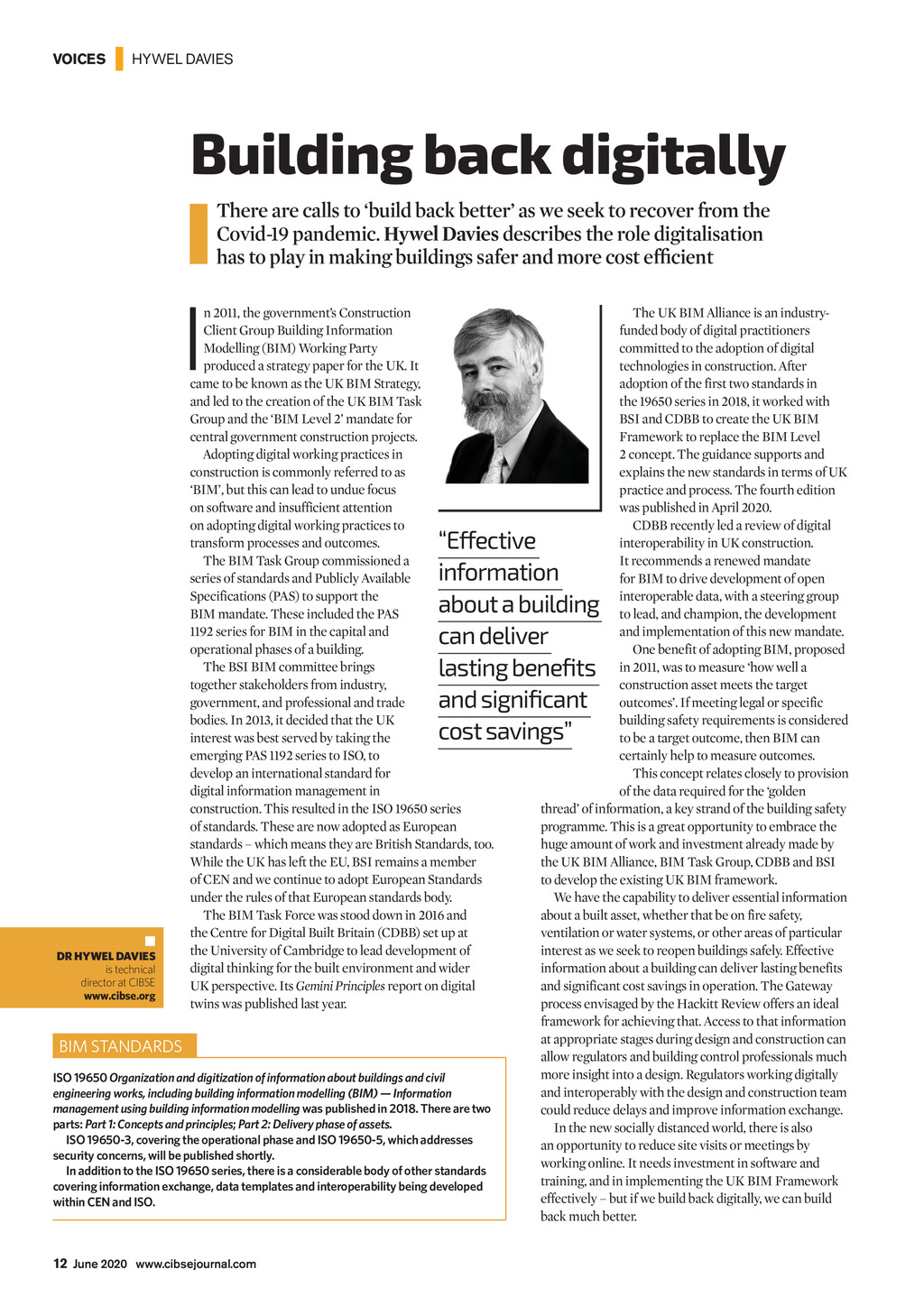 VOICES | HYWEL DAVIES Building back digitally There are calls to build back better as we seek to recover from the Covid-19 pandemic. Hywel Davies describes the role digitalisation has to play in making buildings safer and more cost efficient I n 2011, the governments Construction Client Group Building Information Modelling (BIM) Working Party produced a strategy paper for the UK. It came to be known as the UK BIM Strategy, and led to the creation of the UK BIM Task Group and the BIM Level 2 mandate for central government construction projects. Adopting digital working practices in construction is commonly referred to as BIM, but this can lead to undue focus on software and insufficient attention on adopting digital working practices to transform processes and outcomes. The BIM Task Group commissioned a series of standards and Publicly Available Specifications (PAS) to support the BIM mandate. These included the PAS 1192 series for BIM in the capital and operational phases of a building. The BSI BIM committee brings together stakeholders from industry, government, and professional and trade bodies. In 2013, it decided that the UK interest was best served by taking the emerging PAS 1192 series to ISO, to develop an international standard for digital information management in construction. This resulted in the ISO 19650 series of standards. These are now adopted as European standards which means they are British Standards, too. While the UK has left the EU, BSI remains a member of CEN and we continue to adopt European Standards under the rules of that European standards body. The BIM Task Force was stood down in 2016 and the Centre for Digital Built Britain (CDBB) set up at the University of Cambridge to lead development of digital thinking for the built environment and wider UK perspective. Its Gemini Principles report on digital twins was published last year. The UK BIM Alliance is an industryfunded body of digital practitioners committed to the adoption of digital technologies in construction. After adoption of the first two standards in the 19650 series in 2018, it worked with BSI and CDBB to create the UK BIM Framework to replace the BIM Level 2 concept. The guidance supports and explains the new standards in terms of UK practice and process. The fourth edition was published in April 2020. CDBB recently led a review of digital interoperability in UK construction. It recommends a renewed mandate for BIM to drive development of open interoperable data, with a steering group to lead, and champion, the development and implementation of this new mandate. One benefit of adopting BIM, proposed in 2011, was to measure how well a construction asset meets the target outcomes. If meeting legal or specific building safety requirements is considered to be a target outcome, then BIM can certainly help to measure outcomes. This concept relates closely to provision of the data required for the golden thread of information, a key strand of the building safety programme. This is a great opportunity to embrace the huge amount of work and investment already made by the UK BIM Alliance, BIM Task Group, CDBB and BSI to develop the existing UK BIM framework. We have the capability to deliver essential information about a built asset, whether that be on fire safety, ventilation or water systems, or other areas of particular interest as we seek to reopen buildings safely. Effective information about a building can deliver lasting benefits and significant cost savings in operation. The Gateway process envisaged by the Hackitt Review offers an ideal framework for achieving that. Access to that information at appropriate stages during design and construction can allow regulators and building control professionals much more insight into a design. Regulators working digitally and interoperably with the design and construction team could reduce delays and improve information exchange. In the new socially distanced world, there is also an opportunity to reduce site visits or meetings by working online. It needs investment in software and training, and in implementing the UK BIM Framework effectively but if we build back digitally, we can build back much better. Effective information about a building can deliver lasting benefits and significant cost savings DR HYWEL DAVIES is technical director at CIBSE www.cibse.org BIM STANDARDS ISO 19650 Organization and digitization of information about buildings and civil engineering works, including building information modelling (BIM) Information management using building information modelling was published in 2018. There are two parts: Part 1: Concepts and principles; Part 2: Delivery phase of assets. ISO 19650-3, covering the operational phase and ISO 19650-5, which addresses security concerns, will be published shortly. In addition to the ISO 19650 series, there is a considerable body of other standards covering information exchange, data templates and interoperability being developed within CEN and ISO. 12 June 2020 www.cibsejournal.com CIBSE May 2020 pp12 Hywel Davies.indd 12 22/05/2020 19:24