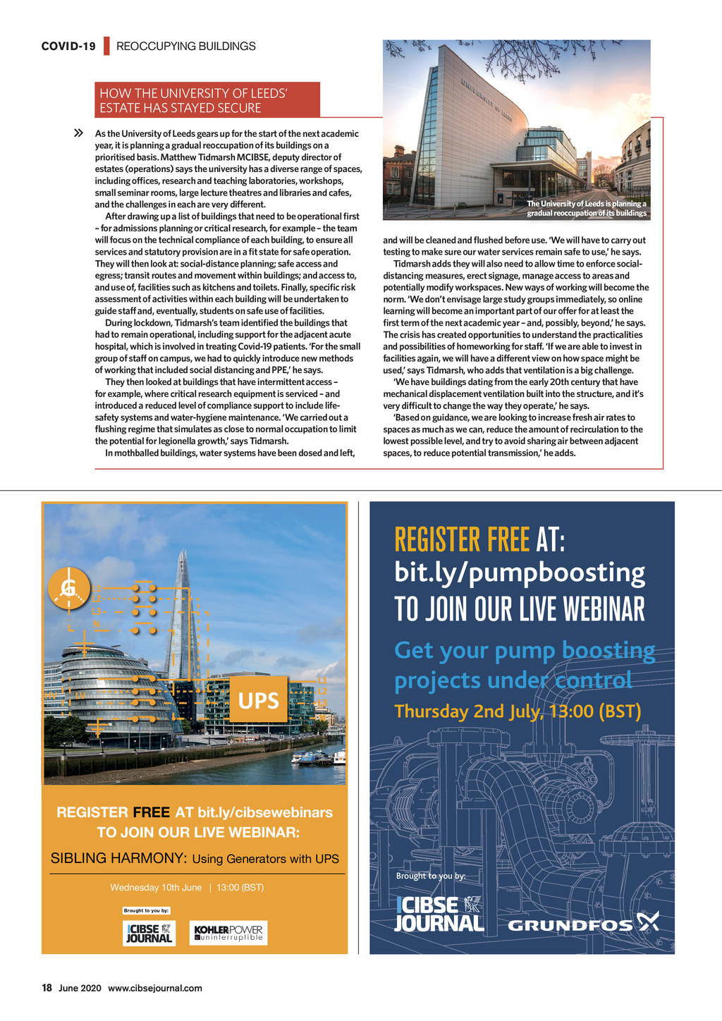 COVID-19 | REOCCUPYING BUILDINGS HOW THE UNIVERSITY OF LEEDS ESTATE HAS STAYED SECURE As the University of Leeds gears up for the start of the next academic year, it is planning a gradual reoccupation of its buildings on a prioritised basis. Matthew Tidmarsh MCIBSE, deputy director of estates (operations) says the university has a diverse range of spaces, including ofces, research and teaching laboratories, workshops, small seminar rooms, large lecture theatres and libraries and cafes, and the challenges in each are very different. After drawing up a list of buildings that need to be operational rst for admissions planning or critical research, for example the team will focus on the technical compliance of each building, to ensure all services and statutory provision are in a t state for safe operation. They will then look at: social-distance planning; safe access and egress; transit routes and movement within buildings; and access to, and use of, facilities such as kitchens and toilets. Finally, specic risk assessment of activities within each building will be undertaken to guide staff and, eventually, students on safe use of facilities. During lockdown, Tidmarshs team identied the buildings that had to remain operational, including support for the adjacent acute hospital, which is involved in treating Covid-19 patients. For the small group of staff on campus, we had to quickly introduce new methods of working that included social distancing and PPE, he says. They then looked at buildings that have intermittent access for example, where critical research equipment is serviced and introduced a reduced level of compliance support to include lifesafety systems and water-hygiene maintenance. We carried out a ushing regime that simulates as close to normal occupation to limit the potential for legionella growth, says Tidmarsh. In mothballed buildings, water systems have been dosed and left, The University of Leeds is planning a gradual reoccupation of its buildings and will be cleaned and ushed before use. We will have to carry out testing to make sure our water services remain safe to use, he says. Tidmarsh adds they will also need to allow time to enforce socialdistancing measures, erect signage, manage access to areas and potentially modify workspaces. New ways of working will become the norm. We dont envisage large study groups immediately, so online learning will become an important part of our offer for at least the rst term of the next academic year and, possibly, beyond, he says. The crisis has created opportunities to understand the practicalities and possibilities of homeworking for staff. If we are able to invest in facilities again, we will have a different view on how space might be used, says Tidmarsh, who adds that ventilation is a big challenge. We have buildings dating from the early 20th century that have mechanical displacement ventilation built into the structure, and its very difcult to change the way they operate, he says. Based on guidance, we are looking to increase fresh air rates to spaces as much as we can, reduce the amount of recirculation to the lowest possible level, and try to avoid sharing air between adjacent spaces, to reduce potential transmission, he adds. REGISTER FREE AT: bit.ly/pumpboosting TO JOIN OUR LIVE WEBINAR Get your pump boosting projects under control Thursday 2nd July, 13:00 (BST) REGISTER FREE AT bit.ly/cibsewebinars TO JOIN OUR LIVE WEBINAR: SIBLING HARMONY: Using Generators with UPS Brought to you by: Wednesday 10th June | 13:00 (BST) Brought to you by: 18 June 2020 www.cibsejournal.com CIBSE June 2020 p16-18 Covid secure buidlings 2.indd 18 22/05/2020 17:29