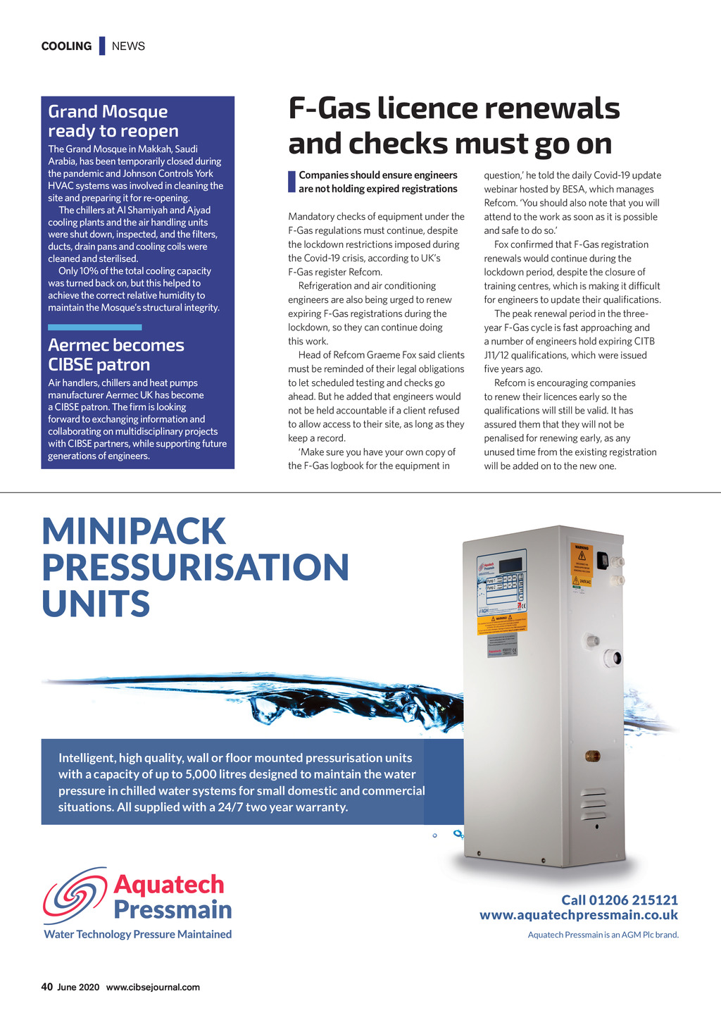 COOLING | NEWS Grand Mosque ready to reopen The Grand Mosque in Makkah, Saudi Arabia, has been temporarily closed during the pandemic and Johnson Controls York HVAC systems was involved in cleaning the site and preparing it for re-opening. The chillers at Al Shamiyah and Ajyad cooling plants and the air handling units were shut down, inspected, and the filters, ducts, drain pans and cooling coils were cleaned and sterilised. Only 10% of the total cooling capacity was turned back on, but this helped to achieve the correct relative humidity to maintain the Mosques structural integrity. Aermec becomes CIBSE patron Air handlers, chillers and heat pumps manufacturer Aermec UK has become a CIBSE patron. The firm is looking forward to exchanging information and collaborating on multidisciplinary projects with CIBSE partners, while supporting future generations of engineers. F-Gas licence renewals and checks must go on Companies should ensure engineers are not holding expired registrations Mandatory checks of equipment under the F-Gas regulations must continue, despite the lockdown restrictions imposed during the Covid-19 crisis, according to UKs F-Gas register Refcom. Refrigeration and air conditioning engineers are also being urged to renew expiring F-Gas registrations during the lockdown, so they can continue doing this work. Head of Refcom Graeme Fox said clients must be reminded of their legal obligations to let scheduled testing and checks go ahead. But he added that engineers would not be held accountable if a client refused to allow access to their site, as long as they keep a record. Make sure you have your own copy of the F-Gas logbook for the equipment in question, he told the daily Covid-19 update webinar hosted by BESA, which manages Refcom. You should also note that you will attend to the work as soon as it is possible and safe to do so. Fox confirmed that F-Gas registration renewals would continue during the lockdown period, despite the closure of training centres, which is making it difficult for engineers to update their qualifications. The peak renewal period in the threeyear F-Gas cycle is fast approaching and a number of engineers hold expiring CITB J11/12 qualifications, which were issued five years ago. Refcom is encouraging companies to renew their licences early so the qualifications will still be valid. It has assured them that they will not be penalised for renewing early, as any unused time from the existing registration will be added on to the new one. MINIPACK PRESSURISATION UNITS Intelligent, high quality, wall or floor mounted pressurisation units with a capacity of up to 5,000 litres designed to maintain the water pressure in chilled water systems for small domestic and commercial situations. All supplied with a 24/7 two year warranty. Call 01206 215121 www.aquatechpressmain.co.uk Aquatech Pressmain is an AGM Plc brand. 40 June 2020 www.cibsejournal.com CIBSE_Jun20 pp40 Cooling News.indd 40 22/05/2020 17:42