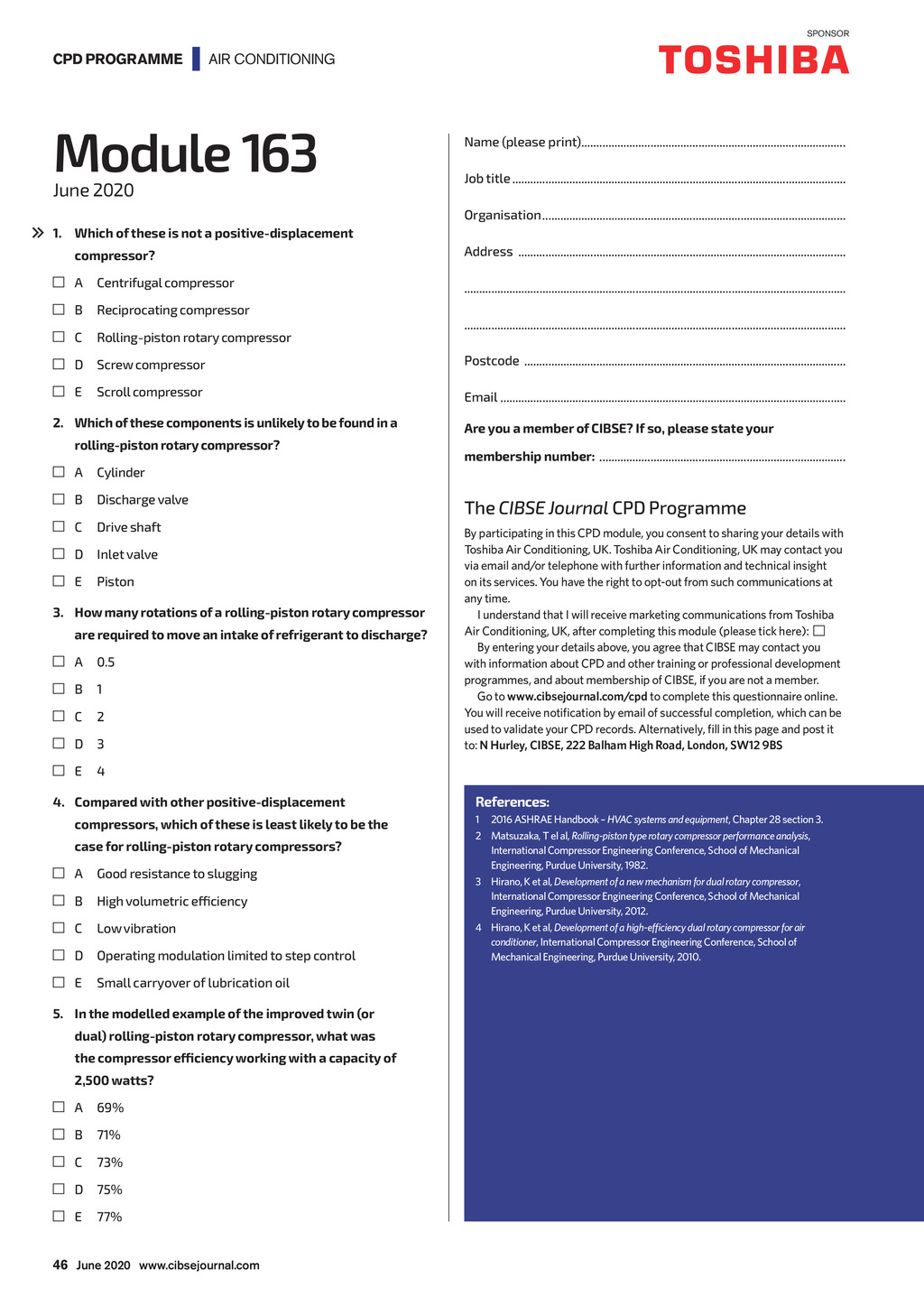 SPONSOR CPD PROGRAMME | AIR CONDITIONING Module 163 June 2020 Name (please print)......................................................................................... Job title................................................................................................................ Organisation...................................................................................................... 1.Which of these is not a positive-displacement compressor? Address .............................................................................................................. A Centrifugal compressor ............................................................................................................................... B Reciprocating compressor C Rolling-piston rotary compressor ............................................................................................................................... Screw compressor Postcode ............................................................................................................ E Scroll compressor Email .................................................................................................................... D 2.Which of these components is unlikely to be found in a rolling-piston rotary compressor? A Cylinder B Discharge valve C Drive shaft D Inlet valve E Piston 3.How many rotations of a rolling-piston rotary compressor are required to move an intake of refrigerant to discharge? A 0.5 B 1 C 2 D 3 E 4 4.Compared with other positive-displacement compressors, which of these is least likely to be the case for rolling-piston rotary compressors? A Good resistance to slugging B High volumetric efficiency C Low vibration D Operating modulation limited to step control E Small carryover of lubrication oil Are you a member of CIBSE? If so, please state your membership number: ................................................................................... The CIBSE Journal CPD Programme By participating in this CPD module, you consent to sharing your details with Toshiba Air Conditioning, UK. Toshiba Air Conditioning, UK may contact you via email and/or telephone with further information and technical insight on its services. You have the right to opt-out from such communications at any time. I understand that I will receive marketing communications from Toshiba Air Conditioning, UK, after completing this module (please tick here): By entering your details above, you agree that CIBSE may contact you with information about CPD and other training or professional development programmes, and about membership of CIBSE, if you are not a member. Go to www.cibsejournal.com/cpd to complete this questionnaire online. You will receive notification by email of successful completion, which can be used to validate your CPD records. Alternatively, fill in this page and post it to: N Hurley, CIBSE, 222 Balham High Road, London, SW12 9BS References: 1 2016 ASHRAE Handbook HVAC systems and equipment, Chapter 28 section 3. 2 Matsuzaka, T el al, Rolling-piston type rotary compressor performance analysis, International Compressor Engineering Conference, School of Mechanical Engineering, Purdue University, 1982. 3 Hirano, K et al, Development of a new mechanism for dual rotary compressor, International Compressor Engineering Conference, School of Mechanical Engineering, Purdue University, 2012. 4 Hirano, K et al, Development of a high-efficiency dual rotary compressor for air conditioner, International Compressor Engineering Conference, School of Mechanical Engineering, Purdue University, 2010. 5.In the modelled example of the improved twin (or dual) rolling-piston rotary compressor, what was the compressor efficiency working with a capacity of 2,500 watts? A 69% B 71% C 73% D 75% E 77% 46 June 2020 www.cibsejournal.com CIBSE June 2020 p43-46 CPD Toshiba 163 v2.indd 46 22/05/2020 17:46