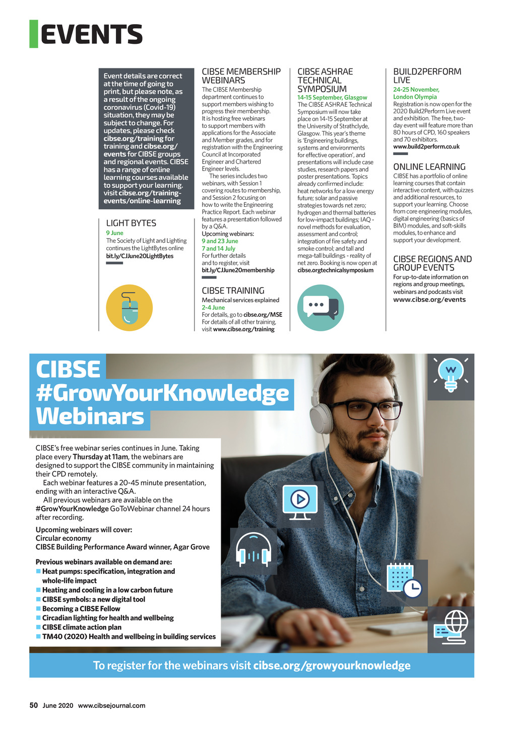 EVENTS Event details are correct at the time of going to print, but please note, as a result of the ongoing coronavirus (Covid-19) situation, they may be subject to change. For updates, please check cibse.org/training for training and cibse.org/ events for CIBSE groups and regional events. CIBSE has a range of online learning courses available to support your learning. visit cibse.org/trainingevents/online-learning LIGHT BYTES 9 June The Society of Light and Lighting continues the LightBytes online bit.ly/CJJune20LightBytes CIBSE MEMBERSHIP WEBINARS The CIBSE Membership department continues to support members wishing to progress their membership. It is hosting free webinars to support members with applications for the Associate and Member grades, and for registration with the Engineering Council at Incorporated Engineer and Chartered Engineer levels. The series includes two webinars, with Session 1 covering routes to membership, and Session 2 focusing on how to write the Engineering Practice Report. Each webinar features a presentation followed by a Q&A. Upcoming webinars: 9 and 23 June 7 and 14 July For further details and to register, visit bit.ly/CJJune20membership CIBSE TRAINING Mechanical services explained 2-4 June For details, go to cibse.org/MSE For details of all other training, visit www.cibse.org/training CIBSE ASHRAE TECHNICAL SYMPOSIUM 14-15 September, Glasgow The CIBSE ASHRAE Technical Symposium will now take place on 14-15 September at the University of Strathclyde, Glasgow. This years theme is Engineering buildings, systems and environments for effective operation, and presentations will include case studies, research papers and poster presentations. Topics already conrmed include: heat networks for a low energy future; solar and passive strategies towards net zero; hydrogen and thermal batteries for low-impact buildings; IAQ novel methods for evaluation, assessment and control; integration of re safety and smoke control; and tall and mega-tall buildings - reality of net zero. Booking is now open at cibse.orgtechnicalsymposium BUILD2PERFORM LIVE 24-25 November, London Olympia Registration is now open for the 2020 Build2Perform Live event and exhibition. The free, twoday event will feature more than 80 hours of CPD, 160 speakers and 70 exhibitors. www.build2perform.co.uk ONLINE LEARNING CIBSE has a portfolio of online learning courses that contain interactive content, with quizzes and additional resources, to support your learning. Choose from core engineering modules, digital engineering (basics of BIM) modules, and soft-skills modules, to enhance and support your development. CIBSE REGIONS AND GROUP EVENTS For up-to-date information on regions and group meetings, webinars and podcasts visit www.cibse.org/events CIBSE #GrowYourKnowledge Webinars CIBSEs free webinar series continues in June. Taking place every Thursday at 11am, the webinars are designed to support the CIBSE community in maintaining their CPD remotely. Each webinar features a 20-45 minute presentation, ending with an interactive Q&A. All previous webinars are available on the #GrowYourKnowledge GoToWebinar channel 24 hours after recording. Upcoming webinars will cover: Circular economy CIBSE Building Performance Award winner, Agar Grove Previous webinars available on demand are: Heat pumps: specication, integration and whole-life impact Heating and cooling in a low carbon future CIBSE symbols: a new digital tool Becoming a CIBSE Fellow Circadian lighting for health and wellbeing CIBSE climate action plan TM40 (2020) Health and wellbeing in building services To register for the webinars visit cibse.org/growyourknowledge 50 June 2020 www.cibsejournal.com CIBSE June20 pp50 Events.indd 50 22/05/2020 17:49