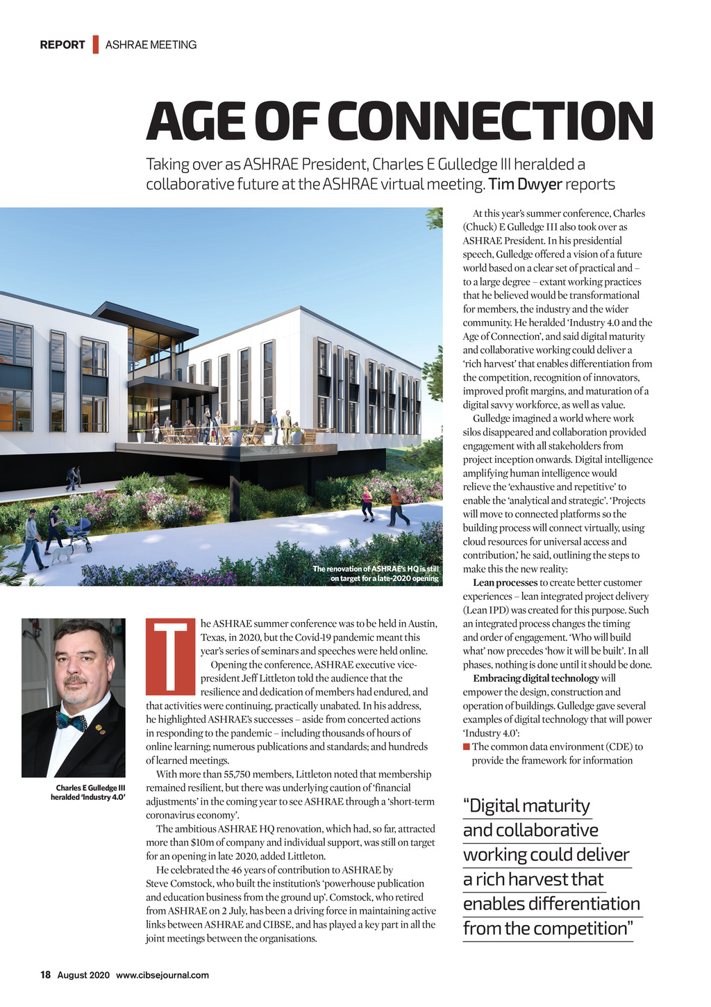 REPORT | ASHRAE MEETING AGE OF CONNECTION Taking over as ASHRAE President, Charles E Gulledge III heralded a collaborative future at the ASHRAE virtual meeting. Tim Dwyer reports The renovation of ASHRAEs HQ is still on target for a late-2020 opening T Charles E Gulledge III heralded Industry 4.0 he ASHRAE summer conference was to be held in Austin, Texas, in 2020, but the Covid-19 pandemic meant this years series of seminars and speeches were held online. Opening the conference, ASHRAE executive vicepresident Jeff Littleton told the audience that the resilience and dedication of members had endured, and that activities were continuing, practically unabated. In his address, he highlighted ASHRAEs successes aside from concerted actions in responding to the pandemic including thousands of hours of online learning; numerous publications and standards; and hundreds of learned meetings. With more than 55,750 members, Littleton noted that membership remained resilient, but there was underlying caution of financial adjustments in the coming year to see ASHRAE through a short-term coronavirus economy. The ambitious ASHRAE HQ renovation, which had, so far, attracted more than $10m of company and individual support, was still on target for an opening in late 2020, added Littleton. He celebrated the 46 years of contribution to ASHRAE by Steve Comstock, who built the institutions powerhouse publication and education business from the ground up. Comstock, who retired from ASHRAE on 2 July, has been a driving force in maintaining active links between ASHRAE and CIBSE, and has played a key part in all the joint meetings between the organisations. At this years summer conference, Charles (Chuck) E Gulledge III also took over as ASHRAE President. In his presidential speech, Gulledge offered a vision of a future world based on a clear set of practical and to a large degree extant working practices that he believed would be transformational for members, the industry and the wider community. He heralded Industry 4.0 and the Age of Connection, and said digital maturity and collaborative working could deliver a rich harvest that enables differentiation from the competition, recognition of innovators, improved profit margins, and maturation of a digital savvy workforce, as well as value. Gulledge imagined a world where work silos disappeared and collaboration provided engagement with all stakeholders from project inception onwards. Digital intelligence amplifying human intelligence would relieve the exhaustive and repetitive to enable the analytical and strategic. Projects will move to connected platforms so the building process will connect virtually, using cloud resources for universal access and contribution, he said, outlining the steps to make this the new reality: Lean processes to create better customer experiences lean integrated project delivery (Lean IPD) was created for this purpose. Such an integrated process changes the timing and order of engagement. Who will build what now precedes how it will be built. In all phases, nothing is done until it should be done. Embracing digital technology will empower the design, construction and operation of buildings. Gulledge gave several examples of digital technology that will power Industry 4.0: The common data environment (CDE) to provide the framework for information Digital maturity and collaborative working could deliver a rich harvest that enables differentiation from the competition 18 August 2020 www.cibsejournal.com CIBSE August 2020 p18-19 Ashrae meeting.indd 18 24/07/2020 15:51