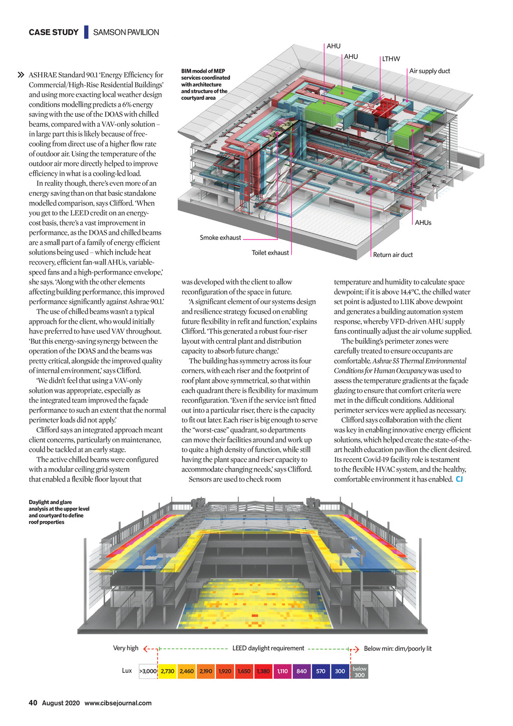 CASE STUDY | SAMSON PAVILION AHU AHU ASHRAE Standard 90.1 Energy Efficiency for Commercial/High-Rise Residential Buildings and using more exacting local weather design conditions modelling predicts a 6% energy saving with the use of the DOAS with chilled beams, compared with a VAV-only solution in large part this is likely because of freecooling from direct use of a higher flow rate of outdoor air. Using the temperature of the outdoor air more directly helped to improve efficiency in what is a cooling-led load. In reality though, theres even more of an energy saving than on that basic standalone modelled comparison, says Clifford. When you get to the LEED credit on an energycost basis, theres a vast improvement in performance, as the DOAS and chilled beams are a small part of a family of energy efficient solutions being used which include heat recovery, efficient fan-wall AHUs, variablespeed fans and a high-performance envelope, she says. Along with the other elements affecting building performance, this improved performance significantly against Ashrae 90.1. The use of chilled beams wasnt a typical approach for the client, who would initially have preferred to have used VAV throughout. But this energy-saving synergy between the operation of the DOAS and the beams was pretty critical, alongside the improved quality of internal environment, says Clifford. We didnt feel that using a VAV-only solution was appropriate, especially as the integrated team improved the faade performance to such an extent that the normal perimeter loads did not apply. Clifford says an integrated approach meant client concerns, particularly on maintenance, could be tackled at an early stage. The active chilled beams were configured with a modular ceiling grid system that enabled a flexible floor layout that LTHW Air supply duct BIM model of MEP services coordinated with architecture and structure of the courtyard area AHUs Smoke exhaust Toilet exhaust Return air duct was developed with the client to allow reconfiguration of the space in future. A significant element of our systems design and resilience strategy focused on enabling future flexibility in refit and function, explains Clifford. This generated a robust four-riser layout with central plant and distribution capacity to absorb future change. The building has symmetry across its four corners, with each riser and the footprint of roof plant above symmetrical, so that within each quadrant there is flexibility for maximum reconfiguration. Even if the service isnt fitted out into a particular riser, there is the capacity to fit out later. Each riser is big enough to serve the worst-case quadrant, so departments can move their facilities around and work up to quite a high density of function, while still having the plant space and riser capacity to accommodate changing needs, says Clifford. Sensors are used to check room temperature and humidity to calculate space dewpoint; if it is above 14.4C, the chilled water set point is adjusted to 1.11K above dewpoint and generates a building automation system response, whereby VFD-driven AHU supply fans continually adjust the air volume supplied. The buildings perimeter zones were carefully treated to ensure occupants are comfortable. Ashrae 55 Thermal Environmental Conditions for Human Occupancy was used to assess the temperature gradients at the faade glazing to ensure that comfort criteria were met in the difficult conditions. Additional perimeter services were applied as necessary. Clifford says collaboration with the client was key in enabling innovative energy efficient solutions, which helped create the state-of-theart health education pavilion the client desired. Its recent Covid-19 facility role is testament to the flexible HVAC system, and the healthy, comfortable environment it has enabled. CJ Daylight and glare analysis at the upper level and courtyard to define roof properties Very high Lux LEED daylight requirement >3,000 2,730 2,460 2,190 1,920 1,650 1,380 1,110 840 Below min: dim/poorly lit 570 300 below 300 40 August 2020 www.cibsejournal.com CIBSE Aug 2020 p38-40 Cleveland clinic v2.indd 40 24/07/2020 17:35