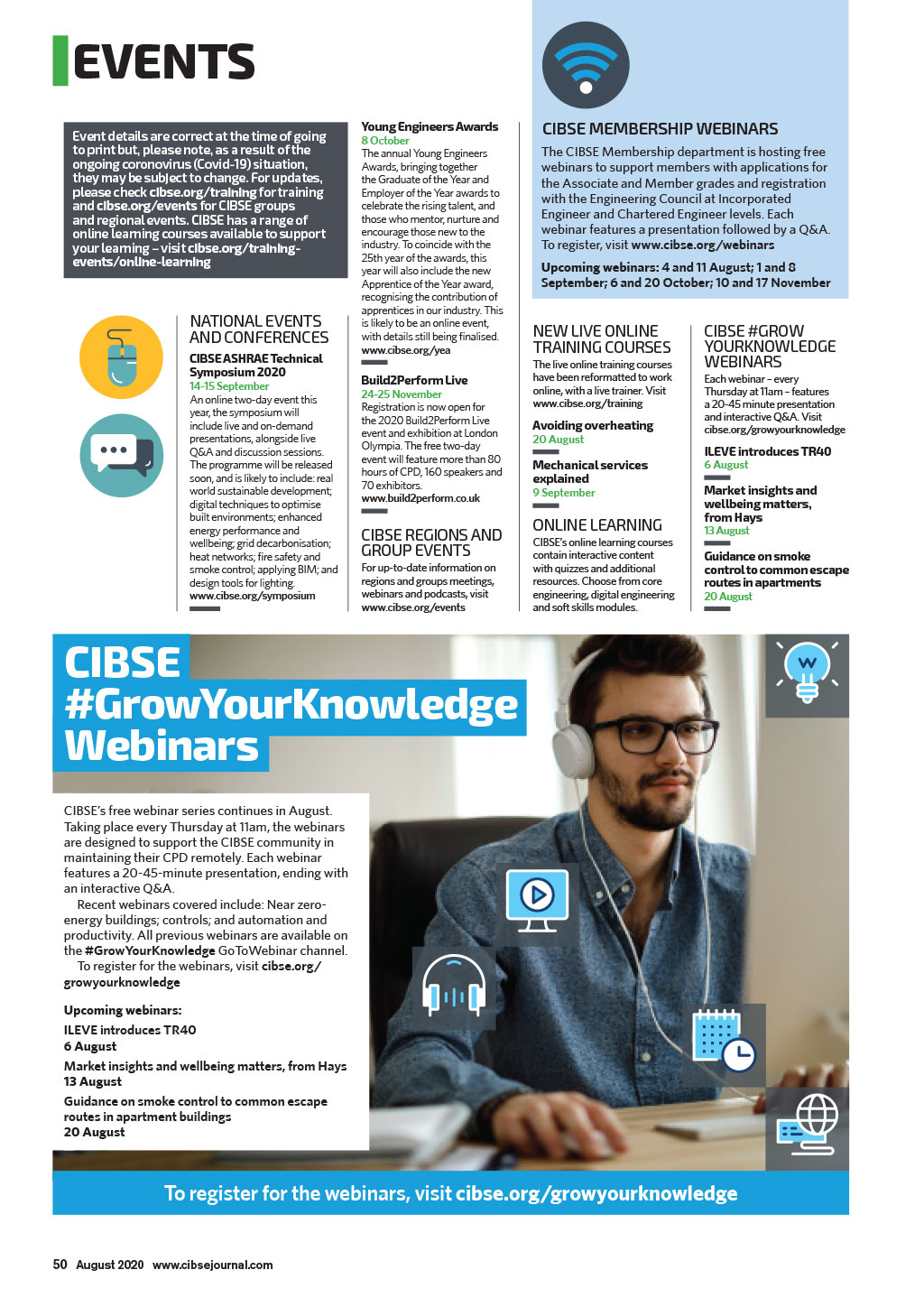 EVENTS Event details are correct at the time of going to print but, please note, as a result of the ongoing coronovirus (Covid-19) situation, they may be subject to change. For updates, please check cibse.org/training for training and cibse.org/events for CIBSE groups and regional events. CIBSE has a range of online learning courses available to support your learning visit cibse.org/trainingevents/online-learning NATIONAL EVENTS AND CONFERENCES CIBSE ASHRAE Technical Symposium 2020 14-15 September An online two-day event this year, the symposium will include live and on-demand presentations, alongside live Q&A and discussion sessions. The programme will be released soon, and is likely to include: real world sustainable development; digital techniques to optimise built environments; enhanced energy performance and wellbeing; grid decarbonisation; heat networks; fire safety and smoke control; applying BIM; and design tools for lighting. www.cibse.org/symposium Young Engineers Awards 8 October The annual Young Engineers Awards, bringing together the Graduate of the Year and Employer of the Year awards to celebrate the rising talent, and those who mentor, nurture and encourage those new to the industry. To coincide with the 25th year of the awards, this year will also include the new Apprentice of the Year award, recognising the contribution of apprentices in our industry. This is likely to be an online event, with details still being finalised. www.cibse.org/yea Build2Perform Live 24-25 November Registration is now open for the 2020 Build2Perform Live event and exhibition at London Olympia. The free two-day event will feature more than 80 hours of CPD, 160 speakers and 70 exhibitors. www.build2perform.co.uk CIBSE REGIONS AND GROUP EVENTS For up-to-date information on regions and groups meetings, webinars and podcasts, visit www.cibse.org/events CIBSE MEMBERSHIP WEBINARS The CIBSE Membership department is hosting free webinars to support members with applications for the Associate and Member grades and registration with the Engineering Council at Incorporated Engineer and Chartered Engineer levels. Each webinar features a presentation followed by a Q&A. To register, visit www.cibse.org/webinars Upcoming webinars: 4 and 11 August; 1 and 8 September; 6 and 20 October; 10 and 17 November NEW LIVE ONLINE TRAINING COURSES The live online training courses have been reformatted to work online, with a live trainer. Visit www.cibse.org/training Avoiding overheating 20 August Mechanical services explained 9 September ONLINE LEARNING CIBSEs online learning courses contain interactive content with quizzes and additional resources. Choose from core engineering, digital engineering and soft skills modules. CIBSE #GROW YOURKNOWLEDGE WEBINARS Each webinar every Thursday at 11am features a 20-45 minute presentation and interactive Q&A. Visit cibse.org/growyourknowledge ILEVE introduces TR61 6 August Market insights and wellbeing matters, from Hays 13 August Guidance on smoke control to common escape routes in apartments 20 August CIBSE #GrowYourKnowledge Webinars CIBSEs free webinar series continues in August. Taking place every Thursday at 11am, the webinars are designed to support the CIBSE community in maintaining their CPD remotely. Each webinar features a 20-45-minute presentation, ending with an interactive Q&A. Recent webinars covered include: Near zeroenergy buildings; controls; and automation and productivity. All previous webinars are available on the #GrowYourKnowledge GoToWebinar channel. To register for the webinars, visit cibse.org/ growyourknowledge Upcoming webinars: ILEVE introduces TR61 6 August Market insights and wellbeing matters, from Hays 13 August Guidance on smoke control to common escape routes in apartment buildings 20 August To register for the webinars, visit cibse.org/growyourknowledge 50 August 2020 www.cibsejournal.com CIBSE Aug20 pp50 Events.indd 50 24/07/2020 16:05