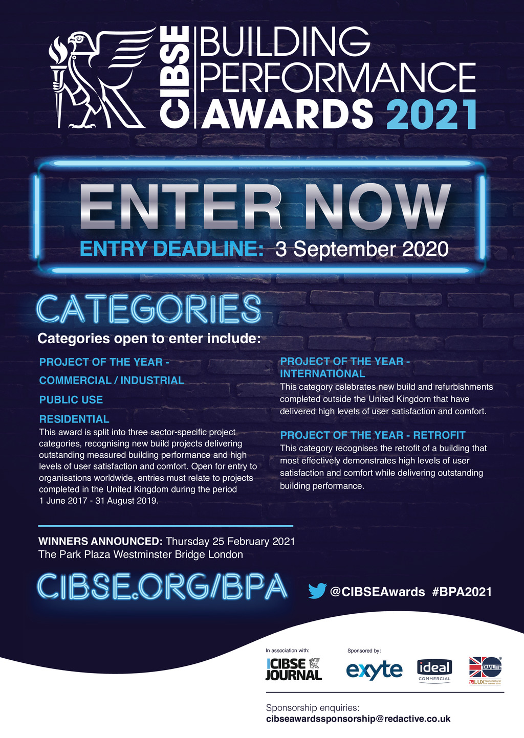 NTER NOW ENTRY DEADLINE: 3 September 2020 Categories open to enter include: PROJECT OF THE YEAR COMMERCIAL / INDUSTRIAL PUBLIC USE RESIDENTIAL This award is split into three sector-specific project categories, recognising new build projects delivering outstanding measured building performance and high levels of user satisfaction and comfort. Open for entry to organisations worldwide, entries must relate to projects completed in the United Kingdom during the period 1 June 2017 - 31 August 2019. PROJECT OF THE YEAR INTERNATIONAL This category celebrates new build and refurbishments completed outside the United Kingdom that have delivered high levels of user satisfaction and comfort. PROJECT OF THE YEAR - RETROFIT This category recognises the retrofit of a building that most effectively demonstrates high levels of user satisfaction and comfort while delivering outstanding building performance. WINNERS ANNOUNCED: Thursday 25 February 2021 The Park Plaza Westminster Bridge London L @CIBSEAwards #BPA2021 In association with: 6 August 2020 www.cibsejournal.com p06.CIBSEMagAug20.indd 6 Sponsored by: Sponsorship enquiries: cibseawardssponsorship@redactive.co.uk 20/07/2020 15:56
