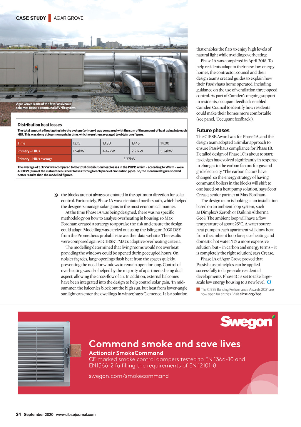 CASE STUDY | AGAR GROVE that enables the flats to enjoy high levels of natural light while avoiding overheating. Phase 1A was completed in April 2018. To help residents adapt to their new low-energy homes, the contractor, council and their design teams created guides to explain how their Passivhaus home operated, including guidance on the use of ventilation three-speed control. As part of Camdens ongoing support to residents, occupant feedback enabled Camden Council to identify how residents could make their homes more comfortable (see panel, Occupant feedback). Agar Grove is one of the few Passivhaus schemes to use a communal MVHR system Distribution heat losses The total amount of heat going into the system (primary) was compared with the sum of the amount of heat going into each HIU. This was done at four moments in time, which were then averaged to obtain one figure. Time 13:15 13:30 13:45 14:00 Primary HIUs 1.54kW 4.47kW 2.21kW 5.24kW Primary HIUs average 3.37kW The average of 3.37kW was compared to the total distribution heat losses in the PHPP, which according to Warm were 4.23kW (sum of the instantaneous heat losses through each piece of circulation pipe). So, the measured figure showed better results than the modelled figures. the blocks are not always orientated in the optimum direction for solar control. Fortunately, Phase 1A was orientated north-south, which helped the designers manage solar gains in the most economical manner. At the time Phase 1A was being designed, there was no specific methodology on how to analyse overheating in housing, so Max Fordham created a strategy to appraise the risk and ensure the design could adapt. Modelling was carried out using the Islington 2030 DSY from the Prometheus probabilistic weather data website. The results were compared against CIBSE TM52s adaptive overheating criteria. The modelling determined that living rooms would not overheat providing the windows could be opened during occupied hours. On noisier faades, large openings flush heat from the spaces quickly, preventing the need for windows to remain open for long. Control of overheating was also helped by the majority of apartments being dual aspect, allowing the cross-flow of air. In addition, external balconies have been integrated into the design to help control solar gain. In midsummer, the balconies block out the high sun, but heat from lower-angle sunlight can enter the dwellings in winter, says Clemence. It is a solution Future phases The CIBSE Award was for Phase 1A, and the design team adopted a similar approach to ensure Passivhaus compliance for Phase 1B. Detailed design of Phase 1C is about to start; its design has evolved significantly in response to changes to the carbon factors for gas and grid electricity. The carbon factors have changed, so the energy strategy of having communal boilers in the blocks will shift to one based on a heat pump solution, says Scott Crease, senior partner at Max Fordham. The design team is looking at an installation based on an ambient loop system, such as Dimplexs Zeroth or Daikins Altherma Geo3. The ambient loop will have a flow temperature of about 25C. A water source heat pump in each apartment will draw heat from the ambient loop for space heating and domestic hot water. Its a more expensive solution, but in carbon and energy terms it is completely the right solution, says Crease. Phase 1A of Agar Grove proved that Passivhaus principles can be applied successfully to large-scale residential developments. Phase 1C is set to take largescale low energy housing to a new level. CJ The CIBSE Building Performance Awards 2021 are now open for entries. Visit cibse.org/bpa Command smoke and save lives Actionair SmokeCommand CE marked smoke control dampers tested to EN 1366-10 and EN1366-2 fulfilling the requirements of EN 12101-8 swegon.com/smokecommand SmokeCommand Ad quarter page.indd 1 24 September 2020 www.cibsejournal.com CIBSE September 2020 p20-24 Agar Grove.indd 24 14/01/2020 14:26:39 21/08/2020 14:54