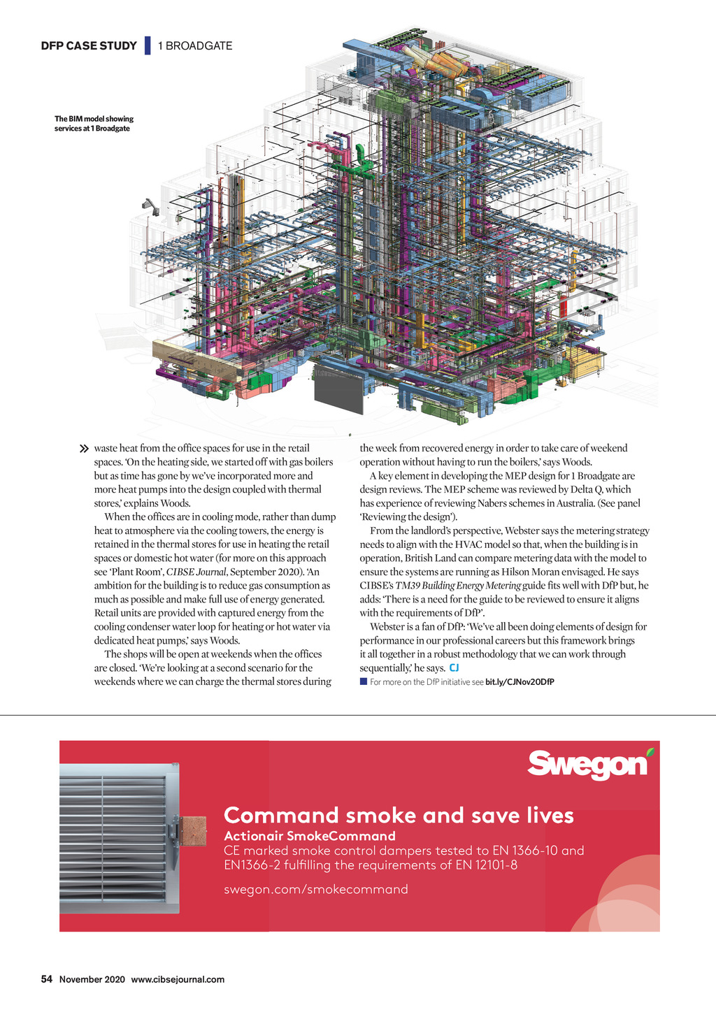 DFP CASE STUDY | 1 BROADGATE The BIM model showing services at 1 Broadgate waste heat from the office spaces for use in the retail spaces. On the heating side, we started off with gas boilers but as time has gone by weve incorporated more and more heat pumps into the design coupled with thermal stores, explains Woods. When the offices are in cooling mode, rather than dump heat to atmosphere via the cooling towers, the energy is retained in the thermal stores for use in heating the retail spaces or domestic hot water (for more on this approach see Plant Room, CIBSE Journal, September 2020). An ambition for the building is to reduce gas consumption as much as possible and make full use of energy generated. Retail units are provided with captured energy from the cooling condenser water loop for heating or hot water via dedicated heat pumps, says Woods. The shops will be open at weekends when the offices are closed. Were looking at a second scenario for the weekends where we can charge the thermal stores during the week from recovered energy in order to take care of weekend operation without having to run the boilers, says Woods. A key element in developing the MEP design for 1 Broadgate are design reviews. The MEP scheme was reviewed by Delta Q, which has experience of reviewing Nabers schemes in Australia. (See panel Reviewing the design). From the landlords perspective, Webster says the metering strategy needs to align with the HVAC model so that, when the building is in operation, British Land can compare metering data with the model to ensure the systems are running as Hilson Moran envisaged. He says CIBSEs TM39 Building Energy Metering guide fits well with DfP but, he adds: There is a need for the guide to be reviewed to ensure it aligns with the requirements of DfP. Webster is a fan of DfP: Weve all been doing elements of design for performance in our professional careers but this framework brings it all together in a robust methodology that we can work through sequentially, he says. CJ For more on the DfP initiative see bit.ly/CJNov20DfP Command smoke and save lives Actionair SmokeCommand CE marked smoke control dampers tested to EN 1366-10 and EN1366-2 fulfilling the requirements of EN 12101-8 swegon.com/smokecommand SmokeCommand Ad quarter page.indd 1 14/01/2020 14:26:39 54 November 2020 www.cibsejournal.com CIBSE Nov 2020 pp52-54 DFP Case study.indd 54 23/10/2020 16:39