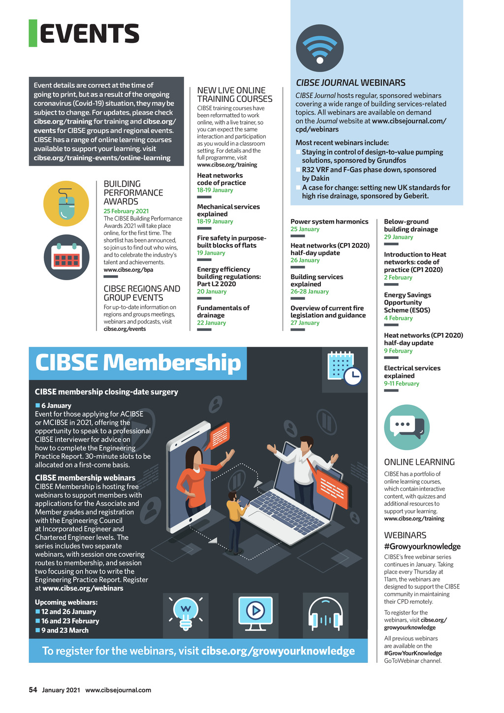 EVENTS Event details are correct at the time of going to print, but as a result of the ongoing coronavirus (Covid-19) situation, they may be subject to change. For updates, please check cibse.org/training for training and cibse.org/ events for CIBSE groups and regional events. CIBSE has a range of online learning courses available to support your learning. visit cibse.org/training-events/online-learning BUILDING PERFORMANCE AWARDS 25 February 2021 The CIBSE Building Performance Awards 2021 will take place online, for the rst time. The shortlist has been announced, so join us to nd out who wins, and to celebrate the industrys talent and achievements. www.cibse.org/bpa CIBSE REGIONS AND GROUP EVENTS For up-to-date information on regions and groups meetings, webinars and podcasts, visit cibse.org/events NEW LIVE ONLINE TRAINING COURSES CIBSE training courses have been reformatted to work online, with a live trainer, so you can expect the same interaction and participation as you would in a classroom setting. For details and the full programme, visit www.cibse.org/training Heat networks code of practice 18-19 January Mechanical services explained 18-19 January CIBSE JOURNAL WEBINARS CIBSE Journal hosts regular, sponsored webinars covering a wide range of building services-related topics. All webinars are available on demand on the Journal website at www.cibsejournal.com/ cpd/webinars Most recent webinars include: Staying in control of design-to-value pumping solutions, sponsored by Grundfos R32 VRF and F-Gas phase down, sponsored by Dakin A case for change: setting new UK standards for high rise drainage, sponsored by Geberit. Power system harmonics 25 January Fire safety in purposebuilt blocks of flats 19 January 29 January Heat networks (CP1 2020) half-day update 26 January Energy efficiency building regulations: Part L2 2020 20 January Fundamentals of drainage 22 January Below-ground building drainage Building services explained 26-28 January Overview of current fire legislation and guidance 27 January CIBSE Membership CIBSE membership closing-date surgery Introduction to Heat networks: code of practice (CP1 2020) 2 February Energy Savings Opportunity Scheme (ESOS) 4 February Heat networks (CP1 2020) half-day update 9 February Electrical services explained 9-11 February 6 January Event for those applying for ACIBSE or MCIBSE in 2021, offering the opportunity to speak to a professional CIBSE interviewer for advice on how to complete the Engineering Practice Report. 30-minute slots to be allocated on a rst-come basis. CIBSE membership webinars CIBSE Membership is hosting free webinars to support members with applications for the Associate and Member grades and registration with the Engineering Council at Incorporated Engineer and Chartered Engineer levels. The series includes two separate webinars, with session one covering routes to membership, and session two focusing on how to write the Engineering Practice Report. Register at www.cibse.org/webinars Upcoming webinars: 12 and 26 January 16 and 23 February 9 and 23 March To register for the webinars, visit cibse.org/growyourknowledge ONLINE LEARNING CIBSE has a portfolio of online learning courses, which contain interactive content, with quizzes and additional resources to support your learning. www.cibse.org/training WEBINARS #Growyourknowledge CIBSEs free webinar series continues in January. Taking place every Thursday at 11am, the webinars are designed to support the CIBSE community in maintaining their CPD remotely. To register for the webinars, visit cibse.org/ growyourknowledge All previous webinars are available on the #GrowYourKnowledge GoToWebinar channel. 54 January 2021 www.cibsejournal.com CIBSE Jan21 pp54 Events.indd 54 18/12/2020 15:34