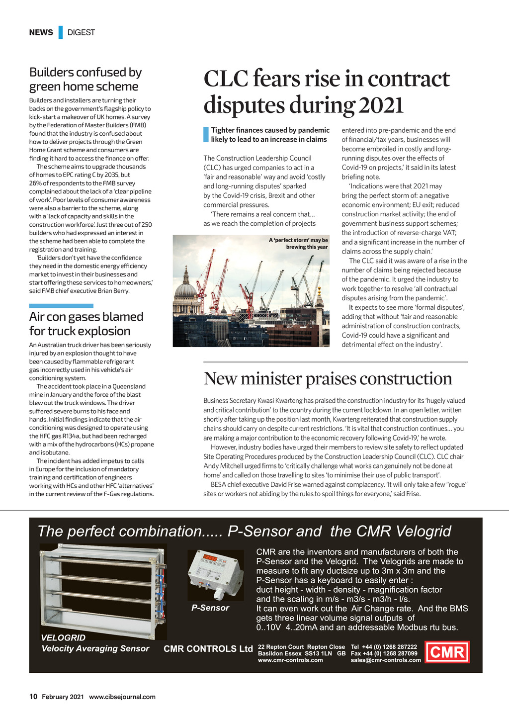 NEWS | DIGEST Builders confused by green home scheme Builders and installers are turning their backs on the governments flagship policy to kick-start a makeover of UK homes. A survey by the Federation of Master Builders (FMB) found that the industry is confused about how to deliver projects through the Green Home Grant scheme and consumers are finding it hard to access the finance on offer. The scheme aims to upgrade thousands of homes to EPC rating C by 2035, but 26% of respondents to the FMB survey complained about the lack of a clear pipeline of work. Poor levels of consumer awareness were also a barrier to the scheme, along with a lack of capacity and skills in the construction workforce. Just three out of 250 builders who had expressed an interest in the scheme had been able to complete the registration and training. Builders dont yet have the confidence they need in the domestic energy efficiency market to invest in their businesses and start offering these services to homeowners, said FMB chief executive Brian Berry. Air con gases blamed for truck explosion An Australian truck driver has been seriously injured by an explosion thought to have been caused by flammable refrigerant gas incorrectly used in his vehicles air conditioning system. The accident took place in a Queensland mine in January and the force of the blast blew out the truck windows. The driver suffered severe burns to his face and hands. Initial findings indicate that the air conditioning was designed to operate using the HFC gas R134a, but had been recharged with a mix of the hydrocarbons (HCs) propane and isobutane. The incident has added impetus to calls in Europe for the inclusion of mandatory training and certification of engineers working with HCs and other HFC alternatives in the current review of the F-Gas regulations. CLC fears rise in contract disputes during 2021 Tighter finances caused by pandemic likely to lead to an increase in claims The Construction Leadership Council (CLC) has urged companies to act in a fair and reasonable way and avoid costly and long-running disputes sparked by the Covid-19 crisis, Brexit and other commercial pressures. There remains a real concern that as we reach the completion of projects A perfect storm may be brewing this year entered into pre-pandemic and the end of financial/tax years, businesses will become embroiled in costly and longrunning disputes over the effects of Covid-19 on projects, it said in its latest briefing note. Indications were that 2021 may bring the perfect storm of: a negative economic environment; EU exit; reduced construction market activity; the end of government business support schemes; the introduction of reverse-charge VAT; and a significant increase in the number of claims across the supply chain. The CLC said it was aware of a rise in the number of claims being rejected because of the pandemic. It urged the industry to work together to resolve all contractual disputes arising from the pandemic. It expects to see more formal disputes, adding that without fair and reasonable administration of construction contracts, Covid-19 could have a significant and detrimental effect on the industry. New minister praises construction Business Secretary Kwasi Kwarteng has praised the construction industry for its hugely valued and critical contribution to the country during the current lockdown. In an open letter, written shortly after taking up the position last month, Kwarteng reiterated that construction supply chains should carry on despite current restrictions. It is vital that construction continues you are making a major contribution to the economic recovery following Covid-19, he wrote. However, industry bodies have urged their members to review site safety to reflect updated Site Operating Procedures produced by the Construction Leadership Council (CLC). CLC chair Andy Mitchell urged firms to critically challenge what works can genuinely not be done at home and called on those travelling to sites to minimise their use of public transport. BESA chief executive David Frise warned against complacency. It will only take a few rogue sites or workers not abiding by the rules to spoil things for everyone, said Frise. 10 February 2021 www.cibsejournal.com CIBSE Feb21 pp10 News.indd 10 22/01/2021 14:06