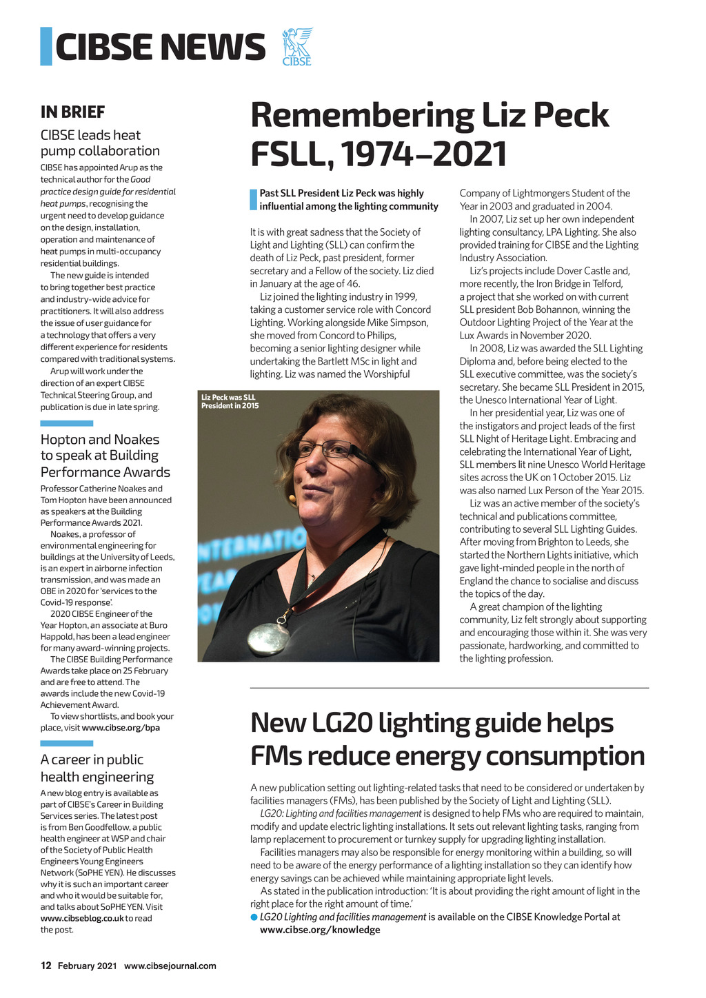CIBSE NEWS Remembering Liz Peck FSLL, 19742021 IN BRIEF CIBSE leads heat pump collaboration CIBSE has appointed Arup as the technical author for the Good practice design guide for residential heat pumps, recognising the urgent need to develop guidance on the design, installation, operation and maintenance of heat pumps in multi-occupancy residential buildings. The new guide is intended to bring together best practice and industry-wide advice for practitioners. It will also address the issue of user guidance for a technology that offers a very different experience for residents compared with traditional systems. Arup will work under the direction of an expert CIBSE Technical Steering Group, and publication is due in late spring. Past SLL President Liz Peck was highly influential among the lighting community It is with great sadness that the Society of Light and Lighting (SLL) can confirm the death of Liz Peck, past president, former secretary and a Fellow of the society. Liz died in January at the age of 46. Liz joined the lighting industry in 1999, taking a customer service role with Concord Lighting. Working alongside Mike Simpson, she moved from Concord to Philips, becoming a senior lighting designer while undertaking the Bartlett MSc in light and lighting. Liz was named the Worshipful Liz Peck was SLL President in 2015 Hopton and Noakes to speak at Building Performance Awards Professor Catherine Noakes and Tom Hopton have been announced as speakers at the Building Performance Awards 2021. Noakes, a professor of environmental engineering for buildings at the University of Leeds, is an expert in airborne infection transmission, and was made an OBE in 2020 for services to the Covid-19 response. 2020 CIBSE Engineer of the Year Hopton, an associate at Buro Happold, has been a lead engineer for many award-winning projects. The CIBSE Building Performance Awards take place on 25 February and are free to attend. The awards include the new Covid-19 Achievement Award. To view shortlists, and book your place, visit www.cibse.org/bpa A career in public health engineering A new blog entry is available as part of CIBSEs Career in Building Services series. The latest post is from Ben Goodfellow, a public health engineer at WSP and chair of the Society of Public Health Engineers Young Engineers Network (SoPHE YEN). He discusses why it is such an important career and who it would be suitable for, and talks about SoPHE YEN. Visit www.cibseblog.co.uk to read the post. Company of Lightmongers Student of the Year in 2003 and graduated in 2004. In 2007, Liz set up her own independent lighting consultancy, LPA Lighting. She also provided training for CIBSE and the Lighting Industry Association. Lizs projects include Dover Castle and, more recently, the Iron Bridge in Telford, a project that she worked on with current SLL president Bob Bohannon, winning the Outdoor Lighting Project of the Year at the Lux Awards in November 2020. In 2008, Liz was awarded the SLL Lighting Diploma and, before being elected to the SLL executive committee, was the societys secretary. She became SLL President in 2015, the Unesco International Year of Light. In her presidential year, Liz was one of the instigators and project leads of the first SLL Night of Heritage Light. Embracing and celebrating the International Year of Light, SLL members lit nine Unesco World Heritage sites across the UK on 1 October 2015. Liz was also named Lux Person of the Year 2015. Liz was an active member of the societys technical and publications committee, contributing to several SLL Lighting Guides. After moving from Brighton to Leeds, she started the Northern Lights initiative, which gave light-minded people in the north of England the chance to socialise and discuss the topics of the day. A great champion of the lighting community, Liz felt strongly about supporting and encouraging those within it. She was very passionate, hardworking, and committed to the lighting profession. New LG20 lighting guide helps FMs reduce energy consumption A new publication setting out lighting-related tasks that need to be considered or undertaken by facilities managers (FMs), has been published by the Society of Light and Lighting (SLL). LG20: Lighting and facilities management is designed to help FMs who are required to maintain, modify and update electric lighting installations. It sets out relevant lighting tasks, ranging from lamp replacement to procurement or turnkey supply for upgrading lighting installation. Facilities managers may also be responsible for energy monitoring within a building, so will need to be aware of the energy performance of a lighting installation so they can identify how energy savings can be achieved while maintaining appropriate light levels. As stated in the publication introduction: It is about providing the right amount of light in the right place for the right amount of time. L G20 Lighting and facilities management is available on the CIBSE Knowledge Portal at www.cibse.org/knowledge 12 February 2021 www.cibsejournal.com CIBSE Feb21 pp12-13 CIBSE News.indd 12 22/01/2021 17:47