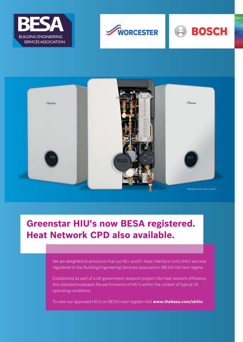 *Models shown KE+ and E+. Greenstar HIU s now BESA registered. Heat Network CPD also available. We are delighted to announce that our KE+ and E+ Heat Interface Units (HIU) are now registered to the Building Engineering Services Association (BESA) HIU test regime. Established as part of a UK government research project into heat network efficiency, this standard evaluates the performance of HIUs within the context of typical UK operating conditions. To view our approved HIUs on BESAs test register visit www.thebesa.com/ukhiu. 40 February 2021 www.cibsejournal.com p40.CIBSEMagFeb21.indd 40 18/01/2021 15:21