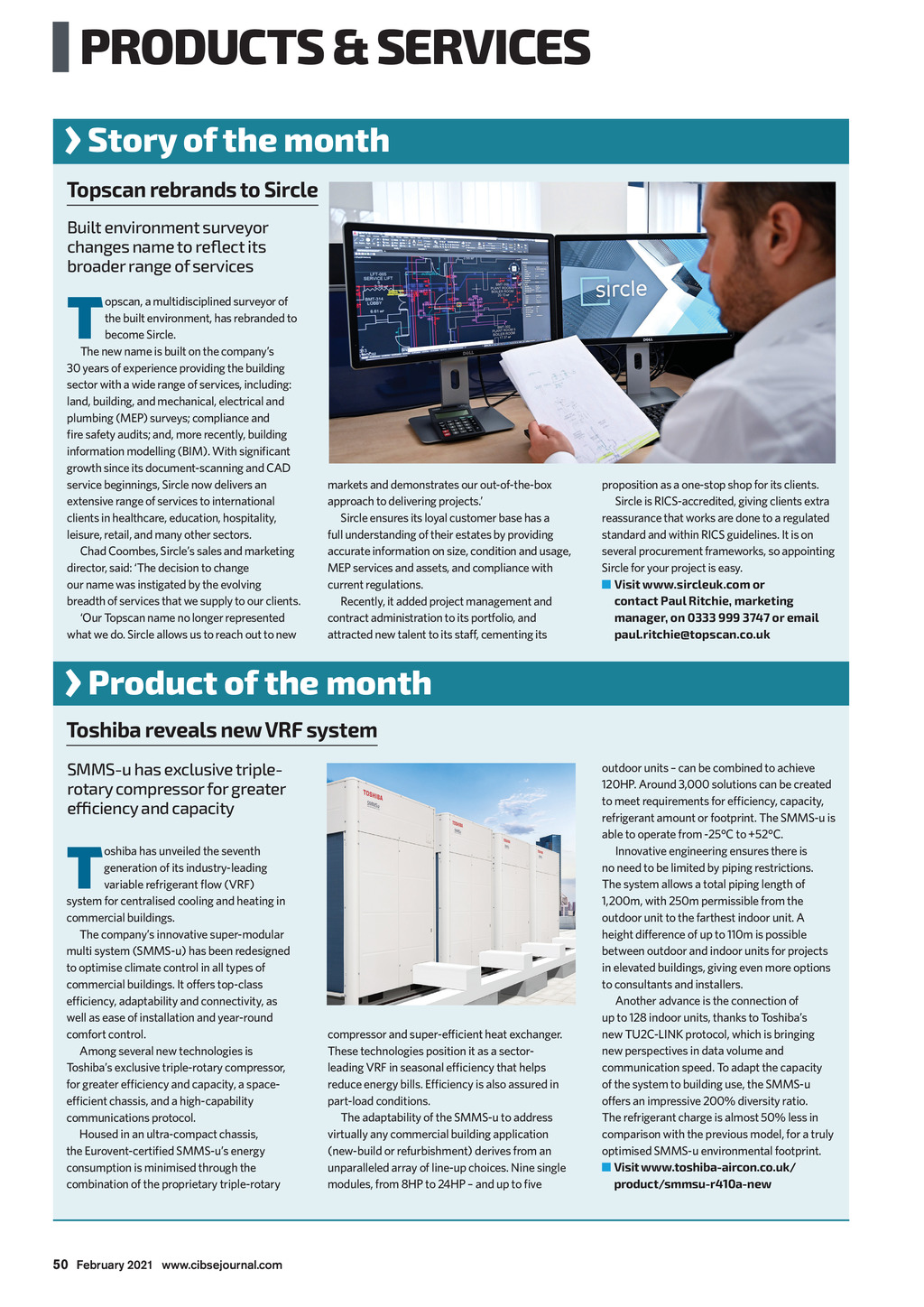 PRODUCTS & SERVICES Story of the month Topscan rebrands to Sircle Built environment surveyor changes name to reflect its broader range of services T opscan, a multidisciplined surveyor of the built environment, has rebranded to become Sircle. The new name is built on the companys 30 years of experience providing the building sector with a wide range of services, including: land, building, and mechanical, electrical and plumbing (MEP) surveys; compliance and fire safety audits; and, more recently, building information modelling (BIM). With significant growth since its document-scanning and CAD service beginnings, Sircle now delivers an extensive range of services to international clients in healthcare, education, hospitality, leisure, retail, and many other sectors. Chad Coombes, Sircles sales and marketing director, said: The decision to change our name was instigated by the evolving breadth of services that we supply to our clients. Our Topscan name no longer represented what we do. Sircle allows us to reach out to new markets and demonstrates our out-of-the-box approach to delivering projects. Sircle ensures its loyal customer base has a full understanding of their estates by providing accurate information on size, condition and usage, MEP services and assets, and compliance with current regulations. Recently, it added project management and contract administration to its portfolio, and attracted new talent to its staff, cementing its proposition as a one-stop shop for its clients. Sircle is RICS-accredited, giving clients extra reassurance that works are done to a regulated standard and within RICS guidelines. It is on several procurement frameworks, so appointing Sircle for your project is easy. Visit www.sircleuk.com or contact Paul Ritchie, marketing manager, on 0333 999 3747 or email paul.ritchie@topscan.co.uk Product of the month Toshiba reveals new VRF system SMMS-u has exclusive triplerotary compressor for greater efficiency and capacity T oshiba has unveiled the seventh generation of its industry-leading variable refrigerant flow (VRF) system for centralised cooling and heating in commercial buildings. The companys innovative super-modular multi system (SMMS-u) has been redesigned to optimise climate control in all types of commercial buildings. It offers top-class efficiency, adaptability and connectivity, as well as ease of installation and year-round comfort control. Among several new technologies is Toshibas exclusive triple-rotary compressor, for greater efficiency and capacity, a spaceefficient chassis, and a high-capability communications protocol. Housed in an ultra-compact chassis, the Eurovent-certified SMMS-us energy consumption is minimised through the combination of the proprietary triple-rotary compressor and super-efficient heat exchanger. These technologies position it as a sectorleading VRF in seasonal efficiency that helps reduce energy bills. Efficiency is also assured in part-load conditions. The adaptability of the SMMS-u to address virtually any commercial building application (new-build or refurbishment) derives from an unparalleled array of line-up choices. Nine single modules, from 8HP to 24HP and up to five outdoor units can be combined to achieve 120HP. Around 3,000 solutions can be created to meet requirements for efficiency, capacity, refrigerant amount or footprint. The SMMS-u is able to operate from -25C to +52C. Innovative engineering ensures there is no need to be limited by piping restrictions. The system allows a total piping length of 1,200m, with 250m permissible from the outdoor unit to the farthest indoor unit. A height difference of up to 110m is possible between outdoor and indoor units for projects in elevated buildings, giving even more options to consultants and installers. Another advance is the connection of up to 128 indoor units, thanks to Toshibas new TU2C-LINK protocol, which is bringing new perspectives in data volume and communication speed. To adapt the capacity of the system to building use, the SMMS-u offers an impressive 200% diversity ratio. The refrigerant charge is almost 50% less in comparison with the previous model, for a truly optimised SMMS-u environmental footprint. Visit www.toshiba-aircon.co.uk/ product/smmsu-r410a-new 50 February 2021 www.cibsejournal.com CIBSE Feb21 pp50-52 Products.indd 50 22/01/2021 15:54