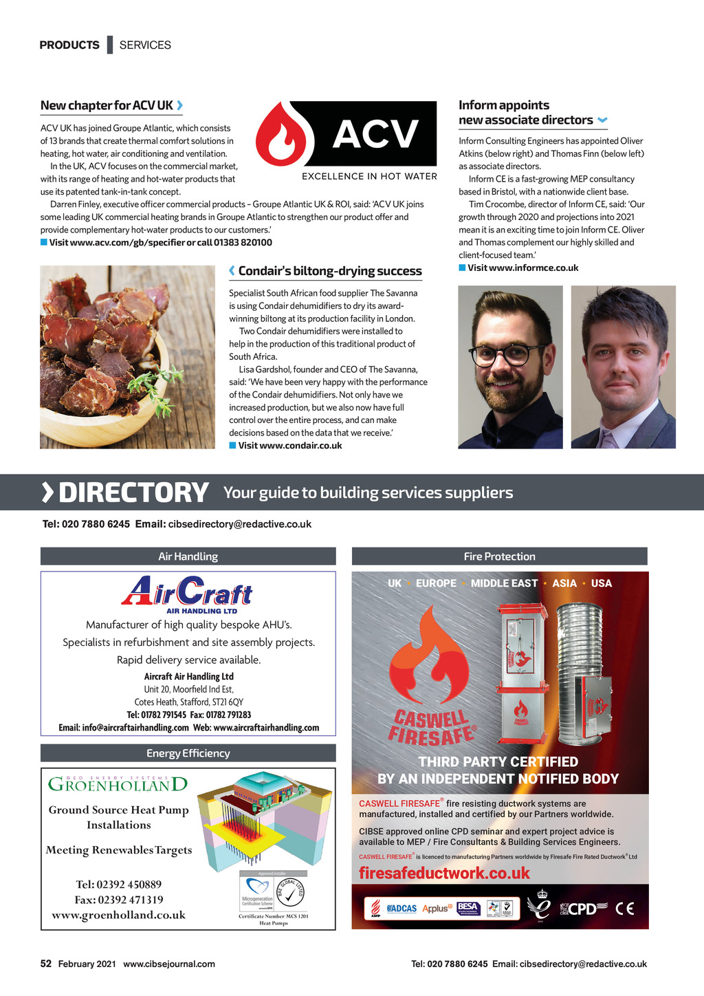 PRODUCTS | SERVICES New chapter for ACV UK ACV UK has joined Groupe Atlantic, which consists of 13 brands that create thermal comfort solutions in heating, hot water, air conditioning and ventilation. In the UK, ACV focuses on the commercial market, with its range of heating and hot-water products that use its patented tank-in-tank concept. Darren Finley, executive officer commercial products Groupe Atlantic UK & ROI, said: ACV UK joins some leading UK commercial heating brands in Groupe Atlantic to strengthen our product offer and provide complementary hot-water products to our customers. Visit www.acv.com/gb/specifier or call 01383 820100 Condairs biltong-drying success Inform appoints new associate directors Inform Consulting Engineers has appointed Oliver Atkins (below right) and Thomas Finn (below left) as associate directors. Inform CE is a fast-growing MEP consultancy based in Bristol, with a nationwide client base. Tim Crocombe, director of Inform CE, said: Our growth through 2020 and projections into 2021 mean it is an exciting time to join Inform CE. Oliver and Thomas complement our highly skilled and client-focused team. Visit www.informce.co.uk Specialist South African food supplier The Savanna is using Condair dehumidifiers to dry its awardwinning biltong at its production facility in London. Two Condair dehumidifiers were installed to help in the production of this traditional product of South Africa. Lisa Gardshol, founder and CEO of The Savanna, said: We have been very happy with the performance of the Condair dehumidifiers. Not only have we increased production, but we also now have full control over the entire process, and can make decisions based on the data that we receive. Visit www.condair.co.uk DIRECTORY Your guide guideto tobuilding buildingservices servicessuppliers suppliers Tel: 020 7880 Tel: 7880 6245 6245 Email: Email:cibsedirectory@redactive.co.uk cibsedirectory@redactive.co.uk Air Handling Fire Protection UK EUROPE MIDDLE EAST ASIA USA Manufacturer of high quality bespoke AHUs. Specialists in refurbishment and site assembly projects. Rapid delivery service available. Aircraft Air Handling Ltd Unit 20, Mooreld Ind Est, Cotes Heath, Stafford, ST21 6QY Tel: 01782 791545 Fax: 01782 791283 Email: info@aircraftairhandling.com Web: www.aircraftairhandling.com Energy Efficiency THIRD PARTY CERTIFIED BY AN INDEPENDENT NOTIFIED BODY &$6:(//),5(6$)(ILUHUHVLVWLQJGXFWZRUNV\VWHPVDUH CASWELL FIRESAFE fire resisting ductwork systems are PDQXIDFWXUHGLQVWDOOHGDQGFHUWLILHGE\RXU3DUWQHUVZRUOGZLGH manufactured, installed and certified by our Partners worldwide. &,%6(DSSURYHGRQOLQH&3 VHPLQDUDQGH[SHUWSURMHFWDGYLFHLV CIBSE approved online CPD seminar and expert project advice is DYDLODEOHWR0(3)LUH&RQVXOWDQWV %XLOGLQJ6HUYLFHV(QJLQHHUV available to MEP / Fire Consultants & Building Services Engineers. Ground Source Heat Pump Installations Meeting Renewables Targets Tel: 02392 450889 Fax: 02392 471319 www.groenholland.co.uk 1 February 52 February2021 2021 www.cibsejournal.com www.cibsejournal.com Groenholland 5x2.indd 1 Directory Feb 2021.indd 1 CIBSE Feb21 pp50-52 Products.indd 52 CASWELL FIRESAFE is licenced to manufacturing Partners worldwide by Firesafe Fire Rated Ductwork Ltd firesafeductwork.co.uk Certificate Number MCS 1201 Heat Pumps 27/1/09 09:40:29 Tel: 020 7880 6245 Email: cibsedirectory@redactive.co.uk 04/01/2021 15:54 14:23 22/01/2021