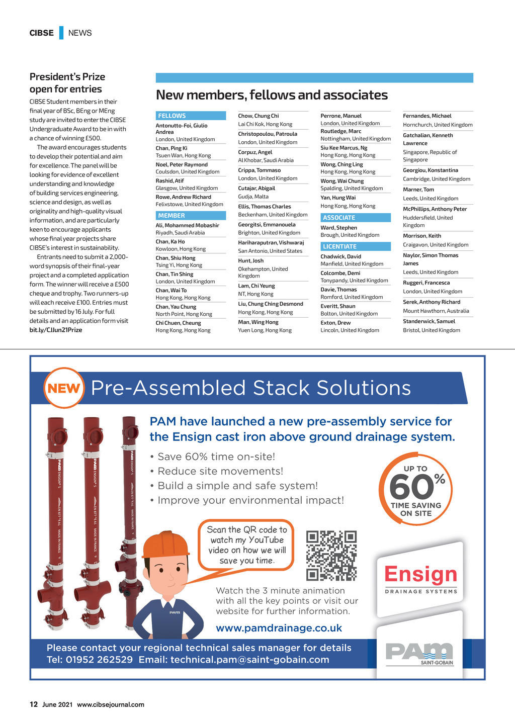 CIBSE | NEWS Presidents Prize open for entries New members, fellows and associates CIBSE Student members in their final year of BSc, BEng or MEng study are invited to enter the CIBSE Undergraduate Award to be in with a chance of winning 500. The award encourages students to develop their potential and aim for excellence. The panel will be looking for evidence of excellent understanding and knowledge of building services engineering, science and design, as well as originality and high-quality visual information, and are particularly keen to encourage applicants whose final year projects share CIBSEs interest in sustainability. Entrants need to submit a 2,000word synopsis of their final-year project and a completed application form. The winner will receive a 500 cheque and trophy. Two runners-up will each receive 100. Entries must be submitted by 16 July. For full details and an application form visit bit.ly/CJJun21Prize NEW FELLOWS Chow, Chung Chi Lai Chi Kok, Hong Kong Antonutto-Foi, Giulio Andrea London, United Kingdom Christopoulou, Patroula London, United Kingdom Chan, Ping Ki Tsuen Wan, Hong Kong Noel, Peter Raymond Coulsdon, United Kingdom Rashid, Atif Glasgow, United Kingdom Rowe, Andrew Richard Felixstowe, United Kingdom MEMBER Corpuz, Angel Al Khobar, Saudi Arabia Crippa, Tommaso London, United Kingdom Cutajar, Abigail Gudja, Malta Ellis, Thomas Charles Beckenham, United Kingdom Ali, Mohammed Mobashir Riyadh, Saudi Arabia Georgitsi, Emmanouela Brighton, United Kingdom Chan, Ka Ho Kowloon, Hong Kong Hariharaputran, Vishwaraj San Antonio, United States Chan, Shiu Hong Tsing Yi, Hong Kong Chan, Tin Shing London, United Kingdom Chan, Wai To Hong Kong, Hong Kong Hunt, Josh Okehampton, United Kingdom Lam, Chi Yeung NT, Hong Kong Perrone, Manuel London, United Kingdom Routledge, Marc Nottingham, United Kingdom Siu Kee Marcus, Ng Hong Kong, Hong Kong Fernandes, Michael Hornchurch, United Kingdom Gatchalian, Kenneth Lawrence Singapore, Republic of Singapore Wong, Ching Ling Hong Kong, Hong Kong Georgiou, Konstantina Wong, Wai Chung Spalding, United Kingdom Cambridge, United Kingdom Yan, Hung Wai Hong Kong, Hong Kong Leeds, United Kingdom Marner, Tom McPhillips, Anthony Peter ASSOCIATE Huddersfield, United Kingdom Ward, Stephen Brough, United Kingdom Morrison, Keith Craigavon, United Kingdom LICENTIATE Chadwick, David Manfield, United Kingdom Naylor, Simon Thomas James Colcombe, Demi Tonypandy, United Kingdom Leeds, United Kingdom Davie, Thomas Romford, United Kingdom London, United Kingdom Mount Hawthorn, Australia Chan, Yau Chung North Point, Hong Kong Liu, Chung Ching Desmond Hong Kong, Hong Kong Everitt, Shaun Bolton, United Kingdom Chi Chuen, Cheung Hong Kong, Hong Kong Man, Wing Hong Yuen Long, Hong Kong Exton, Drew Lincoln, United Kingdom Ruggeri, Francesca Serek, Anthony Richard Standerwick, Samuel Bristol, United Kingdom Pre-Assembled Stack Solutions PAM have launched a new pre-assembly service for the Ensign cast iron above ground drainage system. Save 60% time on-site! Reduce site movements! Build a simple and safe system! Improve your environmental impact! UP TO 60 % TIME SAVING ON SITE Watch the 3 minute animation with all the key points or visit our website for further information. www.pamdrainage.co.uk Please contact your regional technical sales manager for details Tel: 01952 262529 Email: technical.pam@saint-gobain.com 12 June 2021 www.cibsejournal.com CIBSE June 21 pp10-12 CIBSE News.indd 12 21/05/2021 15:38