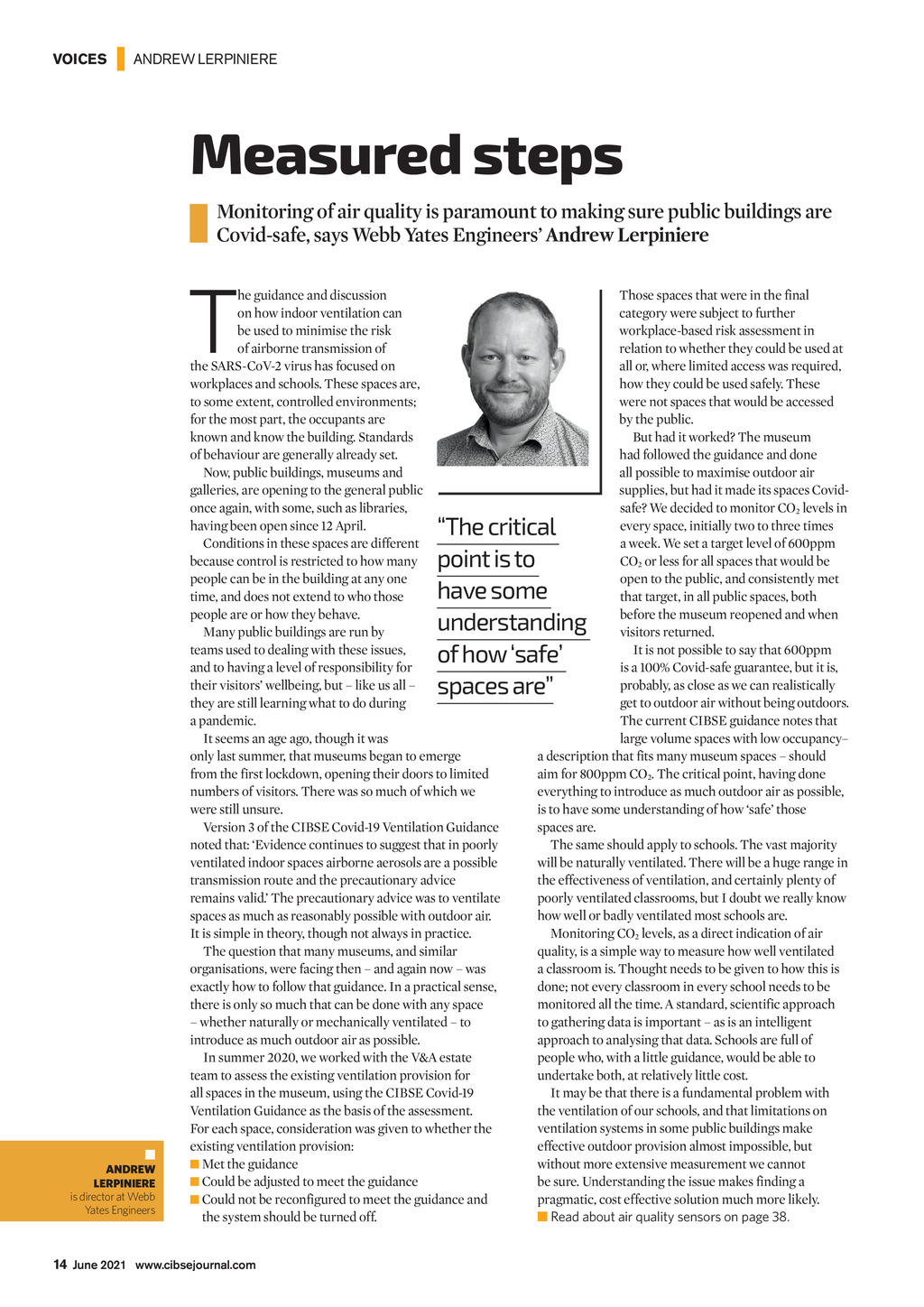 VOICES | ANDREW LERPINIERE Measured steps Monitoring of air quality is paramount to making sure public buildings are Covid-safe, says Webb Yates Engineers Andrew Lerpiniere T he guidance and discussion on how indoor ventilation can be used to minimise the risk of airborne transmission of the SARS-CoV-2 virus has focused on workplaces and schools. These spaces are, to some extent, controlled environments; for the most part, the occupants are known and know the building. Standards of behaviour are generally already set. Now, public buildings, museums and galleries, are opening to the general public once again, with some, such as libraries, having been open since 12 April. Conditions in these spaces are different because control is restricted to how many people can be in the building at any one time, and does not extend to who those people are or how they behave. Many public buildings are run by teams used to dealing with these issues, and to having a level of responsibility for their visitors wellbeing, but like us all they are still learning what to do during a pandemic. It seems an age ago, though it was only last summer, that museums began to emerge from the first lockdown, opening their doors to limited numbers of visitors. There was so much of which we were still unsure. Version 3 of the CIBSE Covid-19 Ventilation Guidance noted that: Evidence continues to suggest that in poorly ventilated indoor spaces airborne aerosols are a possible transmission route and the precautionary advice remains valid. The precautionary advice was to ventilate spaces as much as reasonably possible with outdoor air. It is simple in theory, though not always in practice. The question that many museums, and similar organisations, were facing then and again now was exactly how to follow that guidance. In a practical sense, there is only so much that can be done with any space whether naturally or mechanically ventilated to introduce as much outdoor air as possible. In summer 2020, we worked with the V&A estate team to assess the existing ventilation provision for all spaces in the museum, using the CIBSE Covid-19 Ventilation Guidance as the basis of the assessment. For each space, consideration was given to whether the existing ventilation provision: Met the guidance Could be adjusted to meet the guidance Could not be reconfigured to meet the guidance and the system should be turned off. Those spaces that were in the final category were subject to further workplace-based risk assessment in relation to whether they could be used at all or, where limited access was required, how they could be used safely. These were not spaces that would be accessed by the public. But had it worked? The museum had followed the guidance and done all possible to maximise outdoor air supplies, but had it made its spaces Covidsafe? We decided to monitor CO2 levels in every space, initially two to three times a week. We set a target level of 600ppm CO2 or less for all spaces that would be open to the public, and consistently met that target, in all public spaces, both before the museum reopened and when visitors returned. It is not possible to say that 600ppm is a 100% Covid-safe guarantee, but it is, probably, as close as we can realistically get to outdoor air without being outdoors. The current CIBSE guidance notes that large volume spaces with low occupancy a description that fits many museum spaces should aim for 800ppm CO2. The critical point, having done everything to introduce as much outdoor air as possible, is to have some understanding of how safe those spaces are. The same should apply to schools. The vast majority will be naturally ventilated. There will be a huge range in the effectiveness of ventilation, and certainly plenty of poorly ventilated classrooms, but I doubt we really know how well or badly ventilated most schools are. Monitoring CO2 levels, as a direct indication of air quality, is a simple way to measure how well ventilated a classroom is. Thought needs to be given to how this is done; not every classroom in every school needs to be monitored all the time. A standard, scientific approach to gathering data is important as is an intelligent approach to analysing that data. Schools are full of people who, with a little guidance, would be able to undertake both, at relatively little cost. It may be that there is a fundamental problem with the ventilation of our schools, and that limitations on ventilation systems in some public buildings make effective outdoor provision almost impossible, but without more extensive measurement we cannot be sure. Understanding the issue makes finding a pragmatic, cost effective solution much more likely. Read about air quality sensors on page 38. The critical point is to have some understanding of how safe spaces are ANDREW LERPINIERE is director at Webb Yates Engineers 14 June 2021 www.cibsejournal.com CIBSE June 21 pp14 Opinion.indd 14 21/05/2021 17:50