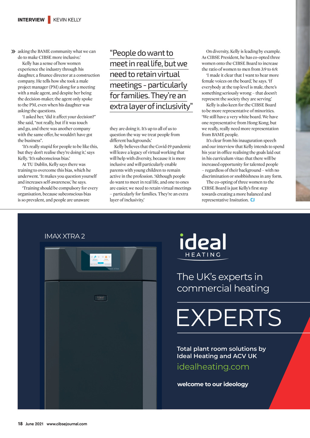 INTERVIEW | KEVIN KELLY asking the BAME community what we can do to make CIBSE more inclusive. Kelly has a sense of how women experience the industry through his daughter, a finance director at a construction company. He tells how she took a male project manager (PM) along for a meeting with a male agent, and despite her being the decision-maker, the agent only spoke to the PM, even when his daughter was asking the questions. I asked her, did it affect your decision? She said, not really, but if it was touch and go, and there was another company with the same offer, he wouldnt have got the business. Its really stupid for people to be like this, but they dont realise theyre doing it, says Kelly. Its subconscious bias. At TU Dublin, Kelly says there was training to overcome this bias, which he underwent. It makes you question yourself and increases self-awareness, he says. Training should be compulsory for every organisation, because subconscious bias is so prevalent, and people are unaware People do want to meet in real life, but we need to retain virtual meetings - particularly for families. Theyre an extra layer of inclusivity they are doing it. Its up to all of us to question the way we treat people from different backgrounds. Kelly believes that the Covid-19 pandemic will leave a legacy of virtual working that will help with diversity, because it is more inclusive and will particularly enable parents with young children to remain active in the profession. Although people do want to meet in real life, and one to ones are easier, we need to retain virtual meetings particularly for families. Theyre an extra layer of inclusivity. On diversity, Kelly is leading by example. As CIBSE President, he has co-opted three women onto the CIBSE Board to increase the ratio of women to men from 3:9 to 6:9. I made it clear that I want to hear more female voices on the board, he says. If everybody at the top level is male, theres something seriously wrong that doesnt represent the society they are serving. Kelly is also keen for the CIBSE Board to be more representative of minorities. We still have a very white board. We have one representative from Hong Kong, but we really, really need more representation from BAME people. Its clear from his inauguration speech and our interview that Kelly intends to spend his year in office realising the goals laid out in his curriculum vitae: that there will be increased opportunity for talented people regardless of their background with no discrimination or snobbishness in any form. The co-opting of three women to the CIBSE Board is just Kellys first step towards creating a more balanced and representative Insitution. CJ IMAX XTRA 2 The UKs experts in commercial heating EXPERTS Total plant room solutions by Ideal Heating and ACV UK idealheating.com welcome to our ideology 18 June 2021 www.cibsejournal.com CIBSE June 21 pp16-19 Kevin Kelly.indd 18 21/05/2021 15:47