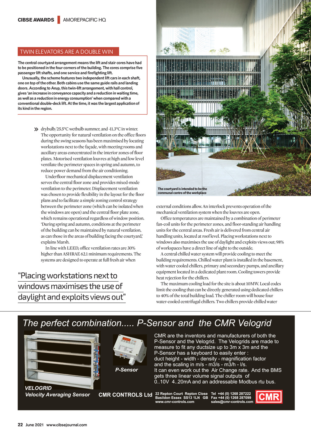 CIBSE AWARDS | AMOREPACIFIC HQ TWIN ELEVATORS ARE A DOUBLE WIN The central courtyard arrangement means the lift and stair cores have had Unusually, the scheme features two independent lift cars in each shaft, one on top of the other. Both cabins use the same guide rails and landing doors. According to Arup, this twin-lift arrangement, with hall control, gives an increase in conveyance capacity and a reduction in waiting time, as well as a reduction in energy consumption when compared with a conventional double-deck lift. At the time, it was the largest application of its kind in the region. drybulb/25.5C wetbulb summer, and -11.3C in winter. The opportunity for natural ventilation on the office floors during the swing seasons has been maximised by locating workstations next to the faade, with meeting rooms and auxiliary areas concentrated in the interior zones of floor plates. Motorised ventilation louvres at high and low level ventilate the perimeter spaces in spring and autumn, to reduce power demand from the air conditioning. Underfloor mechanical displacement ventilation serves the central floor zone and provides mixed-mode ventilation to the perimeter. Displacement ventilation was chosen to provide flexibility in the layout for the floor plans and to facilitate a simple zoning control strategy between the perimeter zone (which can be isolated when the windows are open) and the central floor plate zone, which remains operational regardless of window position. During spring and autumn, conditions at the perimeter of the building can be maintained by natural ventilation, as can those in the areas of building facing the courtyard, explains Marsh. In line with LEED, office ventilation rates are 30% higher than ASHRAE 62.1 minimum requirements. The systems are designed to operate at full fresh air when Placing workstations next to windows maximises the use of daylight and exploits views out The courtyard is intended to be the communal centre of the workplace external conditions allow. An interlock prevents operation of the mechanical ventilation system when the louvres are open. Office temperatures are maintained by a combination of perimeter fan-coil units for the perimeter zones, and floor-standing air handling units for the central areas. Fresh air is delivered from central air handling units, located at roof level. Placing workstations next to windows also maximises the use of daylight and exploits views out; 98% of workspaces have a direct line of sight to the outside. A central chilled water system will provide cooling to meet the building requirements. Chilled water plant is installed in the basement, with water cooled chillers, primary and secondary pumps, and ancillary equipment located in a dedicated plant room. Cooling towers provide heat rejection for the chillers. The maximum cooling load for the site is about 10MW. Local codes limit the cooling that can be directly generated using dedicated chillers to 40% of the total building load. The chiller room will house four water-cooled centrifugal chillers. Two chillers provide chilled water 22 June 2021 www.cibsejournal.com CIBSE June 21 pp20-23 Amorepacific.indd 22 21/05/2021 15:59