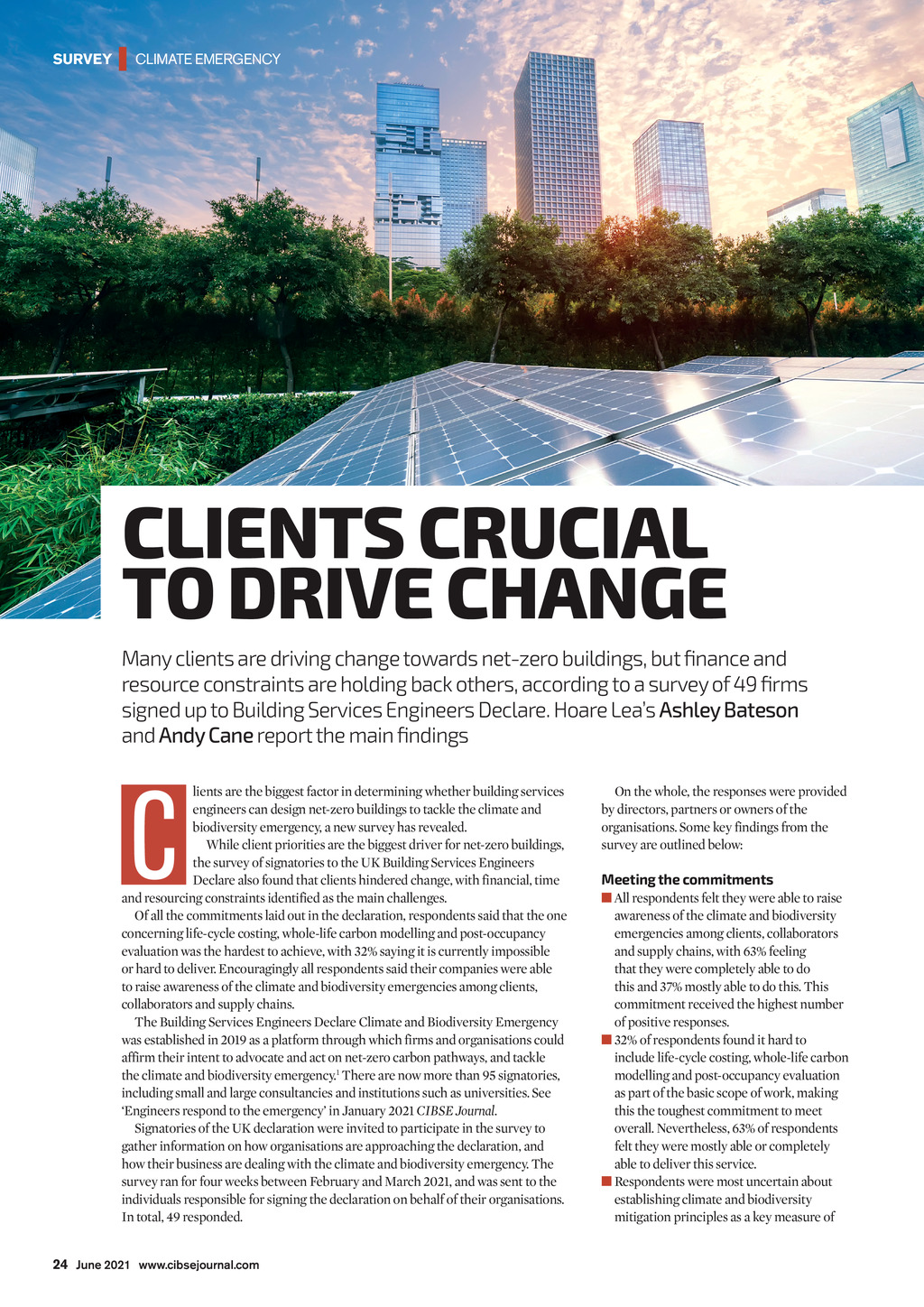 SURVEY | CLIMATE EMERGENCY CLIENTS CRUCIAL TO DRIVE CHANGE Many clients are driving change towards net-zero buildings, but finance and resource constraints are holding back others, according to a survey of 49 firms signed up to Building Services Engineers Declare. Hoare Leas Ashley Bateson and Andy Cane report the main findings C lients are the biggest factor in determining whether building services engineers can design net-zero buildings to tackle the climate and biodiversity emergency, a new survey has revealed. While client priorities are the biggest driver for net-zero buildings, the survey of signatories to the UK Building Services Engineers Declare also found that clients hindered change, with financial, time and resourcing constraints identified as the main challenges. Of all the commitments laid out in the declaration, respondents said that the one concerning life-cycle costing, whole-life carbon modelling and post-occupancy evaluation was the hardest to achieve, with 32% saying it is currently impossible or hard to deliver. Encouragingly all respondents said their companies were able to raise awareness of the climate and biodiversity emergencies among clients, collaborators and supply chains. The Building Services Engineers Declare Climate and Biodiversity Emergency was established in 2019 as a platform through which firms and organisations could affirm their intent to advocate and act on net-zero carbon pathways, and tackle the climate and biodiversity emergency.1 There are now more than 95 signatories, including small and large consultancies and institutions such as universities. See Engineers respond to the emergency in January 2021 CIBSE Journal. Signatories of the UK declaration were invited to participate in the survey to gather information on how organisations are approaching the declaration, and how their business are dealing with the climate and biodiversity emergency. The survey ran for four weeks between February and March 2021, and was sent to the individuals responsible for signing the declaration on behalf of their organisations. In total, 49 responded. On the whole, the responses were provided by directors, partners or owners of the organisations. Some key findings from the survey are outlined below: Meeting the commitments All respondents felt they were able to raise awareness of the climate and biodiversity emergencies among clients, collaborators and supply chains, with 63% feeling that they were completely able to do this and 37% mostly able to do this. This commitment received the highest number of positive responses. 32% of respondents found it hard to include life-cycle costing, whole-life carbon modelling and post-occupancy evaluation as part of the basic scope of work, making this the toughest commitment to meet overall. Nevertheless, 63% of respondents felt they were mostly able or completely able to deliver this service. Respondents were most uncertain about establishing climate and biodiversity mitigation principles as a key measure of 24 June 2021 www.cibsejournal.com CIBSE June 21 pp24-26 Building services declare.indd 24 21/05/2021 15:49