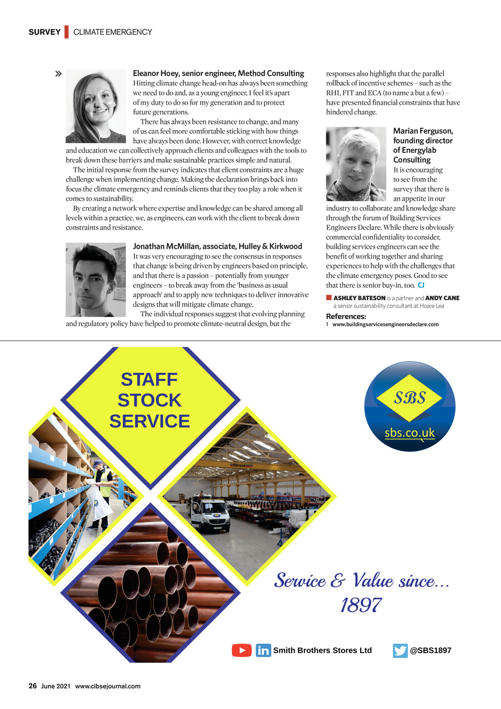 SURVEY | CLIMATE EMERGENCY Eleanor Hoey, senior engineer, Method Consulting Hitting climate change head-on has always been something we need to do and, as a young engineer, I feel its apart of my duty to do so for my generation and to protect future generations. There has always been resistance to change, and many of us can feel more comfortable sticking with how things have always been done. However, with correct knowledge and education we can collectively approach clients and colleagues with the tools to break down these barriers and make sustainable practices simple and natural. The initial response from the survey indicates that client constraints are a huge challenge when implementing change. Making the declaration brings back into focus the climate emergency and reminds clients that they too play a role when it comes to sustainability. By creating a network where expertise and knowledge can be shared among all levels within a practice, we, as engineers, can work with the client to break down constraints and resistance. Jonathan McMillan, associate, Hulley & Kirkwood It was very encouraging to see the consensus in responses that change is being driven by engineers based on principle, and that there is a passion potentially from younger engineers to break away from the business as usual approach and to apply new techniques to deliver innovative designs that will mitigate climate change. The individual responses suggest that evolving planning and regulatory policy have helped to promote climate-neutral design, but the responses also highlight that the parallel rollback of incentive schemes such as the RHI, FIT and ECA (to name a but a few) have presented financial constraints that have hindered change. Marian Ferguson, founding director of Energylab Consulting It is encouraging to see from the survey that there is an appetite in our industry to collaborate and knowledge share through the forum of Building Services Engineers Declare. While there is obviously commercial confidentiality to consider, building services engineers can see the benefit of working together and sharing experiences to help with the challenges that the climate emergency poses. Good to see that there is senior buy-in, too. CJ ASHLEY BATESON is a partner and ANDY CANE a senior sustainability consultant at Hoare Lea References: 1 www.buildingservicesengineersdeclare.com STAFF STOCK SERVICE Service & Value since... 1897 Smith Brothers Stores Ltd @SBS1897 26 June 2021 www.cibsejournal.com CIBSE June 21 pp24-26 Building services declare.indd 26 21/05/2021 15:49