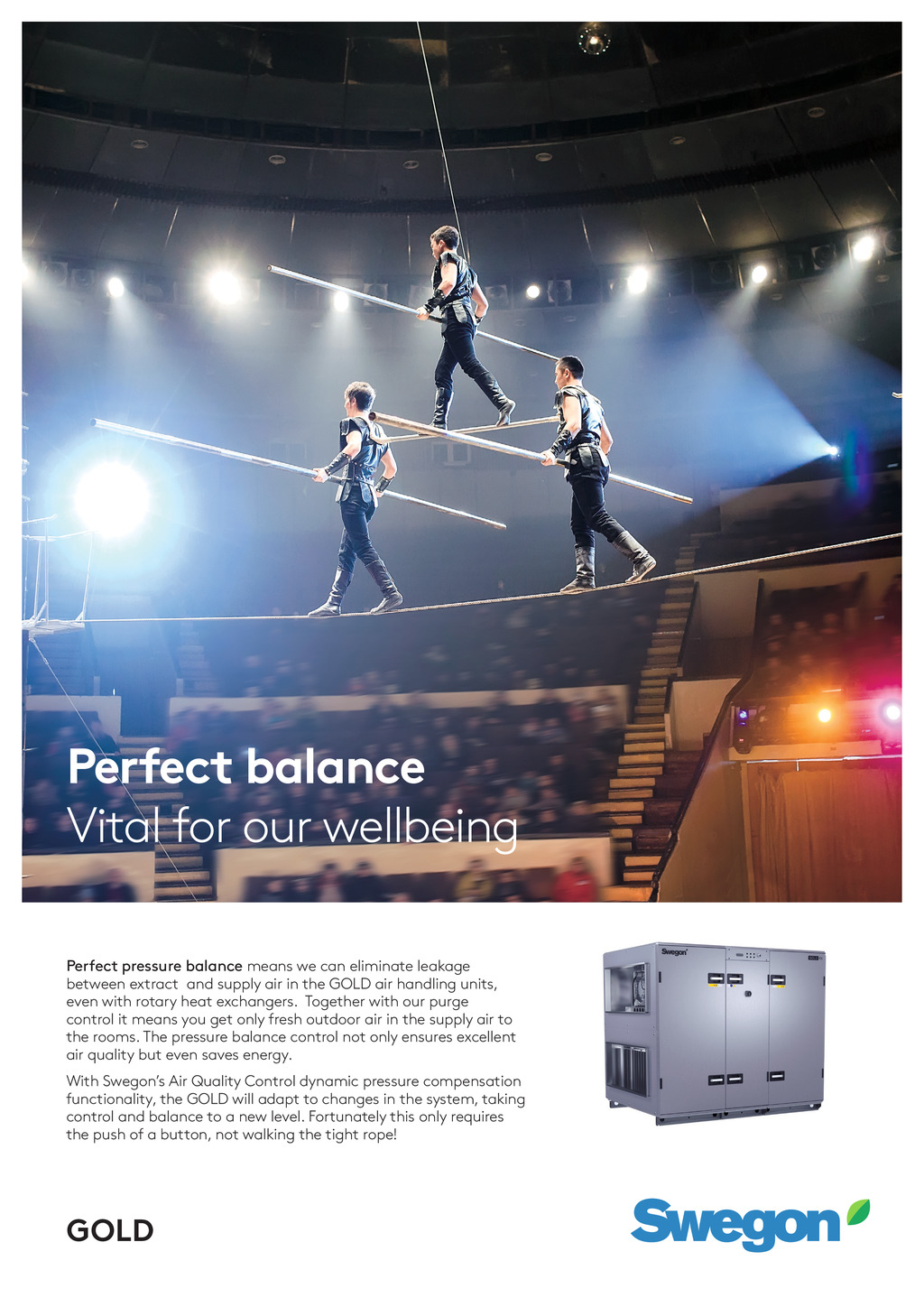 Perfect balance Vital for our wellbeing Perfect pressure balance means we can eliminate leakage between extract and supply air in the GOLD air handling units, even with rotary heat exchangers. Together with our purge control it means you get only fresh outdoor air in the supply air to the rooms. The pressure balance control not only ensures excellent air quality but even saves energy. With Swegons Air Quality Control dynamic pressure compensation functionality, the GOLD will adapt to changes in the system, taking control and balance to a new level. Fortunately this only requires the push of a button, not walking the tight rope! GOLD 46 June 2021 www.cibsejournal.com p46.CIBSEMagJune21.indd 46 17/05/2021 14:21