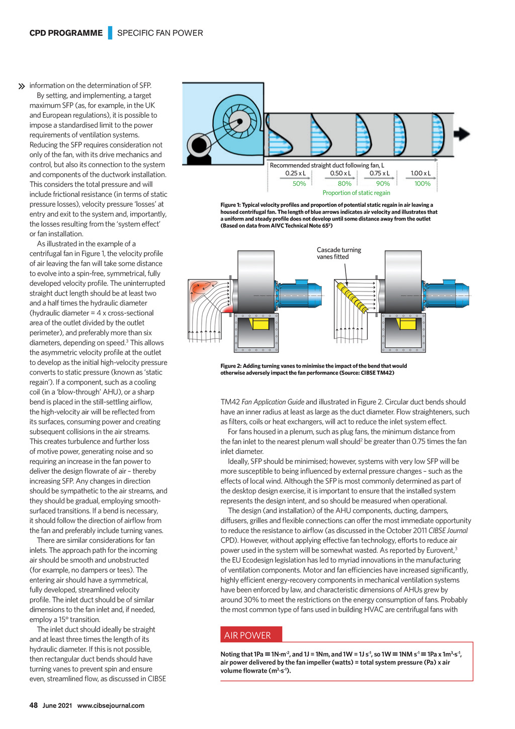 CPD PROGRAMME | SPECIFIC FAN POWER information on the determination of SFP. By setting, and implementing, a target maximum SFP (as, for example, in the UK and European regulations), it is possible to impose a standardised limit to the power requirements of ventilation systems. Reducing the SFP requires consideration not only of the fan, with its drive mechanics and control, but also its connection to the system and components of the ductwork installation. This considers the total pressure and will include frictional resistance (in terms of static pressure losses), velocity pressure losses at entry and exit to the system and, importantly, the losses resulting from the system effect or fan installation. As illustrated in the example of a Recommended straight duct following fan, L 0.25 x L 0.50 x L 0.75 x L 50% 80% 90% Proportion of static regain 1.00 x L 100% ) 2 Cascade turning of air leaving the fan will take some distance to evolve into a spin-free, symmetrical, fully straight duct length should be at least two and a half times the hydraulic diameter (hydraulic diameter = 4 x cross-sectional area of the outlet divided by the outlet perimeter), and preferably more than six diameters, depending on speed.3 This allows to develop as the initial high-velocity pressure converts to static pressure (known as static regain). If a component, such as a cooling coil (in a blow-through AHU), or a sharp TM42 Fan Application Guide have an inner radius at least as large as the duct diameter. Flow straighteners, such its surfaces, consuming power and creating subsequent collisions in the air streams. This creates turbulence and further loss of motive power, generating noise and so requiring an increase in the fan power to For fans housed in a plenum, such as plug fans, the minimum distance from the fan inlet to the nearest plenum wall should2 be greater than 0.75 times the fan inlet diameter. Ideally, SFP should be minimised; however, systems with very low SFP will be increasing SFP. Any changes in direction should be sympathetic to the air streams, and they should be gradual, employing smoothsurfaced transitions. If a bend is necessary, effects of local wind. Although the SFP is most commonly determined as part of the desktop design exercise, it is important to ensure that the installed system represents the design intent, and so should be measured when operational. The design (and installation) of the AHU components, ducting, dampers, the fan and preferably include turning vanes. There are similar considerations for fan inlets. The approach path for the incoming air should be smooth and unobstructed (for example, no dampers or tees). The entering air should have a symmetrical, fully developed, streamlined velocity dimensions to the fan inlet and, if needed, employ a 15 transition. The inlet duct should ideally be straight and at least three times the length of its hydraulic diameter. If this is not possible, then rectangular duct bends should have turning vanes to prevent spin and ensure CIBSE Journal power used in the system will be somewhat wasted. As reported by Eurovent,3 the EU Ecodesign legislation has led to myriad innovations in the manufacturing have been enforced by law, and characteristic dimensions of AHUs grew by around 30% to meet the restrictions on the energy consumption of fans. Probably Noting that 1Pa 1Nm-2, and 1J = 1Nm, and 1W = 1J s-1, so 1W 1NM s-1 1Pa x 1m3s-1, air power delivered by the fan impeller (watts) = total system pressure (Pa) x air 3 -1 s ). 48 June 2021 www.cibsejournal.com CIBSE June 21 pp47-50 CPD Supp 181.indd 48 21/05/2021 16:27