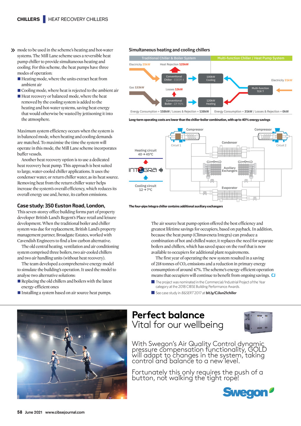 CHILLERS | HEAT RECOVERY CHILLERS mode to be used in the schemes heating and hot-water systems. The Mill Lane scheme uses a reversible heat pump chiller to provide simultaneous heating and cooling. For this scheme, the heat pumps have three modes of operation: Heating mode, where the units extract heat from ambient air Cooling mode, where heat is rejected to the ambient air Heat recovery or balanced mode, where the heat removed by the cooling system is added to the heating and hot-water systems, saving heat energy that would otherwise be wasted by jettisoning it into the atmosphere. Simultaneous heating and cooling chillers Long-term operating costs are lower than the chiller-boiler combination, with up to 40% energy savings Maximum system efficiency occurs when the system is in balanced mode, when heating and cooling demands are matched. To maximise the time the system will operate in this mode, the Mill Lane scheme incorporates buffer vessels. Another heat recovery option is to use a dedicated heat recovery heat pump. This approach is best suited to large, water-cooled chiller applications. It uses the condenser water, or return chiller water, as its heat source. Removing heat from the return chiller water helps increase the systems overall efficiency, which reduces its overall energy use and, hence, its carbon emissions. Case study: 350 Euston Road, London, This seven-storey office building forms part of property developer British Lands Regents Place retail and leisure development. When the traditional boiler and chiller system was due for replacement, British Lands property management partner, Broadgate Estates, worked with Cavendish Engineers to find a low carbon alternative. The old central heating, ventilation and air conditioning system comprised three boilers, two air-cooled chillers and two air handling units (without heat recovery). The team developed a comprehensive energy model to simulate the buildings operation. It used the model to analyse two alternative solutions: Replacing the old chillers and boilers with the latest energy-efficient ones Installing a system based on air source heat pumps. The four-pipe Integra chiller contains additional auxiliary exchangers The air source heat pump option offered the best efficiency and greatest lifetime savings for occupiers, based on payback. In addition, because the heat pump (Climaveneta Integra) can produce a combination of hot and chilled water, it replaces the need for separate boilers and chillers, which has saved space on the roof that is now available to occupiers for additional plant requirements. The first year of operating the new system resulted in a saving of 218 tonnes of CO2 emissions and a reduction in primary energy consumption of around 47%. The schemes energy-efficient operation means that occupiers will continue to benefit from ongoing savings. CJ The project was nominated in the Commercial/Industrial Project of the Year category at the 2018 CIBSE Building Performance Awards. See case study in B&SERT 2017 at bit.ly/CJJun21chiller Vital for our wellbeing With Swegons g Air Qualityy Control dynamic y pressure compensation p p functionality, y, GOLD will adapt p to changes g in the system, y taking control and balance to a new level. Fortunatelyy this onlyy requires q the push p of a button, not walking the tight rope! 58 June 2021 www.cibsejournal.com CIBSE June 21 pp57-58 Heat recovery chiller.indd 58 21/05/2021 16:29