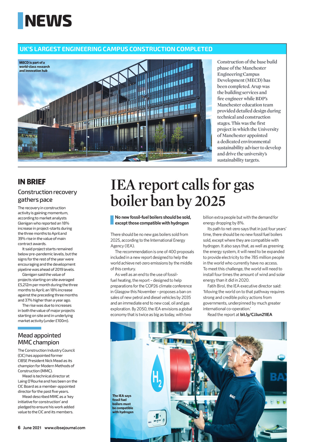 NEWS UKS LARGEST ENGINEERING CAMPUS CONSTRUCTION COMPLETED Construction of the base build phase of the Manchester Engineering Campus Development (MECD) has been completed. Arup was the building services and MECD is part of a world-class research and innovation hub Manchester education team provided detailed design during technical and construction project in which the University of Manchester appointed a dedicated environmental sustainability adviser to develop sustainability targets. IN BRIEF Construction recovery gathers pace The recovery in construction activity is gaining momentum, according to market analysts Glenigan who reported an 18% increase in project-starts during the three months to April and 39% rise in the value of main contract awards. It said project starts remained below pre-pandemic levels, but the signs for the rest of the year were encouraging and the development pipeline was ahead of 2019 levels. Glenigan said the value of projects starting on site averaged 5,212m per month during the three months to April; an 18% increase against the preceding three months and 37% higher than a year ago. The rise was due to increases in both the value of major projects starting on site and in underlying market activity (under 100m). IEA report calls for gas boiler ban by 2025 No new fossil-fuel boilers should be sold, except those compatible with hydrogen There should be no new gas boilers sold from 2025, according to the International Energy Agency (IEA). The recommendation is one of 400 proposals included in a new report designed to help the world achieve net-zero emissions by the middle of this century. As well as an end to the use of fossilfuel heating, the report designed to help preparations for the COP26 climate conference in Glasgow this November proposes a ban on sales of new petrol and diesel vehicles by 2035 and an immediate end to new coal, oil and gas exploration. By 2050, the IEA envisions a global economy that is twice as big as today, with two billion extra people but with the demand for energy dropping by 8%. Its path to net-zero says that in just four years time, there should be no new fossil fuel boilers sold, except where they are compatible with hydrogen. It also says that, as well as greening the energy system, it will need to be expanded to provide electricity to the 785 million people in the world who currently have no access. To meet this challenge, the world will need to install four times the amount of wind and solar energy than it did in 2020. Fatih Birol, the IEA executive director said: Moving the world on to that pathway requires strong and credible policy actions from governments, underpinned by much greater international co-operation. Read the report at bit.ly/CJJun21IEA Mead appointed MMC champion The Construction Industry Council (CIC) has appointed former CIBSE President Nick Mead as its champion for Modern Methods of Construction (MMC). Mead is technical director at Laing ORourke and has been on the CIC Board as a member-appointed director for the past five years. Mead described MMC as a key initiative for construction and pledged to ensure his work added value to the CIC and its members. The IEA says fossil fuel boilers must be compatible with hydrogen 6 June 2021 www.cibsejournal.com CIBSE June 21 pp06-07 News.indd 6 21/05/2021 12:16
