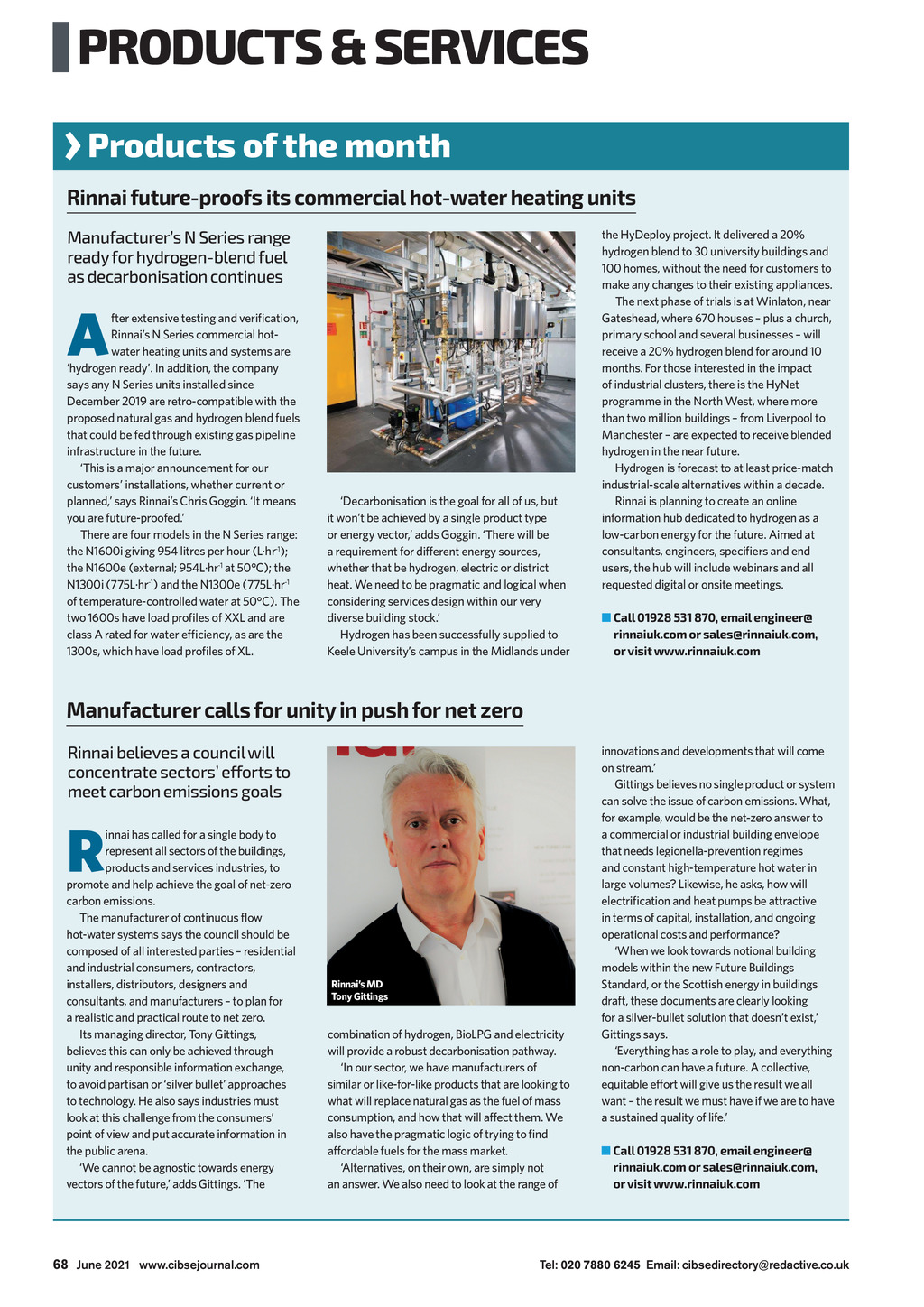 PRODUCTS & SERVICES Products of the month Rinnai future-proofs its commercial hot-water heating units Manufacturers N Series range ready for hydrogen-blend fuel as decarbonisation continues A ); Call 01928 531 870, email engineer@ rinnaiuk.com or sales@rinnaiuk.com, or visit www.rinnaiuk.com Manufacturer calls for unity in push for net zero Rinnai believes a council will concentrate sectors efforts to meet carbon emissions goals R Rinnais MD Tony Gittings Call 01928 531 870, email engineer@ rinnaiuk.com or sales@rinnaiuk.com, or visit www.rinnaiuk.com 68 June 2021 www.cibsejournal.com CIBSE June 21 pp68-71 Products.indd 68 Tel: 020 7880 6245 Email: cibsedirectory@redactive.co.uk 21/05/2021 16:34