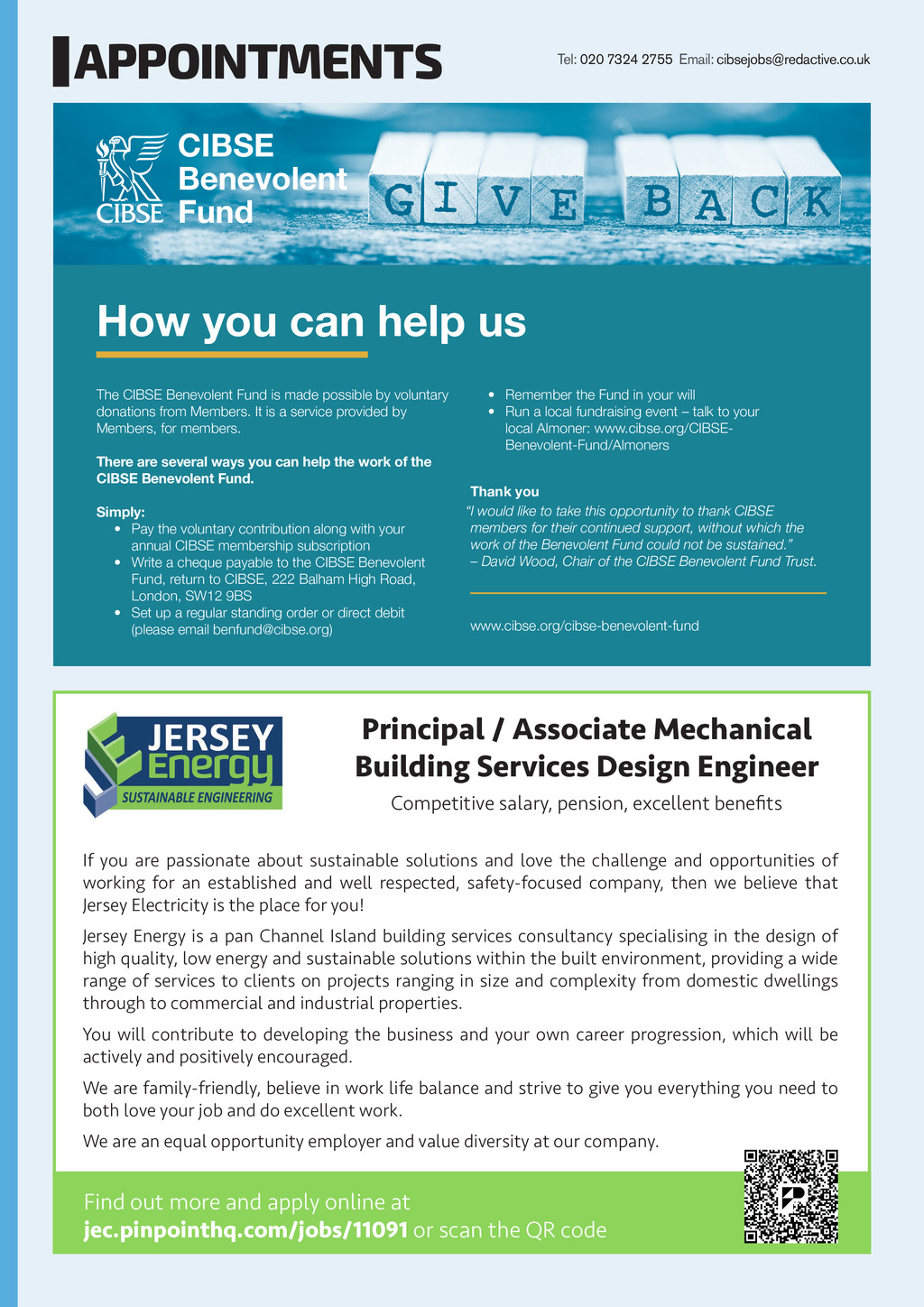 APPOINTMENTS Tel: 020 7324 2755 Email: cibsejobs@redactive.co.uk CIBSE Benevolent Fund How you can help us The CIBSE Benevolent Fund is made possible by voluntary donations from Members. It is a service provided by Members, for members. There are several ways you can help the work of the CIBSE Benevolent Fund. Simply: Pay the voluntary contribution along with your annual CIBSE membership subscription Write a cheque payable to the CIBSE Benevolent Fund, return to CIBSE, 222 Balham High Road, London, SW12 9BS Set up a regular standing order or direct debit (please email benfund@cibse.org) Remember the Fund in your will Run a local fundraising event talk to your local Almoner: www.cibse.org/CIBSEBenevolent-Fund/Almoners Thank you I would like to take this opportunity to thank CIBSE members for their continued support, without which the work of the Benevolent Fund could not be sustained. David Wood, Chair of the CIBSE Benevolent Fund Trust. www.cibse.org/cibse-benevolent-fund Principal / Associate Mechanical Building Services Design Engineer Competitive salary, pension, excellent benets If you are passionate about sustainable solutions and love the challenge and opportunities of working for an established and well respected, safety-focused company, then we believe that Jersey Electricity is the place for you! Jersey Energy is a pan Channel Island building services consultancy specialising in the design of high quality, low energy and sustainable solutions within the built environment, providing a wide range of services to clients on projects ranging in size and complexity from domestic dwellings through to commercial and industrial properties. You will contribute to developing the business and your own career progression, which will be actively and positively encouraged. We are family-friendly, believe in work life balance and strive to give you everything you need to both love your job and do excellent work. We are an equal opportunity employer and value diversity at our company. Find out more and apply online at jec.pinpointhq.com/jobs/11091 or scan the QR code 72 June 2021 www.cibsejournal.com p72.CIBSEMagJune21.indd 72 19/05/2021 09:56