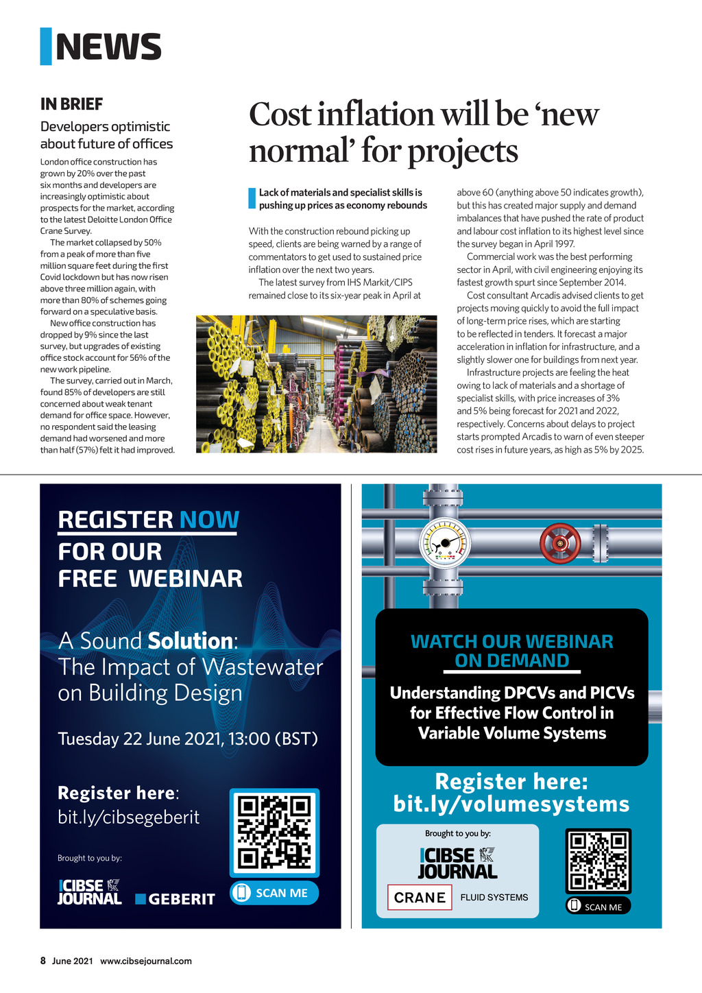 NEWS IN BRIEF Developers optimistic about future of offices London office construction has grown by 20% over the past six months and developers are increasingly optimistic about prospects for the market, according to the latest Deloitte London Office Crane Survey. The market collapsed by 50% from a peak of more than five million square feet during the first Covid lockdown but has now risen above three million again, with more than 80% of schemes going forward on a speculative basis. New office construction has dropped by 9% since the last survey, but upgrades of existing office stock account for 56% of the new work pipeline. The survey, carried out in March, found 85% of developers are still concerned about weak tenant demand for office space. However, no respondent said the leasing demand had worsened and more than half (57%) felt it had improved. Cost inflation will be new normal for projects Lack of materials and specialist skills is pushing up prices as economy rebounds but this has created major supply and demand With the construction rebound picking up speed, clients are being warned by a range of commentators to get used to sustained price owing to lack of materials and a shortage of specialist skills, with price increases of 3% REGISTER NOW FOR OUR FREE WEBINAR A Sound Solution: The Impact of Wastewater on Building Design Tuesday 22 June 2021, 13:00 (BST) WATCH OUR WEBINAR ON DEMAND Understanding DPCVs and PICVs for Effective Flow Control in Variable Volume Systems Register here: bit.ly/volumesystems Register here : bit.ly/cibsegeberit Brought to you by: Brought to you by: SCAN ME SCAN ME 8 June 2021 www.cibsejournal.com CIBSE June 21 pp08-09 News.indd 8 21/05/2021 12:21
