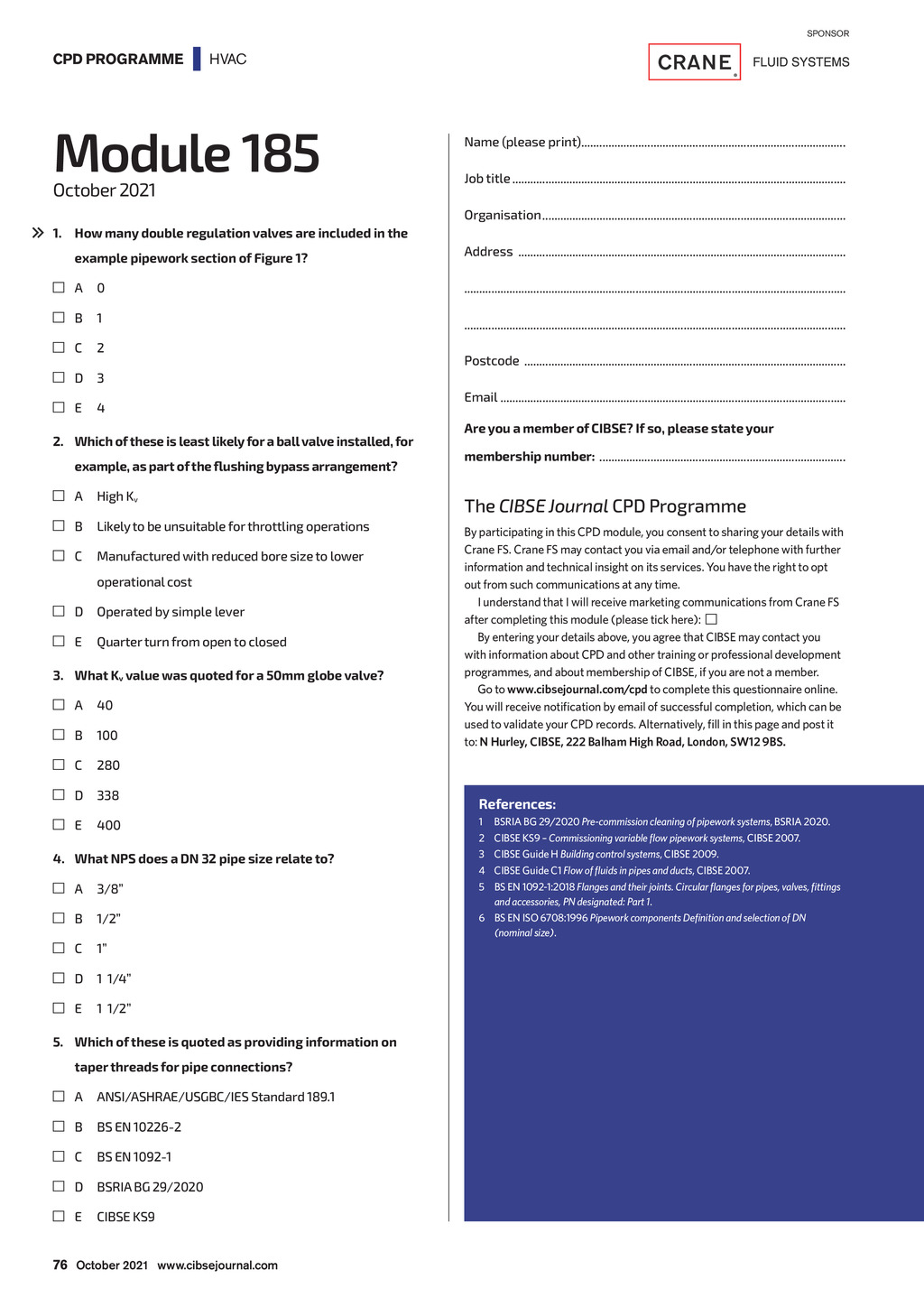 SPONSOR CPD PROGRAMME | HVAC Module 185 October 2021 Name (please print)........................................................................................ Job title ............................................................................................................... Organisation ..................................................................................................... 1. How many double regulation valves are included in the example pipework section of Figure 1? Address ............................................................................................................. A 0 ............................................................................................................................... B 1 ............................................................................................................................... C 2 D 3 E 4 2. Which of these is least likely for a ball valve installed, for example, as part of the flushing bypass arrangement? Postcode ........................................................................................................... Email ................................................................................................................... Are you a member of CIBSE? If so, please state your membership number: .................................................................................. A High Kv The CIBSE Journal CPD Programme B Likely to be unsuitable for throttling operations C Manufactured with reduced bore size to lower By participating in this CPD module, you consent to sharing your details with Crane FS. Crane FS may contact you via email and/or telephone with further information and technical insight on its services. You have the right to opt out from such communications at any time. I understand that I will receive marketing communications from Crane FS after completing this module (please tick here): By entering your details above, you agree that CIBSE may contact you with information about CPD and other training or professional development programmes, and about membership of CIBSE, if you are not a member. Go to www.cibsejournal.com/cpd to complete this questionnaire online. operational cost D Operated by simple lever E Quarter turn from open to closed 3. What Kv value was quoted for a 50mm globe valve? A 40 B 100 C 280 D 338 E 400 4. What NPS does a DN 32 pipe size relate to? A 3/8 B 1/2 C 1 D 1 1/4 E 1 1/2 used to validate your CPD records. Alternatively, to: N Hurley, CIBSE, 222 Balham High Road, London, SW12 9BS. References: 1 2 3 4 5 BSRIA BG 29/2020 Pre-commission cleaning of pipework systems, BSRIA 2020. CIBSE KS9 , CIBSE 2007. CIBSE Guide H Building control systems, CIBSE 2009. CIBSE Guide C1 , CIBSE 2007. BS EN 1092-1:2018 . 6 BS EN ISO 6708:1996 (nominal size). 5. Which of these is quoted as providing information on taper threads for pipe connections? A ANSI/ASHRAE/USGBC/IES Standard 189.1 B BS EN 10226-2 C BS EN 1092-1 D BSRIA BG 29/2020 E CIBSE KS9 76 October 2021 www.cibsejournal.com CIBSE Oct21 pp73-76 CPD 185.indd 76 24/09/2021 14:28