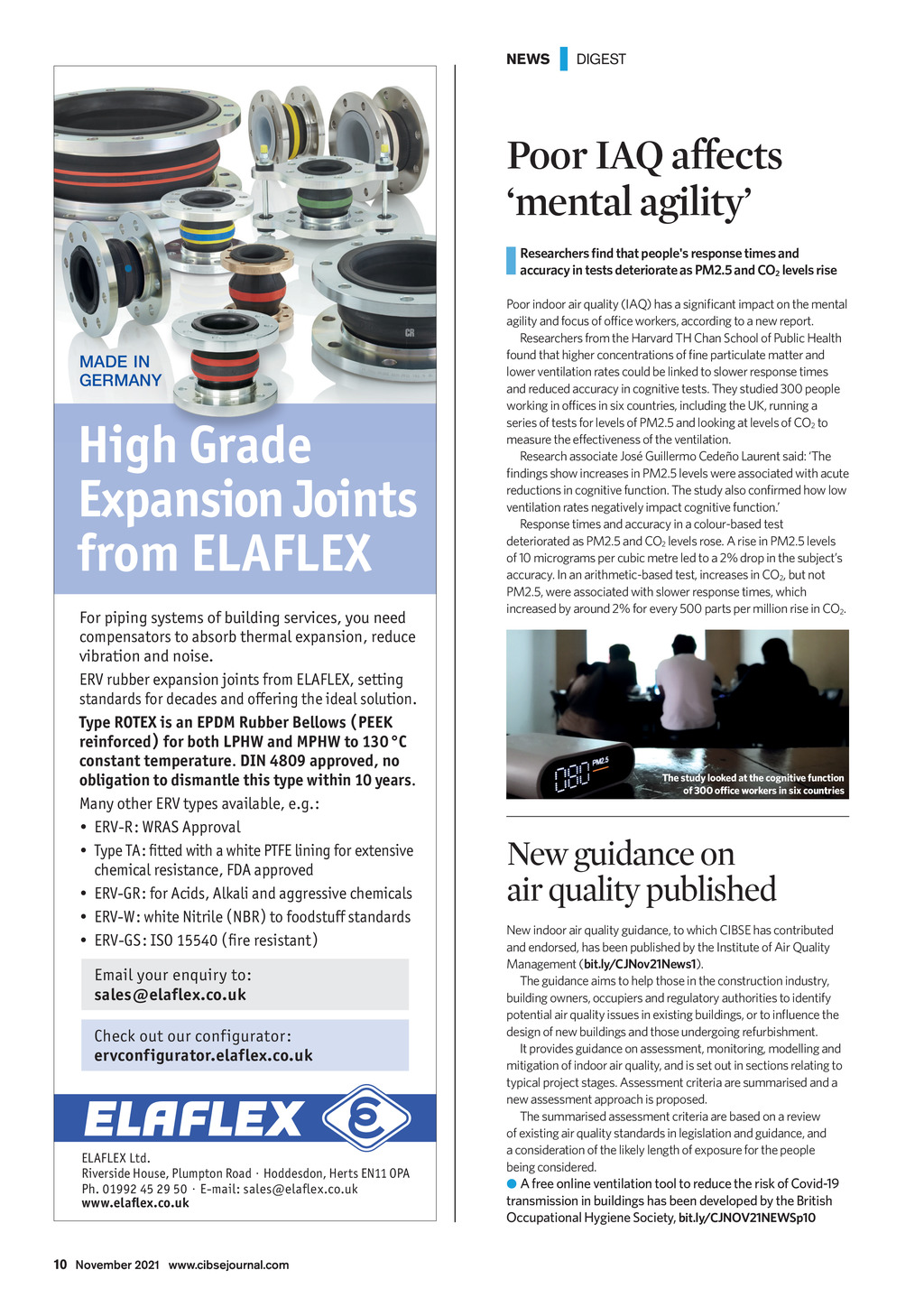 NEWS | DIGEST Poor IAQ affects mental agility MADE IN GERMANY High Grade Expansion Joints from ELAFLEX For piping systems of building services, you need compensators to absorb thermal expansion, reduce vibration and noise. ERV rubber expansion joints from ELAFLEX, setting standards for decades and offering the ideal solution. Type ROTEX is an EPDM Rubber Bellows ( PEEK reinforced ) for both LPHW and MPHW to 130 C constant temperature. DIN 4809 approved, no obligation to dismantle this type within 10 years. Many other ERV types available, e.g.: ERV-R: WRAS Approval Type TA: fitted with a white PTFE lining for extensive chemical resistance, FDA approved ERV-GR: for Acids, Alkali and aggressive chemicals ERV-W: white Nitrile ( NBR ) to foodstuff standards ERV-GS: ISO 15540 ( fire resistant ) to The study looked at the cognitive function New guidance on air quality published Email your enquiry to: sales@elaflex.co.uk Check out our configurator: ervconfigurator.elaflex.co.uk ELAFLEX Ltd. Riverside House, Plumpton Road Hoddesdon, Herts EN11 OPA Ph. 01992 45 29 50 E-mail: sales@elafl ex.co.uk www.elafl ex.co.uk Ad_2020_ERV_90x270_Ltd_EN.indd 1 10 November 2021 www.cibsejournal.com CIBSE Nov21 pp10 News.indd 10 A free online ventilation tool to reduce the risk of Covid-19 transmission in buildings has been developed by the British Occupational Hygiene Society, 20.07.2020 10:43:40 22/10/2021 14:52