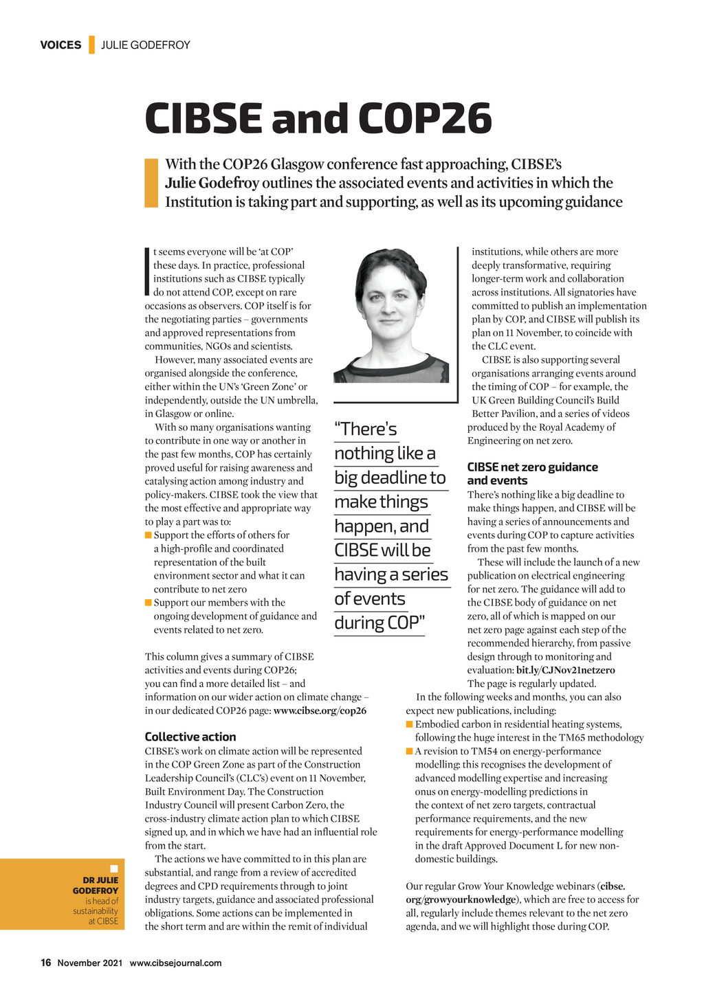 VOICES | JULIE GODEFROY CIBSE and COP26 With the COP26 Glasgow conference fast approaching, CIBSEs Julie Godefroy outlines the associated events and activities in which the Institution is taking part and supporting, as well as its upcoming guidance I t seems everyone will be at COP these days. In practice, professional institutions such as CIBSE typically do not attend COP, except on rare occasions as observers. COP itself is for the negotiating parties governments and approved representations from communities, NGOs and scientists. However, many associated events are organised alongside the conference, either within the UNs Green Zone or independently, outside the UN umbrella, in Glasgow or online. With so many organisations wanting to contribute in one way or another in the past few months, COP has certainly proved useful for raising awareness and catalysing action among industry and policy-makers. CIBSE took the view that the most effective and appropriate way to play a part was to: Support the efforts of others for a high-profile and coordinated representation of the built environment sector and what it can contribute to net zero Support our members with the ongoing development of guidance and events related to net zero. Theres nothing like a big deadline to make things happen, and CIBSE will be having a series of events during COP This column gives a summary of CIBSE activities and events during COP26; you can find a more detailed list and information on our wider action on climate change in our dedicated COP26 page: www.cibse.org/cop26 Collective action DR JULIE GODEFROY is head of sustainability at CIBSE CIBSEs work on climate action will be represented in the COP Green Zone as part of the Construction Leadership Councils (CLCs) event on 11 November, Built Environment Day. The Construction Industry Council will present Carbon Zero, the cross-industry climate action plan to which CIBSE signed up, and in which we have had an influential role from the start. The actions we have committed to in this plan are substantial, and range from a review of accredited degrees and CPD requirements through to joint industry targets, guidance and associated professional obligations. Some actions can be implemented in the short term and are within the remit of individual institutions, while others are more deeply transformative, requiring longer-term work and collaboration across institutions. All signatories have committed to publish an implementation plan by COP, and CIBSE will publish its plan on 11 November, to coincide with the CLC event. CIBSE is also supporting several organisations arranging events around the timing of COP for example, the UK Green Building Councils Build Better Pavilion, and a series of videos produced by the Royal Academy of Engineering on net zero. CIBSE net zero guidance and events Theres nothing like a big deadline to make things happen, and CIBSE will be having a series of announcements and events during COP to capture activities from the past few months. These will include the launch of a new publication on electrical engineering for net zero. The guidance will add to the CIBSE body of guidance on net zero, all of which is mapped on our net zero page against each step of the recommended hierarchy, from passive design through to monitoring and evaluation: bit.ly/CJNov21netzero The page is regularly updated. In the following weeks and months, you can also expect new publications, including: Embodied carbon in residential heating systems, following the huge interest in the TM65 methodology A revision to TM54 on energy-performance modelling: this recognises the development of advanced modelling expertise and increasing onus on energy-modelling predictions in the context of net zero targets, contractual performance requirements, and the new requirements for energy-performance modelling in the draft Approved Document L for new nondomestic buildings. Our regular Grow Your Knowledge webinars (cibse. org/growyourknowledge), which are free to access for all, regularly include themes relevant to the net zero agenda, and we will highlight those during COP. 16 November 2021 www.cibsejournal.com CIBSE Nov21 pp16-17 Julie Godefroy.indd 16 22/10/2021 15:05