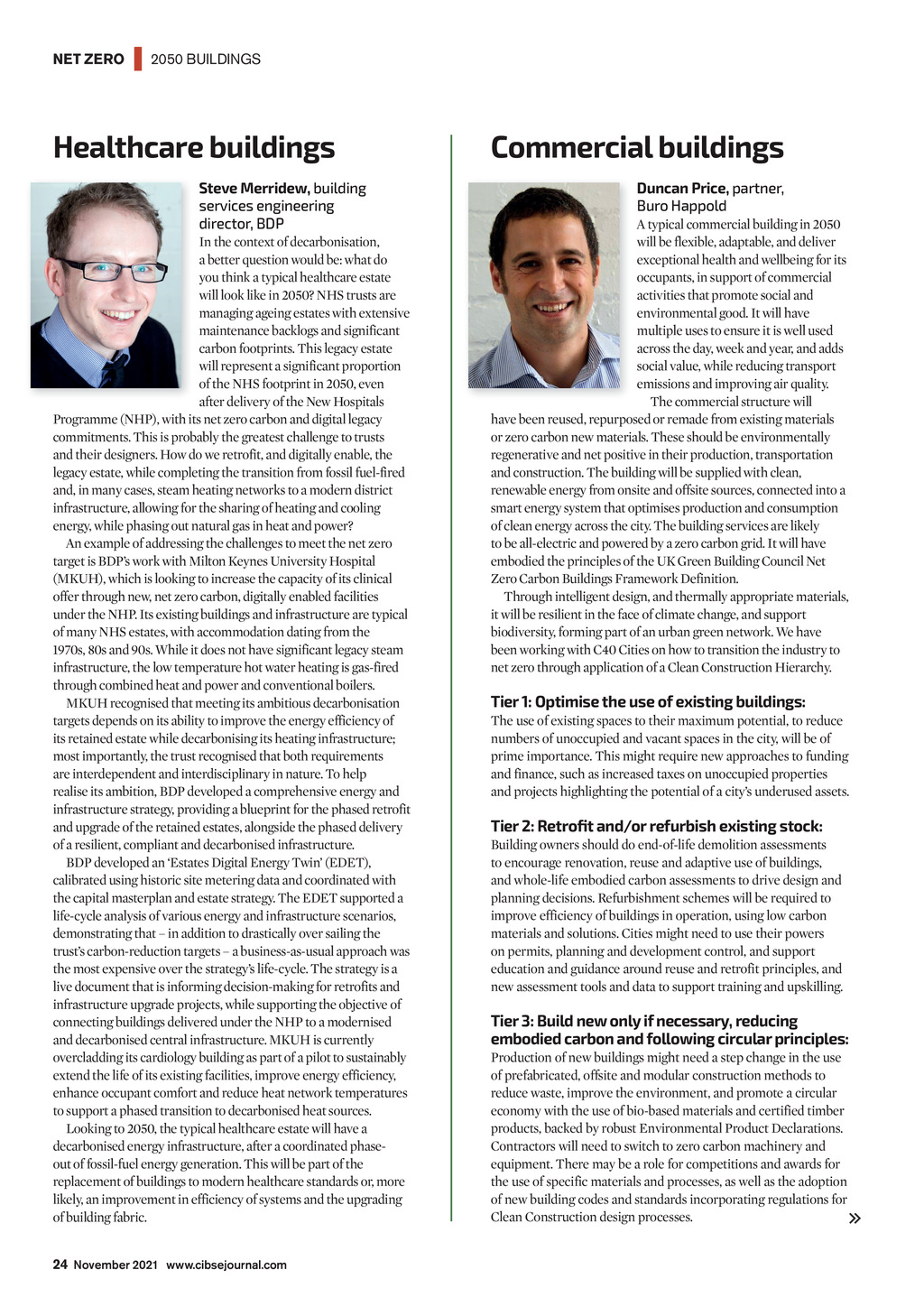 NET ZERO | 2050 BUILDINGS Healthcare buildings Steve Merridew, building services engineering director, BDP In the context of decarbonisation, a better question would be: what do you think a typical healthcare estate will look like in 2050? NHS trusts are managing ageing estates with extensive maintenance backlogs and significant carbon footprints. This legacy estate will represent a significant proportion of the NHS footprint in 2050, even after delivery of the New Hospitals Programme (NHP), with its net zero carbon and digital legacy commitments. This is probably the greatest challenge to trusts and their designers. How do we retrofit, and digitally enable, the legacy estate, while completing the transition from fossil fuel-fired and, in many cases, steam heating networks to a modern district infrastructure, allowing for the sharing of heating and cooling energy, while phasing out natural gas in heat and power? An example of addressing the challenges to meet the net zero target is BDPs work with Milton Keynes University Hospital (MKUH), which is looking to increase the capacity of its clinical offer through new, net zero carbon, digitally enabled facilities under the NHP. Its existing buildings and infrastructure are typical of many NHS estates, with accommodation dating from the 1970s, 80s and 90s. While it does not have significant legacy steam infrastructure, the low temperature hot water heating is gas-fired through combined heat and power and conventional boilers. MKUH recognised that meeting its ambitious decarbonisation targets depends on its ability to improve the energy efficiency of its retained estate while decarbonising its heating infrastructure; most importantly, the trust recognised that both requirements are interdependent and interdisciplinary in nature. To help realise its ambition, BDP developed a comprehensive energy and infrastructure strategy, providing a blueprint for the phased retrofit and upgrade of the retained estates, alongside the phased delivery of a resilient, compliant and decarbonised infrastructure. BDP developed an Estates Digital Energy Twin (EDET), calibrated using historic site metering data and coordinated with the capital masterplan and estate strategy. The EDET supported a life-cycle analysis of various energy and infrastructure scenarios, demonstrating that in addition to drastically over sailing the trusts carbon-reduction targets a business-as-usual approach was the most expensive over the strategys life-cycle. The strategy is a live document that is informing decision-making for retrofits and infrastructure upgrade projects, while supporting the objective of connecting buildings delivered under the NHP to a modernised and decarbonised central infrastructure. MKUH is currently overcladding its cardiology building as part of a pilot to sustainably extend the life of its existing facilities, improve energy efficiency, enhance occupant comfort and reduce heat network temperatures to support a phased transition to decarbonised heat sources. Looking to 2050, the typical healthcare estate will have a decarbonised energy infrastructure, after a coordinated phaseout of fossil-fuel energy generation. This will be part of the replacement of buildings to modern healthcare standards or, more likely, an improvement in efficiency of systems and the upgrading of building fabric. Commercial buildings Duncan Price, partner, Buro Happold A typical commercial building in 2050 will be flexible, adaptable, and deliver exceptional health and wellbeing for its occupants, in support of commercial activities that promote social and environmental good. It will have multiple uses to ensure it is well used across the day, week and year, and adds social value, while reducing transport emissions and improving air quality. The commercial structure will have been reused, repurposed or remade from existing materials or zero carbon new materials. These should be environmentally regenerative and net positive in their production, transportation and construction. The building will be supplied with clean, renewable energy from onsite and offsite sources, connected into a smart energy system that optimises production and consumption of clean energy across the city. The building services are likely to be all-electric and powered by a zero carbon grid. It will have embodied the principles of the UK Green Building Council Net Zero Carbon Buildings Framework Definition. Through intelligent design, and thermally appropriate materials, it will be resilient in the face of climate change, and support biodiversity, forming part of an urban green network. We have been working with C40 Cities on how to transition the industry to net zero through application of a Clean Construction Hierarchy. Tier 1: Optimise the use of existing buildings: The use of existing spaces to their maximum potential, to reduce numbers of unoccupied and vacant spaces in the city, will be of prime importance. This might require new approaches to funding and finance, such as increased taxes on unoccupied properties and projects highlighting the potential of a citys underused assets. Tier 2: Retrofit and/or refurbish existing stock: Building owners should do end-of-life demolition assessments to encourage renovation, reuse and adaptive use of buildings, and whole-life embodied carbon assessments to drive design and planning decisions. Refurbishment schemes will be required to improve efficiency of buildings in operation, using low carbon materials and solutions. Cities might need to use their powers on permits, planning and development control, and support education and guidance around reuse and retrofit principles, and new assessment tools and data to support training and upskilling. Tier 3: Build new only if necessary, reducing embodied carbon and following circular principles: Production of new buildings might need a step change in the use of prefabricated, offsite and modular construction methods to reduce waste, im