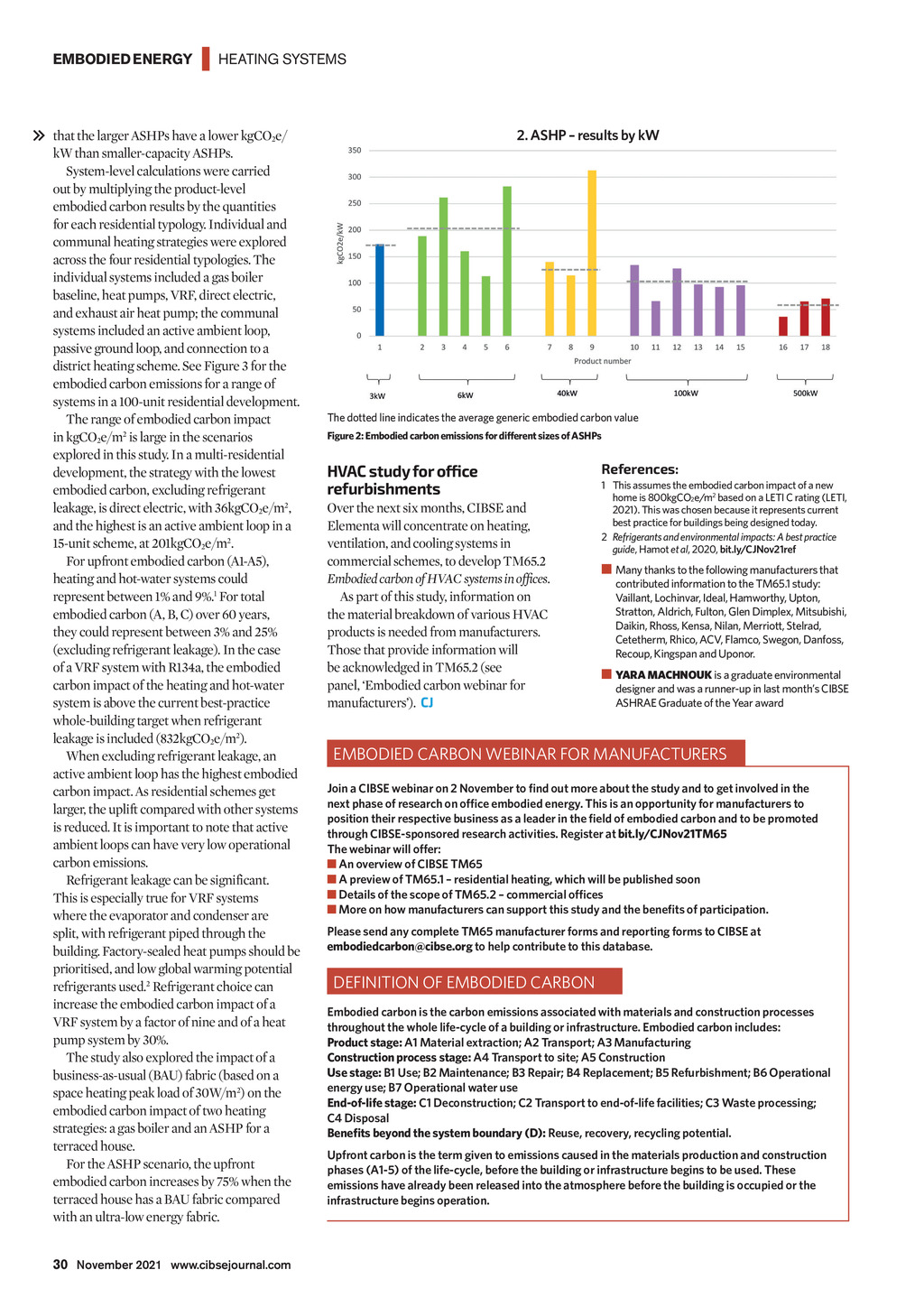 EMBODIED ENERGY | HEATING SYSTEMS that the larger ASHPs have a lower kgCO2e/ kW than smaller-capacity ASHPs. System-level calculations were carried out by multiplying the product-level embodied carbon results by the quantities for each residential typology. Individual and communal heating strategies were explored across the four residential typologies. The individual systems included a gas boiler baseline, heat pumps, VRF, direct electric, and exhaust air heat pump; the communal systems included an active ambient loop, passive ground loop, and connection to a district heating scheme. See Figure 3 for the embodied carbon emissions for a range of systems in a 100-unit residential development. The range of embodied carbon impact in kgCO2e/m2 is large in the scenarios explored in this study. In a multi-residential development, the strategy with the lowest embodied carbon, excluding refrigerant leakage, is direct electric, with 36kgCO2e/m2, and the highest is an active ambient loop in a 15-unit scheme, at 201kgCO2e/m2. For upfront embodied carbon (A1-A5), heating and hot-water systems could represent between 1% and 9%.1 For total embodied carbon (A, B, C) over 60 years, they could represent between 3% and 25% (excluding refrigerant leakage). In the case of a VRF system with R134a, the embodied carbon impact of the heating and hot-water system is above the current best-practice whole-building target when refrigerant leakage is included (832kgCO2e/m2). When excluding refrigerant leakage, an active ambient loop has the highest embodied carbon impact. As residential schemes get larger, the uplift compared with other systems is reduced. It is important to note that active ambient loops can have very low operational carbon emissions. Refrigerant leakage can be significant. This is especially true for VRF systems where the evaporator and condenser are split, with refrigerant piped through the building. Factory-sealed heat pumps should be prioritised, and low global warming potential refrigerants used.2 Refrigerant choice can increase the embodied carbon impact of a VRF system by a factor of nine and of a heat pump system by 30%. The study also explored the impact of a business-as-usual (BAU) fabric (based on a space heating peak load of 30W/m2) on the embodied carbon impact of two heating strategies: a gas boiler and an ASHP for a terraced house. For the ASHP scenario, the upfront embodied carbon increases by 75% when the terraced house has a BAU fabric compared with an ultra-low energy fabric. The dotted line indicates the average generic embodied carbon value Figure 2: Embodied carbon emissions for different sizes of ASHPs References: HVAC study for office refurbishments 1 This assumes the embodied carbon impact of a new home is 800kgCO2e/m2 based on a LETI C rating (LETI, 2021). This was chosen because it represents current best practice for buildings being designed today. 2 Refrigerants and environmental impacts: A best practice guide, Hamot et al, 2020, bit.ly/CJNov21ref Over the next six months, CIBSE and Elementa will concentrate on heating, ventilation, and cooling systems in commercial schemes, to develop TM65.2 . As part of this study, information on the material breakdown of various HVAC products is needed from manufacturers. Those that provide information will be acknowledged in TM65.2 (see panel, Embodied carbon webinar for manufacturers). CJ Many thanks to the following manufacturers that contributed information to the TM65.1 study: Vaillant, Lochinvar, Ideal, Hamworthy, Upton, Stratton, Aldrich, Fulton, Glen Dimplex, Mitsubishi, Daikin, Rhoss, Kensa, Nilan, Merriott, Stelrad, Cetetherm, Rhico, ACV, Flamco, Swegon, Danfoss, Recoup, Kingspan and Uponor. YARA MACHNOUK is a graduate environmental designer and was a runner-up in last months CIBSE ASHRAE Graduate of the Year award EMBODIED CARBON WEBINAR FOR MANUFACTURERS bit.ly/CJNov21TM65 embodiedcarbon@cibse.org DEFINITION OF EMBODIED CARBON Product stage: Construction process stage: Use stage: End-of-life stage: 30 November 2021 www.cibsejournal.com CIBSE Nov21 pp28-30 TM65.indd 30 22/10/2021 15:28