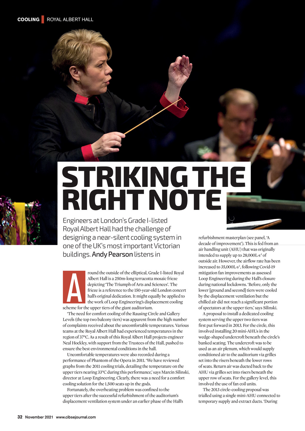 COOLING | ROYAL ALBERT HALL STRIKING THE RIGHT NOTE Engineers at Londons Grade I-listed Royal Albert Hall had the challenge of designing a near-silent cooling system in one of the UKs most important Victorian buildings. Andy Pearson listens in A round the outside of the elliptical, Grade I-listed Royal Albert Hall is a 250m-long terracotta mosaic frieze depicting The Triumph of Arts and Sciences. The frieze is a reference to the 150-year-old London concert halls original dedication. It might equally be applied to the work of Loop Engineerings displacement cooling scheme for the upper tiers of the giant auditorium. The need for comfort cooling of the Rausing Circle and Gallery Levels (the top two balcony tiers) was apparent from the high number of complaints received about the uncomfortable temperatures. Various teams at the Royal Albert Hall had experienced temperatures in the region of 37C. As a result of this Royal Albert Hall projects engineer Neal Hockley, with support from the Trustees of the Hall, pushed to ensure the best environmental conditions in the hall. Uncomfortable temperatures were also recorded during a performance of Phantom of the Opera in 2011. We have reviewed graphs from the 2011 cooling trials, detailing the temperature on the upper tiers nearing 33C during this performance, says Marcin Silinski, director at Loop Engineering. Clearly, there was a need for a comfort cooling solution for the 1,500 seats up in the gods. Fortunately, the overheating problem was confined to the upper tiers after the successful refurbishment of the auditoriums displacement ventilation system under an earlier phase of the Halls refurbishment masterplan (see panel, A decade of improvement). This is fed from an air handling unit (AHU) that was originally intended to supply up to 28,000L.s-1 of outside air. However, the airflow rate has been increased to 35,000L.s-1, following Covid-19 mitigation fan improvements as assessed Loop Engineering during the Halls closure during national lockdowns. Before, only the lower [ground and second] tiers were cooled by the displacement ventilation but the chilled air did not reach a significant portion of spectators at the upper tiers, says Silinski. A proposal to install a dedicated cooling system serving the upper two tiers was first put forward in 2013. For the circle, this involved installing 20 mini-AHUs in the wedge-shaped undercroft beneath the circles banked seating. The undercroft was to be used as an air plenum, which would supply conditioned air to the auditorium via grilles set into the risers beneath the lower rows of seats. Return air was ducted back to the AHU via grilles set into risers beneath the upper row of seats. For the gallery level, this involved the use of fan coil units. The 2013 circle-cooling proposal was trialled using a single mini-AHU connected to temporary supply and extract ducts. During 32 November 2021 www.cibsejournal.com CIBSE Nov21 pp32-34, 36 Royal Albert Hall.indd 32 22/10/2021 15:30