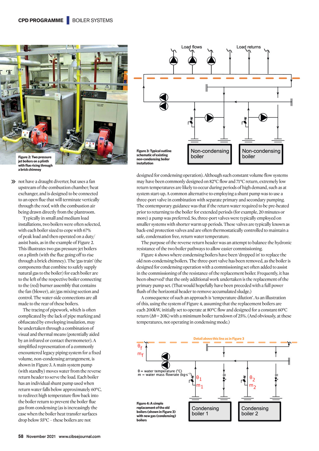 CPD PROGRAMME | BOILER SYSTEMS Figure 2: Two pressure jet boilers on a plinth Figure 3: Typical outline schematic of existing non-condensing boiler installation a brick chimney not have a draught diverter, but uses a fan upstream of the combustion chamber/heat exchanger, and is designed to be connected to an open flue that will terminate vertically through the roof, with the combustion air being drawn directly from the plantroom. Typically in small and medium load installations, two boilers were often selected, with each boiler sized to cope with 67% of peak load and then operated on a duty/ assist basis, as in the example of Figure 2. This illustrates two gas pressure jet boilers on a plinth (with the flue going off to rise through a brick chimney). The gas train (the components that combine to safely supply natural gas to the boiler) for each boiler are to the left of the respective boiler connecting to the (red) burner assembly that contains the fan (blower), air/gas mixing section and control. The water-side connections are all made to the rear of these boilers. The tracing of pipework, which is often complicated by the lack of pipe marking and obfuscated by enveloping insulation, may be undertaken through a combination of visual and thermal means (potentially aided by an infrared or contact thermometer). A simplified representation of a commonly encountered legacy piping system for a fixed volume, non-condensing arrangement, is shown in Figure 3. A main system pump (with standby) moves water from the reverse return header to serve the load. Each boiler has an individual shunt pump used when return water falls below approximately 60C, to redirect high temperature flow back into the boiler return to prevent the boiler flue gas from condensing (as is increasingly the case when the boiler heat transfer surfaces drop below 55C these boilers are not designed for condensing operation). Although such constant volume flow systems may have been commonly designed on 82C flow and 71C return, extremely low return temperatures are likely to occur during periods of high demand, such as at system start-up. A common alternative to employing a shunt pump was to use a three-port valve in combination with separate primary and secondary pumping. The contemporary guidance was that if the return water required to be pre-heated prior to returning to the boiler for extended periods (for example, 20 minutes or more) a pump was preferred. So, three-port valves were typically employed on smaller systems with shorter warm up periods. These valves are typically known as back-end protection valves and are often thermostatically controlled to maintain a safe, condensation free, return water temperature. The purpose of the reverse return header was an attempt to balance the hydronic resistance of the two boiler pathways to allow easier commissioning. Figure 4 shows where condensing boilers have been dropped in to replace the old non-condensing boilers. The three-port valve has been removed, as the boiler is designed for condensing operation with a commissioning set often added to assist in the commissioning of the resistance of the replacement boiler. Frequently, it has been observed1 that the only additional work undertaken is the replacement of the primary pump set. (That would hopefully have been preceded with a full power flush of the horizontal header to remove accumulated sludge.) A consequence of such an approach is temperature dilution. As an illustration of this, using the system of Figure 4, assuming that the replacement boilers are each 200kW, initially set to operate at 80C flow and designed for a constant 60C return ( = 20K) with a minimum boiler turndown of 25%. (And obviously, at these temperatures, not operating in condensing mode.) Detail above this line as in Figure 3 Figure 4: A simple replacement of the old boilers (shown in Figure 3) with new gas (condensing) boilers 58 November 2021 www.cibsejournal.com CIBSE Nov21 pp57-60 CPD 187.indd 58 22/10/2021 16:36