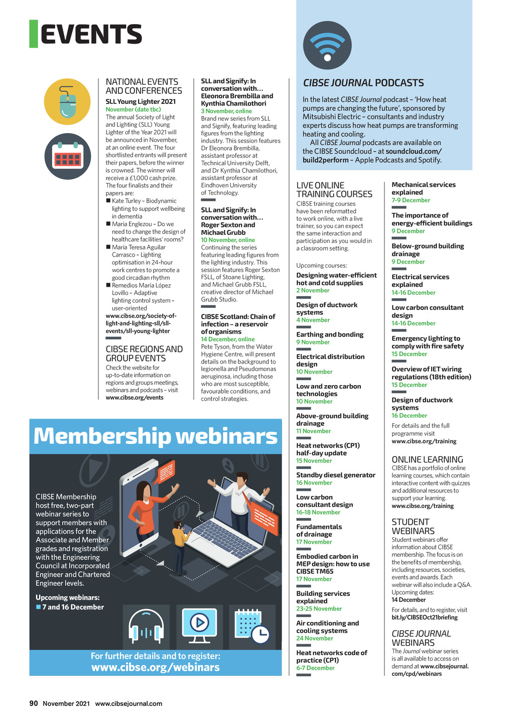 EVENTS NATIONAL EVENTS AND CONFERENCES SLL Young Lighter 2021 November (date tbc) The annual Society of Light and Lighting (SLL) Young Lighter of the Year 2021 will be announced in November, at an online event. The four shortlisted entrants will present their papers, before the winner is crowned. The winner will receive a 1,000 cash prize. T ir papers are: Kate Turley Biodynamic lighting to support wellbeing in dementia Maria Englezou Do we need to change the design of healthcare facilities rooms? Mara Teresa Aguilar Carrasco Lighting optimisation in 24-hour work centres to promote a good circadian rhythm Remedios Mara Lpez Lovillo Adaptive lighting control system user-oriented www.cibse.org/society-oflight-and-lighting-sll/sllevents/sll-young-lighter CIBSE REGIONS AND GROUP EVENTS Check the website for up-to-date information on regions and groups meetings, webinars and podcasts visit www.cibse.org/events SLL and Signify: In conversation with Eleonora Brembilla and Kynthia Chamilothori 3 November, online Brand new series from SLL and Signify, featuring leading industry. This session features Dr Eleonora Brembilla, assistant professor at Technical University Delft, and Dr Kynthia Chamilothori, assistant professor at Eindhoven University of Technology. SLL and Signify: In conversation with Roger Sexton and Michael Grubb 10 November, online Continuing the series the lighting industry. This session features Roger Sexton FSLL, of Stoane Lighting, and Michael Grubb FSLL, creative director of Michael Grubb Studio. CIBSE Scotland: Chain of infection a reservoir of organisms 14 December, online Pete Tyson, from the Water Hygiene Centre, will present details on the background to legionella and Pseudomonas aeruginosa, including those who are most susceptible, favourable conditions, and control strategies. Membership webinars CIBSE JOURNAL PODCASTS In the latest CIBSE Journal podcast How heat pumps are changing the future, sponsored by Mitsubishi Electric consultants and industry experts discuss how heat pumps are transforming heating and cooling. All CIBSE Journal podcasts are available on the CIBSE Soundcloud at soundcloud.com/ build2perform Apple Podcasts and Spotify. LIVE ONLINE TRAINING COURSES CIBSE training courses have been reformatted to work online, with a live trainer, so you can expect the same interaction and participation as you would in a classroom setting. Upcoming courses: Designing water-efficient hot and cold supplies 2 November Design of ductwork systems 4 November Earthing and bonding 9 November Below-ground building drainage 9 December Electrical services explained 14-16 December Low carbon consultant design 14-16 December Emergency lighting to comply with fire safety 15 December Above-ground building drainage 16 December 10 November 11 November Heat networks (CP1) half-day update Overview of IET wiring regulations (18th edition) Design of ductwork systems For details and the full programme visit www.cibse.org/training ONLINE LEARNING Low carbon consultant design CIBSE has a portfolio of online learning courses, which contain interactive content with quizzes and additional resources to support your learning. www.cibse.org/training Fundamentals of drainage STUDENT WEBINARS 16-18 November 17 November Embodied carbon in MEP design: how to use CIBSE TM65 17 November Building services explained 23-25 November Air conditioning and cooling systems 24 November www.cibse.org/webinars 9 December Low and zero carbon technologies 10 November 16 November For further details and to register: The importance of energy-efficient buildings 15 December Standby diesel generator Upcoming webinars: 7 and 16 December 7-9 December Electrical distribution design 15 November CIBSE Membership host free, two-part webinar series to support members with applications for the Associate and Member grades and registration with the Engineering Council at Incorporated Engineer and Chartered Engineer levels. Mechanical services explained Heat networks code of practice (CP1) 6-7 December Student webinars offer information about CIBSE membership. The focus is on including resources, societies, events and awards. Each webinar will also include a Q&A. Upcoming dates: 14 December For details, and to register, visit CIBSE JOURNAL WEBINARS The Journal webinar series is all available to access on demand at www.cibsejournal. com/cpd/webinars 90 November 2021 www.cibsejournal.com CIBSE Nov21 pp90 Events.indd 90 22/10/2021 15:23