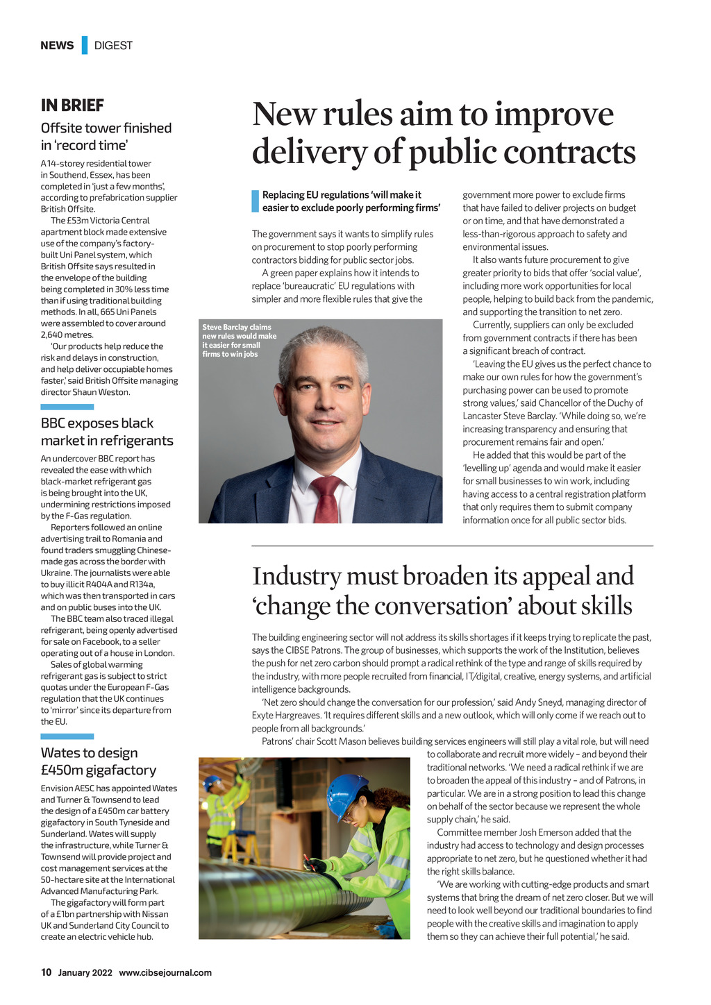 NEWS | DIGEST New rules aim to improve delivery of public contracts IN BRIEF Offsite tower finished in record time A 14-storey residential tower in Southend, Essex, has been completed in just a few months, according to prefabrication supplier British Offsite. The 53m Victoria Central apartment block made extensive use of the companys factorybuilt Uni Panel system, which British Offsite says resulted in the envelope of the building being completed in 30% less time than if using traditional building methods. In all, 665 Uni Panels were assembled to cover around 2,640 metres. Our products help reduce the risk and delays in construction, and help deliver occupiable homes faster, said British Offsite managing director Shaun Weston. Replacing EU regulations will make it easier to exclude poorly performing firms The government says it wants to simplify rules on procurement to stop poorly performing contractors bidding for public sector jobs. A green paper explains how it intends to replace bureaucratic EU regulations with simpler and more flexible rules that give the Steve Barclay claims new rules would make it easier for small firms to win jobs BBC exposes black market in refrigerants An undercover BBC report has revealed the ease with which black-market refrigerant gas is being brought into the UK, undermining restrictions imposed by the F-Gas regulation. Reporters followed an online advertising trail to Romania and found traders smuggling Chinesemade gas across the border with Ukraine. The journalists were able to buy illicit R404A and R134a, which was then transported in cars and on public buses into the UK. The BBC team also traced illegal refrigerant, being openly advertised for sale on Facebook, to a seller operating out of a house in London. Sales of global warming refrigerant gas is subject to strict quotas under the European F-Gas regulation that the UK continues to mirror since its departure from the EU. Wates to design 450m gigafactory Envision AESC has appointed Wates and Turner & Townsend to lead the design of a 450m car battery gigafactory in South Tyneside and Sunderland. Wates will supply the infrastructure, while Turner & Townsend will provide project and cost management services at the 50-hectare site at the International Advanced Manufacturing Park. The gigafactory will form part of a 1bn partnership with Nissan UK and Sunderland City Council to create an electric vehicle hub. government more power to exclude firms that have failed to deliver projects on budget or on time, and that have demonstrated a less-than-rigorous approach to safety and environmental issues. It also wants future procurement to give greater priority to bids that offer social value, including more work opportunities for local people, helping to build back from the pandemic, and supporting the transition to net zero. Currently, suppliers can only be excluded from government contracts if there has been a significant breach of contract. Leaving the EU gives us the perfect chance to make our own rules for how the governments purchasing power can be used to promote strong values, said Chancellor of the Duchy of Lancaster Steve Barclay. While doing so, were increasing transparency and ensuring that procurement remains fair and open. He added that this would be part of the levelling up agenda and would make it easier for small businesses to win work, including having access to a central registration platform that only requires them to submit company information once for all public sector bids. Industry must broaden its appeal and change the conversation about skills The building engineering sector will not address its skills shortages if it keeps trying to replicate the past, says the CIBSE Patrons. The group of businesses, which supports the work of the Institution, believes the push for net zero carbon should prompt a radical rethink of the type and range of skills required by the industry, with more people recruited from financial, IT/digital, creative, energy systems, and artificial intelligence backgrounds. Net zero should change the conversation for our profession, said Andy Sneyd, managing director of Exyte Hargreaves. It requires different skills and a new outlook, which will only come if we reach out to people from all backgrounds. Patrons chair Scott Mason believes building services engineers will still play a vital role, but will need to collaborate and recruit more widely and beyond their traditional networks. We need a radical rethink if we are to broaden the appeal of this industry and of Patrons, in particular. We are in a strong position to lead this change on behalf of the sector because we represent the whole supply chain, he said. Committee member Josh Emerson added that the industry had access to technology and design processes appropriate to net zero, but he questioned whether it had the right skills balance. We are working with cutting-edge products and smart systems that bring the dream of net zero closer. But we will need to look well beyond our traditional boundaries to find people with the creative skills and imagination to apply them so they can achieve their full potential, he said. 10 January 2022 www.cibsejournal.com CIBSE Jan 22 pp10 News.indd 10 23/12/2021 12:27