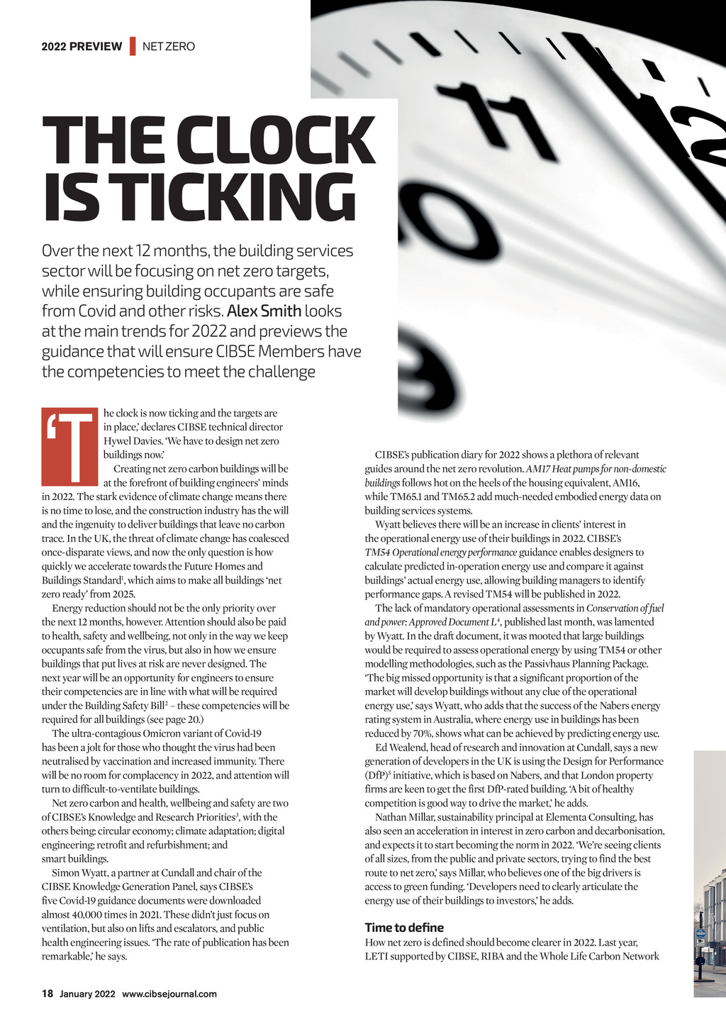 2022 PREVIEW | NET ZERO THE CLOCK IS TICKING Over the next 12 months, the building services sector will be focusing on net zero targets, while ensuring building occupants are safe from Covid and other risks. Alex Smith looks at the main trends for 2022 and previews the guidance that will ensure CIBSE Members have the competencies to meet the challenge T he clock is now ticking and the targets are in place, declares CIBSE technical director Hywel Davies. We have to design net zero buildings now. Creating net zero carbon buildings will be at the forefront of building engineers minds in 2022. The stark evidence of climate change means there is no time to lose, and the construction industry has the will and the ingenuity to deliver buildings that leave no carbon trace. In the UK, the threat of climate change has coalesced once-disparate views, and now the only question is how quickly we accelerate towards the Future Homes and Buildings Standard1, which aims to make all buildings net zero ready from 2025. Energy reduction should not be the only priority over the next 12 months, however. Attention should also be paid to health, safety and wellbeing, not only in the way we keep occupants safe from the virus, but also in how we ensure buildings that put lives at risk are never designed. The next year will be an opportunity for engineers to ensure their competencies are in line with what will be required under the Building Safety Bill2 these competencies will be required for all buildings (see page 20.) The ultra-contagious Omicron variant of Covid-19 has been a jolt for those who thought the virus had been neutralised by vaccination and increased immunity. There will be no room for complacency in 2022, and attention will turn to difficult-to-ventilate buildings. Net zero carbon and health, wellbeing and safety are two of CIBSEs Knowledge and Research Priorities3, with the others being: circular economy; climate adaptation; digital engineering; retrofit and refurbishment; and smart buildings. Simon Wyatt, a partner at Cundall and chair of the CIBSE Knowledge Generation Panel, says CIBSEs five Covid-19 guidance documents were downloaded almost 40,000 times in 2021. These didnt just focus on ventilation, but also on lifts and escalators, and public health engineering issues. The rate of publication has been remarkable, he says. CIBSEs publication diary for 2022 shows a plethora of relevant guides around the net zero revolution. AM17 Heat pumps for non-domestic buildings follows hot on the heels of the housing equivalent, AM16, while TM65.1 and TM65.2 add much-needed embodied energy data on building services systems. Wyatt believes there will be an increase in clients interest in the operational energy use of their buildings in 2022. CIBSEs TM54 Operational energy performance guidance enables designers to calculate predicted in-operation energy use and compare it against buildings actual energy use, allowing building managers to identify performance gaps. A revised TM54 will be published in 2022. The lack of mandatory operational assessments in Conservation of fuel and power: Approved Document L4, published last month, was lamented by Wyatt. In the draft document, it was mooted that large buildings would be required to assess operational energy by using TM54 or other modelling methodologies, such as the Passivhaus Planning Package. The big missed opportunity is that a significant proportion of the market will develop buildings without any clue of the operational energy use, says Wyatt, who adds that the success of the Nabers energy rating system in Australia, where energy use in buildings has been reduced by 70%, shows what can be achieved by predicting energy use. Ed Wealend, head of research and innovation at Cundall, says a new generation of developers in the UK is using the Design for Performance (DfP)5 initiative, which is based on Nabers, and that London property firms are keen to get the first DfP-rated building. A bit of healthy competition is good way to drive the market, he adds. Nathan Millar, sustainability principal at Elementa Consulting, has also seen an acceleration in interest in zero carbon and decarbonisation, and expects it to start becoming the norm in 2022. Were seeing clients of all sizes, from the public and private sectors, trying to find the best route to net zero, says Millar, who believes one of the big drivers is access to green funding. Developers need to clearly articulate the energy use of their buildings to investors, he adds. Time to define How net zero is defined should become clearer in 2022. Last year, LETI supported by CIBSE, RIBA and the Whole Life Carbon Network 18 January 2022 www.cibsejournal.com CIBSE Jan 22 pp18-20 2022 preview.indd 18 23/12/2021 15:44