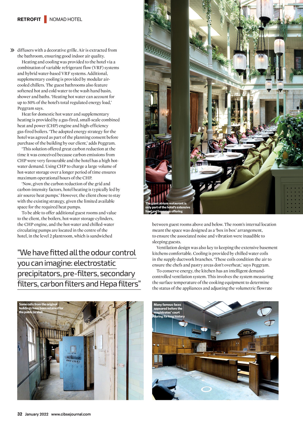 RETROFIT | NOMAD HOTEL diffusers with a decorative grille. Air is extracted from the bathroom, ensuring good indoor air quality. Heating and cooling was provided to the hotel via a combination of variable refrigerant flow (VRF) systems and hybrid water-based VRF systems. Additional, supplementary cooling is provided by modular aircooled chillers. The guest bathrooms also feature softened hot and cold water to the wash hand basin, shower and baths. Heating hot water can account for up to 50% of the hotels total regulated energy load, Peggram says. Heat for domestic hot water and supplementary heating is provided by a gas-fired, small-scale combined heat and power (CHP) engine and high-efficiency gas-fired boilers. The adopted energy strategy for the hotel was agreed as part of the planning consent before purchase of the building by our client, adds Peggram. This solution offered great carbon reduction at the time it was conceived because carbon emissions from CHP were very favourable and the hotel has a high hotwater demand. Using CHP to charge a large volume of hot-water storage over a longer period of time ensures maximum operational hours of the CHP. Now, given the carbon reduction of the grid and carbon-intensity factors, hotel heating is typically led by air source heat pumps. However, the client chose to stay with the existing strategy, given the limited available space for the required heat pumps. To be able to offer additional guest rooms and value to the client, the boilers, hot-water storage cylinders, the CHP engine, and the hot-water and chilled-water circulating pumps are located in the centre of the hotel, in the level 2 plantroom, which is sandwiched We have fitted all the odour control you can imagine: electrostatic precipitators, pre-filters, secondary filters, carbon filters and Hepa filters Some cells from the original buildings have been retained for the public to visit The giant atrium restaurant is only part of the hotels extensive food and beverage offering between guest rooms above and below. The rooms internal location meant the space was designed as a box in box arrangement, to ensure the associated noise and vibration were inaudible to sleeping guests. Ventilation design was also key to keeping the extensive basement kitchens comfortable. Cooling is provided by chilled water coils in the supply ductwork branches. These coils condition the air to ensure the chefs and pastry areas dont overheat, says Peggram. To conserve energy, the kitchen has an intelligent demandcontrolled ventilation system. This involves the system measuring the surface temperature of the cooking equipment to determine the status of the appliances and adjusting the volumetric flowrate Many famous faces appeared before the magistrates court during its long history 32 January 2022 www.cibsejournal.com CIBSE Jan 22 pp30-33 NoMad Hotel.indd 32 23/12/2021 13:52