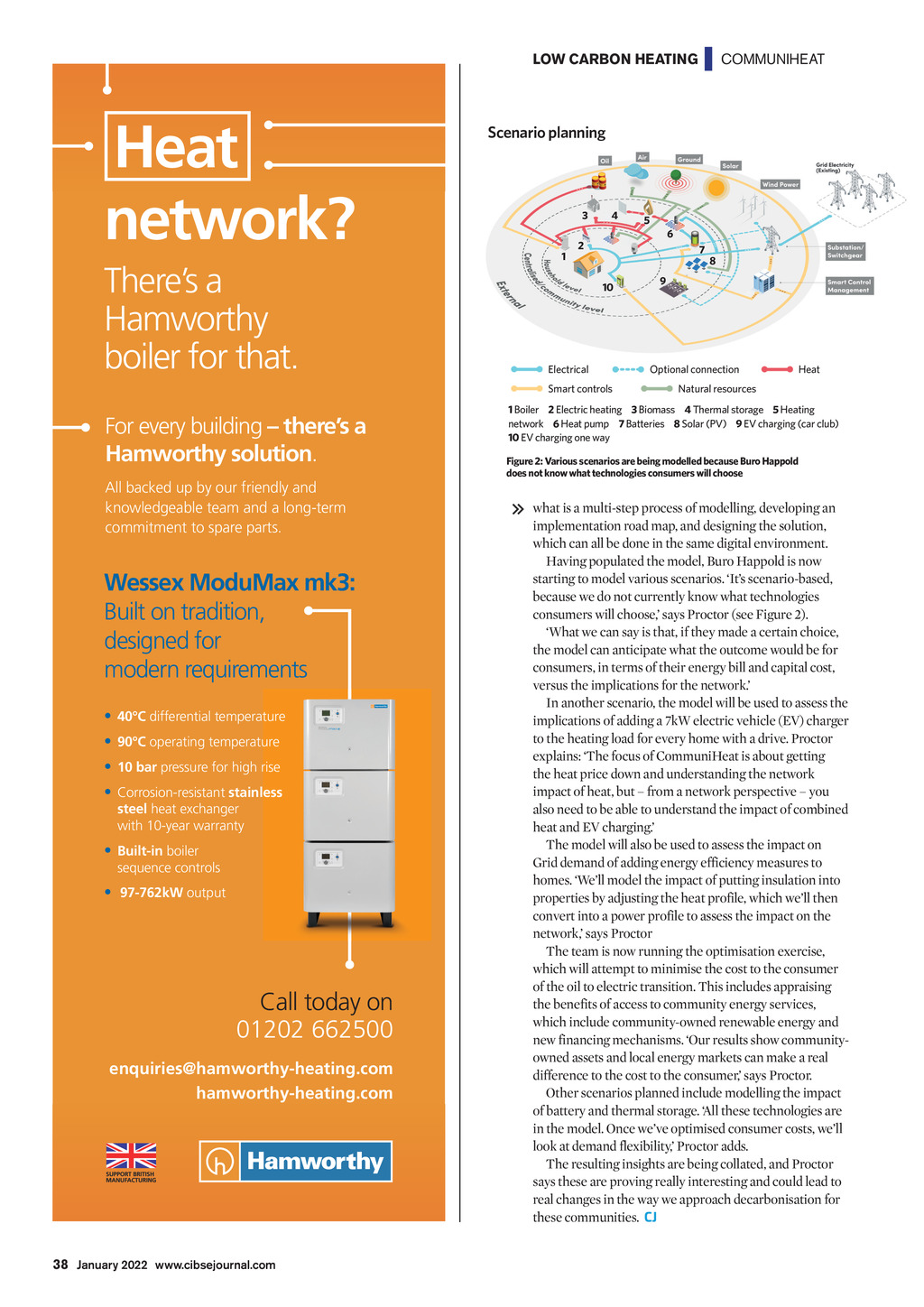 LOW CARBON HEATING Heat network? Theres a Hamworthy boiler for that. Scenario planning 3 1 4 All backed up by our friendly and knowledgeable team and a long-term commitment to spare parts. Wessex ModuMax mk3: Built on tradition, designed for modern requirements 40C differential temperature 90C operating temperature 10 bar pressure for high rise Corrosion-resistant stainless steel heat exchanger with 10-year warranty Built-in boiler sequence controls 97-762kW output Call today on 01202 662500 enquiries@hamworthy-heating.com hamworthy-heating.com 5 6 2 7 10 Electrical Smart controls For every building theres a Hamworthy solution. | COMMUNIHEAT 8 9 Optional connection Heat Natural resources 1 Boiler 2 Electric heating 3 Biomass 4 Thermal storage 5 Heating network 6 Heat pump 7 Batteries 8 Solar (PV) 9 EV charging (car club) 10 EV charging one way Figure 2: Various scenarios are being modelled because Buro Happold does not know what technologies consumers will choose what is a multi-step process of modelling, developing an implementation road map, and designing the solution, which can all be done in the same digital environment. Having populated the model, Buro Happold is now starting to model various scenarios. Its scenario-based, because we do not currently know what technologies consumers will choose, says Proctor (see Figure 2). What we can say is that, if they made a certain choice, the model can anticipate what the outcome would be for consumers, in terms of their energy bill and capital cost, versus the implications for the network. In another scenario, the model will be used to assess the implications of adding a 7kW electric vehicle (EV) charger to the heating load for every home with a drive. Proctor explains: The focus of CommuniHeat is about getting the heat price down and understanding the network impact of heat, but from a network perspective you also need to be able to understand the impact of combined heat and EV charging. The model will also be used to assess the impact on Grid demand of adding energy efficiency measures to homes. Well model the impact of putting insulation into properties by adjusting the heat profile, which well then convert into a power profile to assess the impact on the network, says Proctor The team is now running the optimisation exercise, which will attempt to minimise the cost to the consumer of the oil to electric transition. This includes appraising the benefits of access to community energy services, which include community-owned renewable energy and new financing mechanisms. Our results show communityowned assets and local energy markets can make a real difference to the cost to the consumer, says Proctor. Other scenarios planned include modelling the impact of battery and thermal storage. All these technologies are in the model. Once weve optimised consumer costs, well look at demand flexibility, Proctor adds. The resulting insights are being collated, and Proctor says these are proving really interesting and could lead to real changes in the way we approach decarbonisation for these communities. CJ 38 January 2022 www.cibsejournal.com CIBSE Jan 22 pp36-38 Community heat.indd 38 23/12/2021 13:56